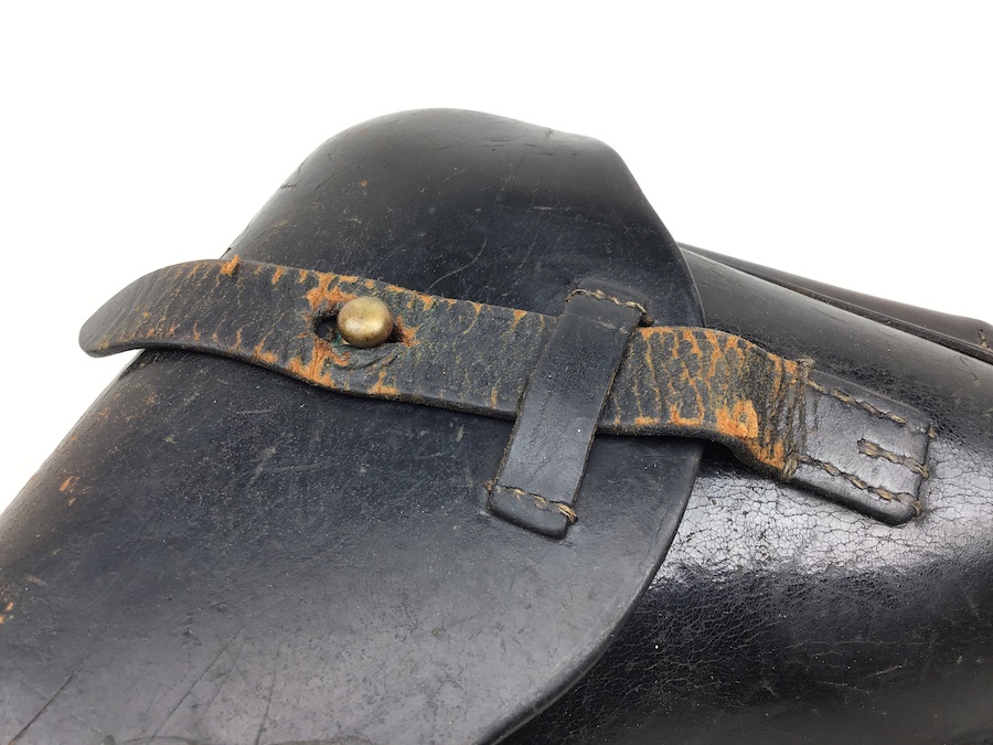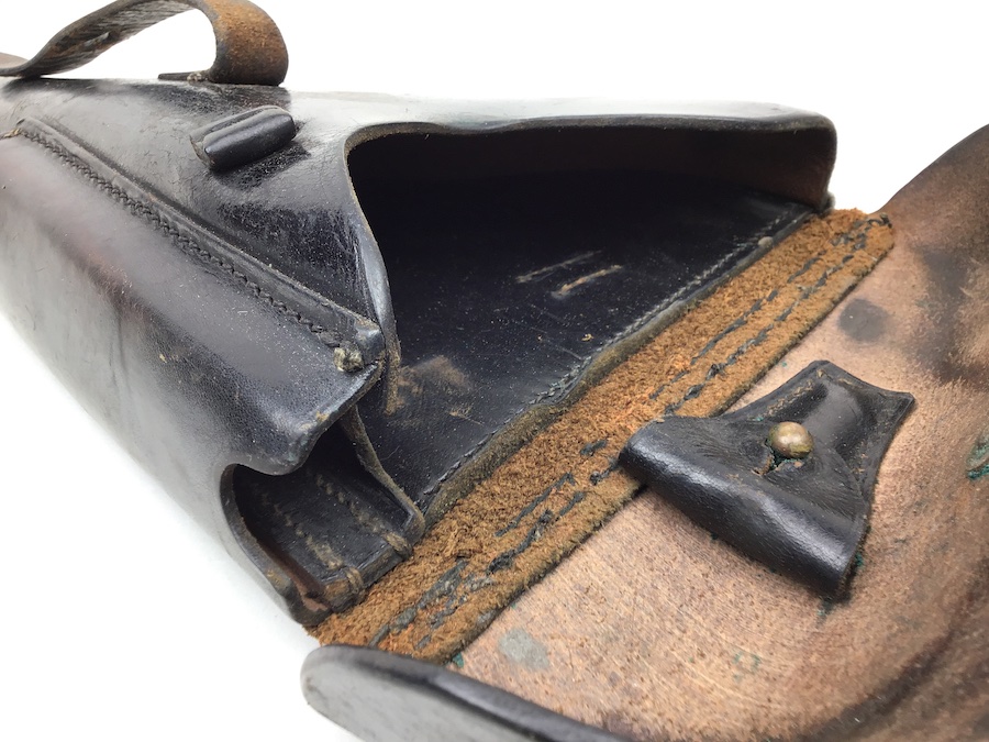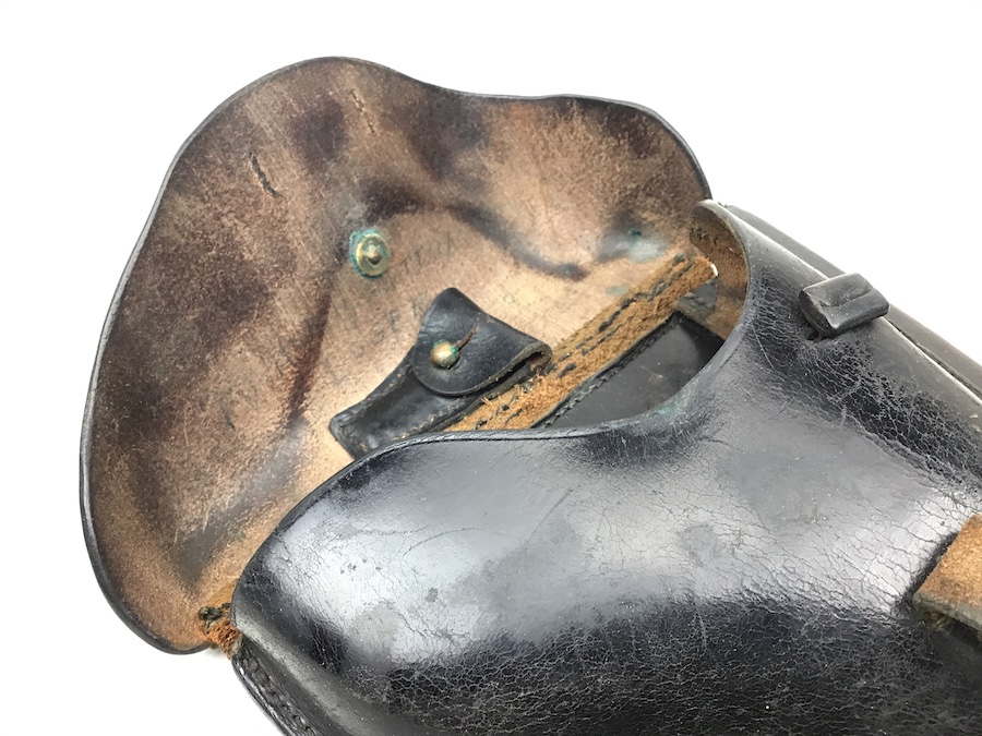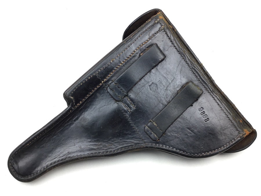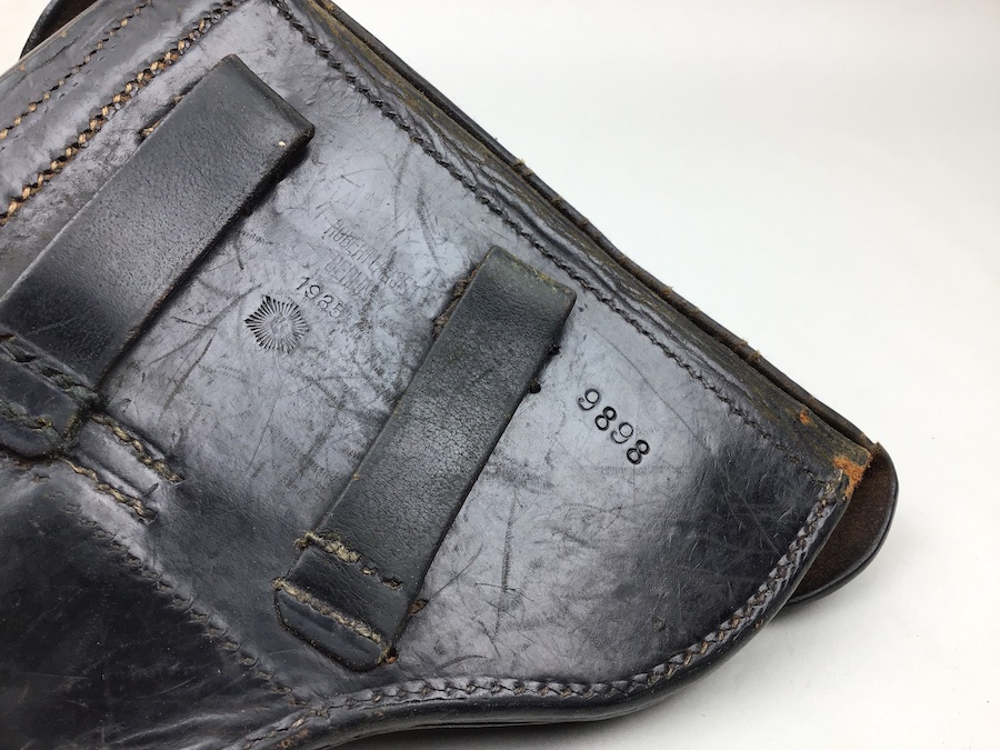 6/9/20 – This is an original 1935 dated Police Luger holster. The back of the holster is dated, maker stamped, and has a sunburst star with a K inside. Next to the right belt loop is a “9898” stamp, perhaps a unit marking. The black leather is clean and completely in tact. There is no major wrinkling or cracking on the exterior leather, however, there is typical softening of the closure strap. Some wear on the top flap and the mag pouch. The stitching is all tight, however, the closer lid may have been restitched sometime in the past. Very nice condition overall.