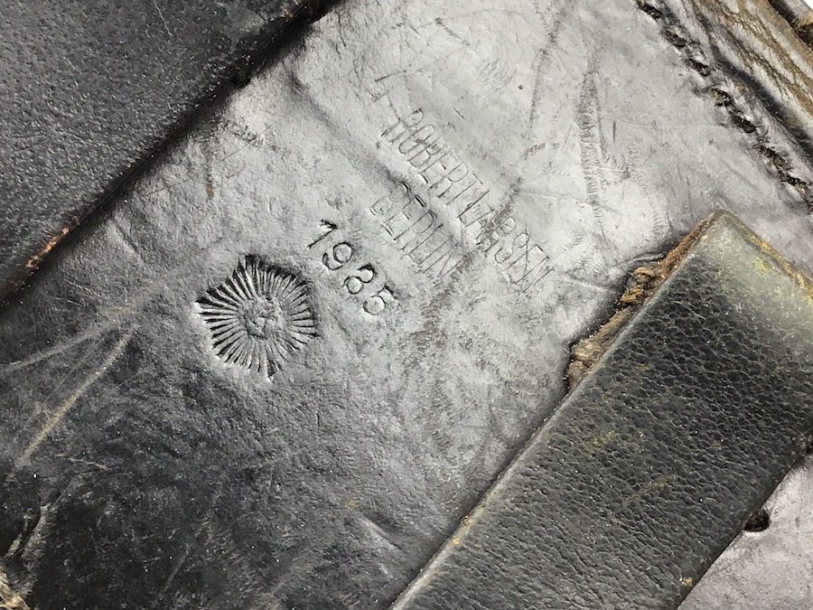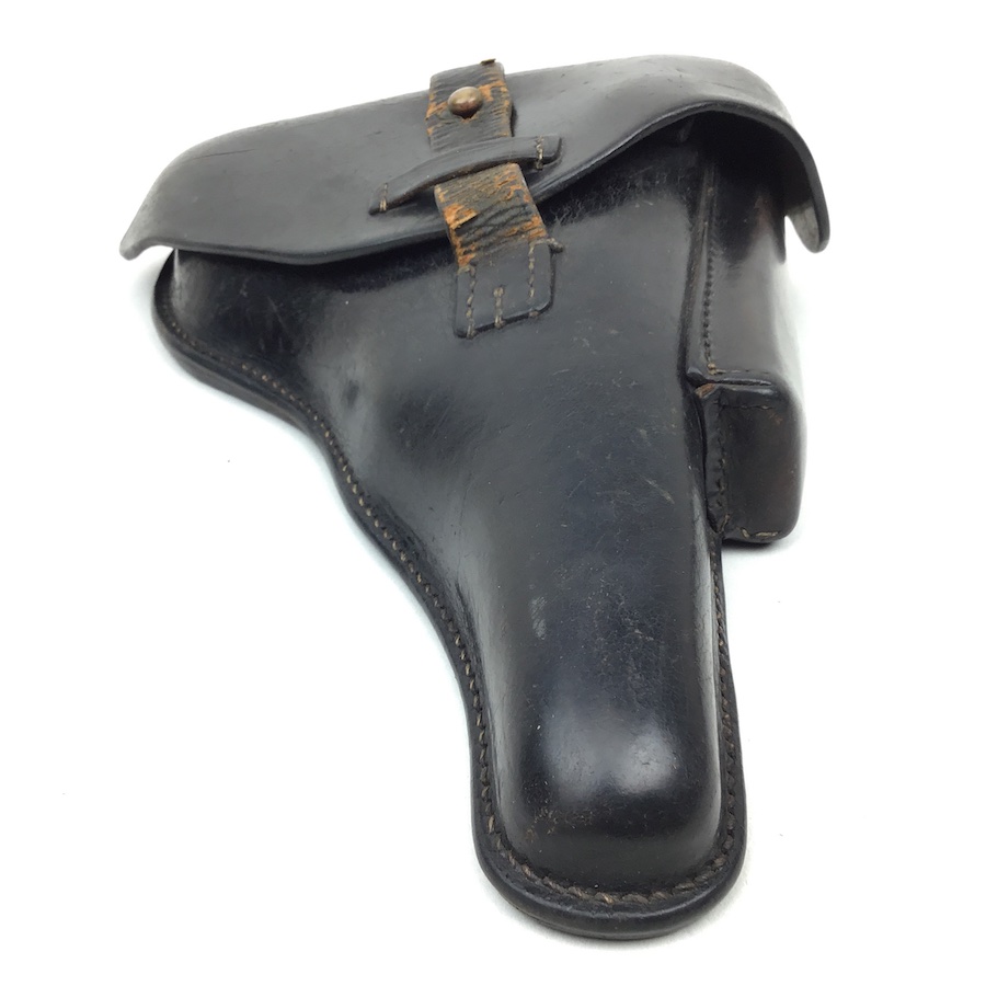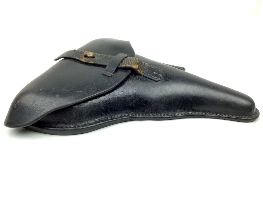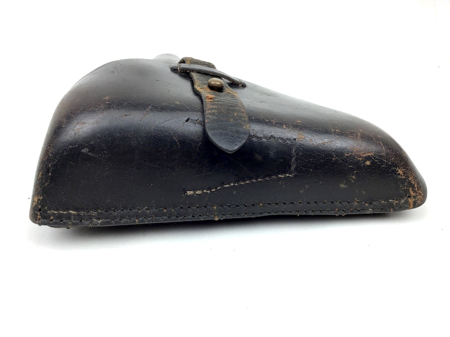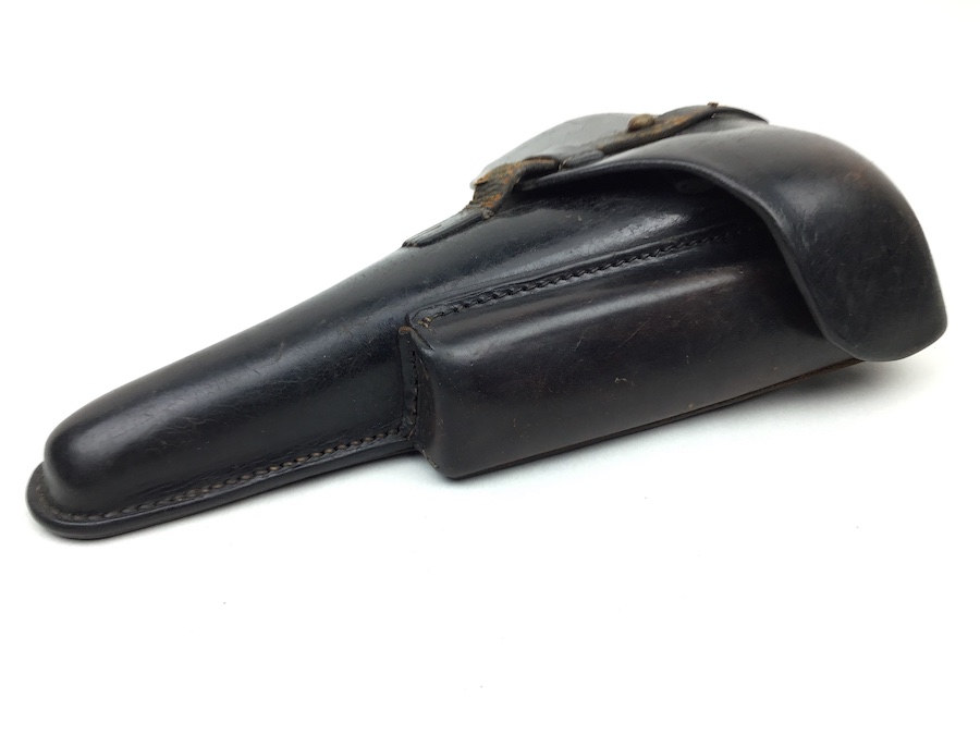 6/9/20 – This is an original 1935 dated Police Luger holster. The back of the holster is dated, maker stamped, and has a sunburst star with a K inside. Next to the right belt loop is a “9898” stamp, perhaps a unit marking. The black leather is clean and completely in tact. There is no major wrinkling or cracking on the exterior leather, however, there is typical softening of the closure strap. Some wear on the top flap and the mag pouch. The stitching is all tight, however, the closer lid may have been restitched sometime in the past. Very nice condition overall.