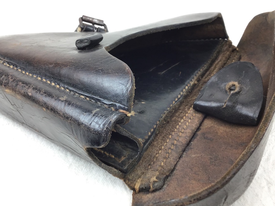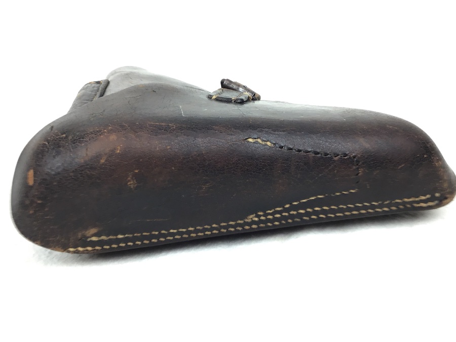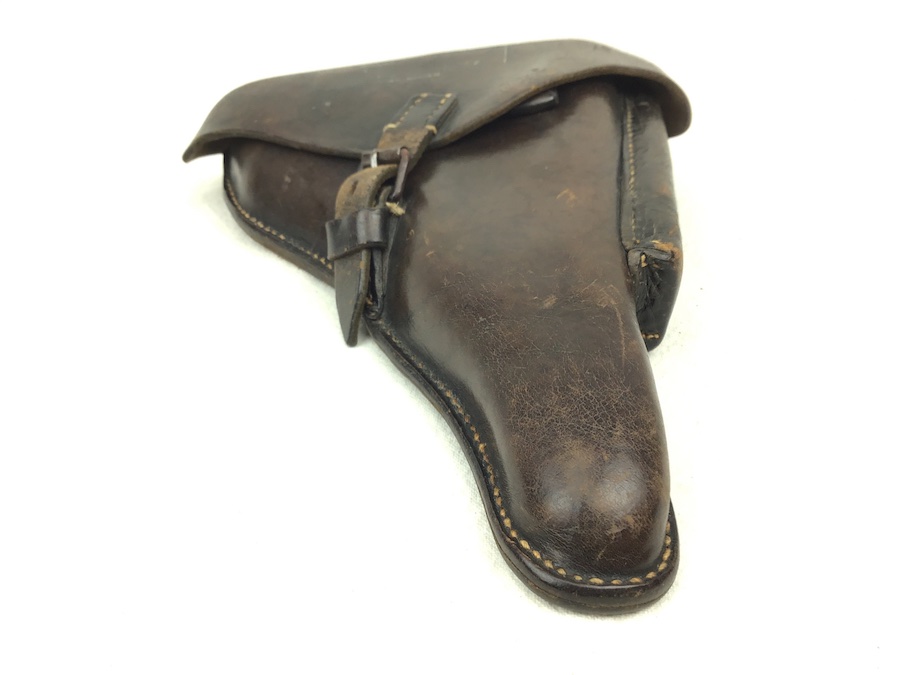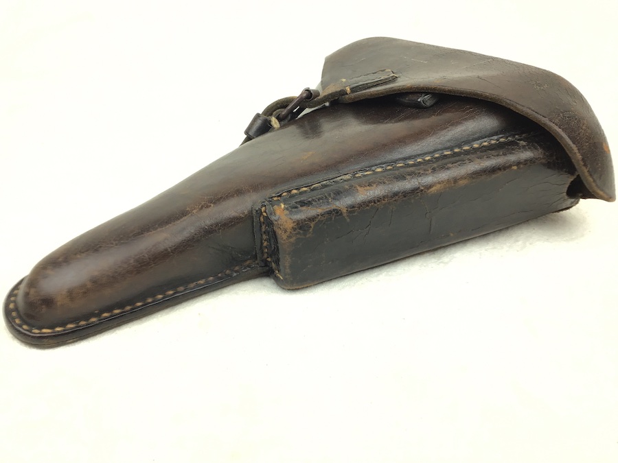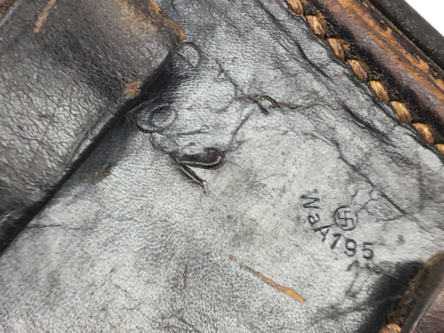 1/28/20 – Very good and original condition 1942 Luger holster. Maker stamped and dated on the back along with military proof stamp WaA195. Although the maker stamp and date are somewhat faint, they are still visible. Surface has a few scuffs and wear marks, as well as some wrinkling on the mag pouch. This is still a collectible piece. All the stitching is original and intact. Clean interior with a secure lift strap.