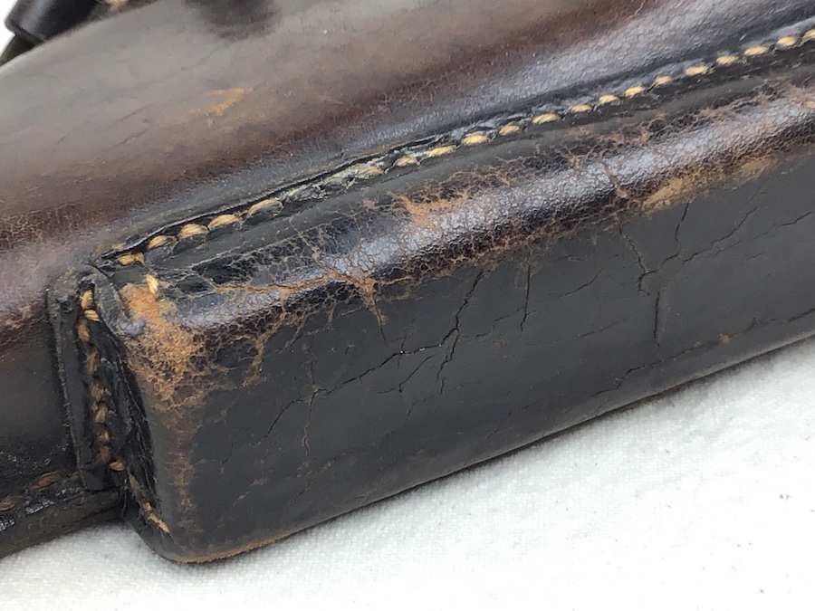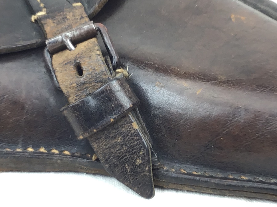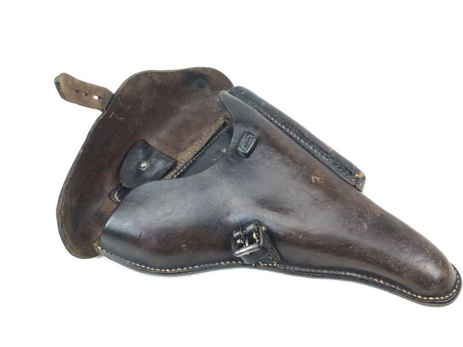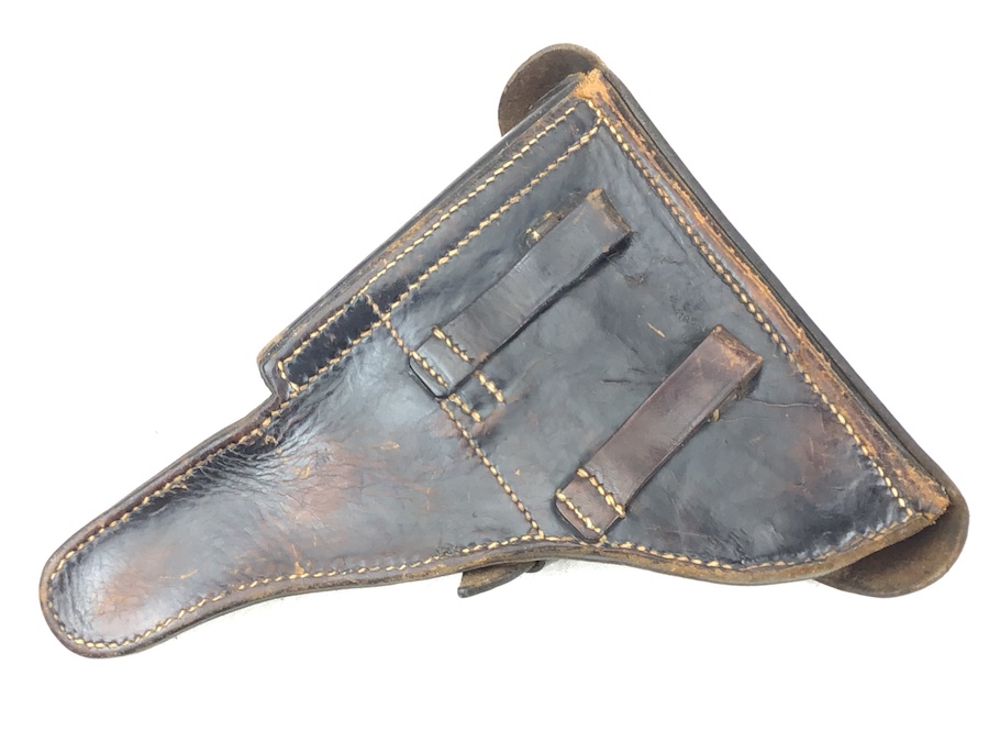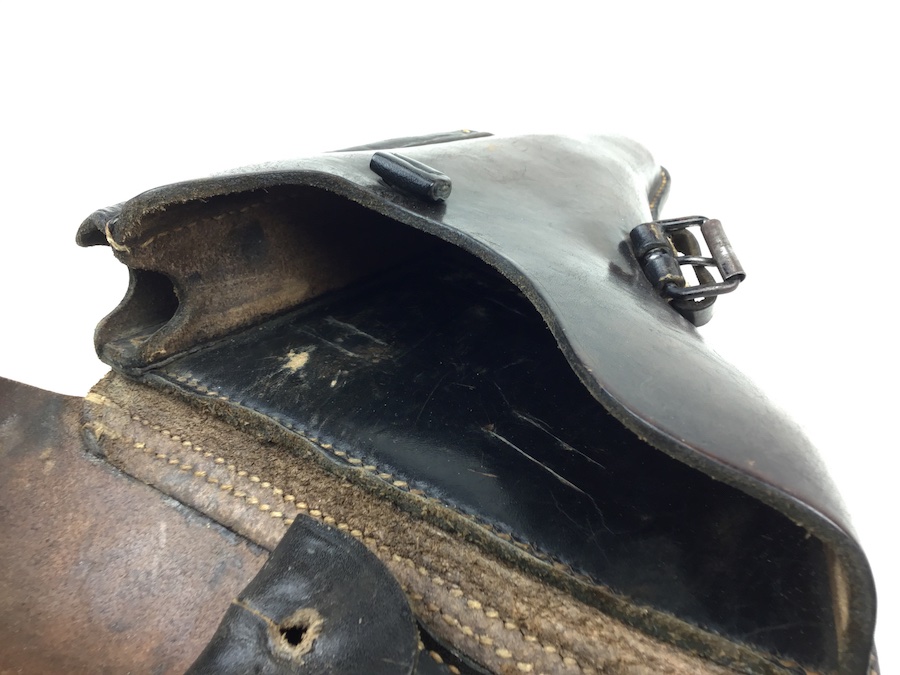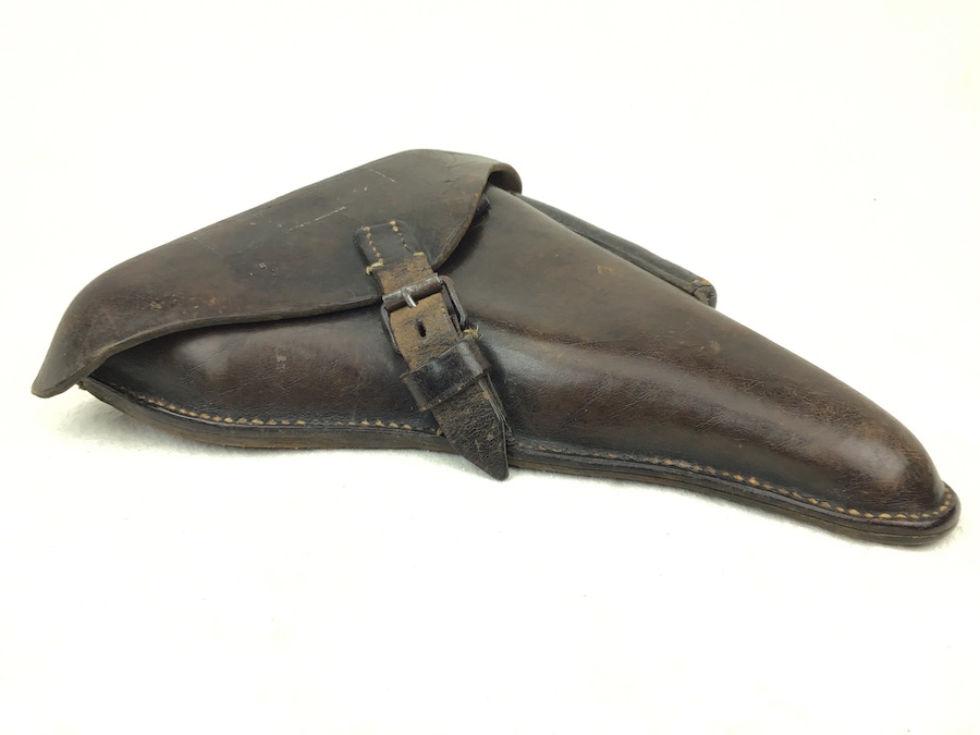1/28/20 – Very good and original condition 1942 Luger holster. Maker stamped and dated on the back along with military proof stamp WaA195. Although the maker stamp and date are somewhat faint, they are still visible. Surface has a few scuffs and wear marks, as well as some wrinkling on the mag pouch. This is still a collectible piece. All the stitching is original and intact. Clean interior with a secure lift strap.