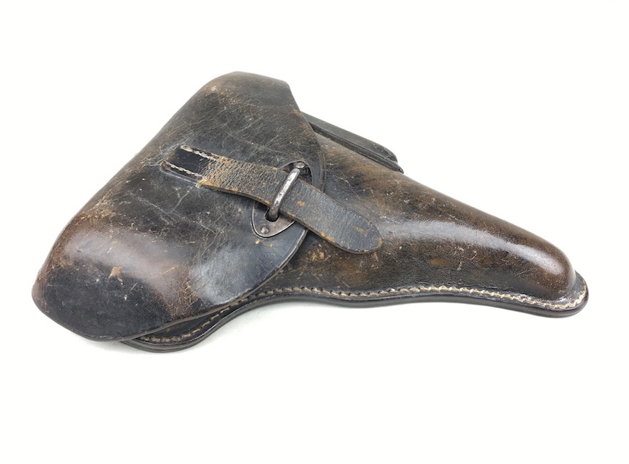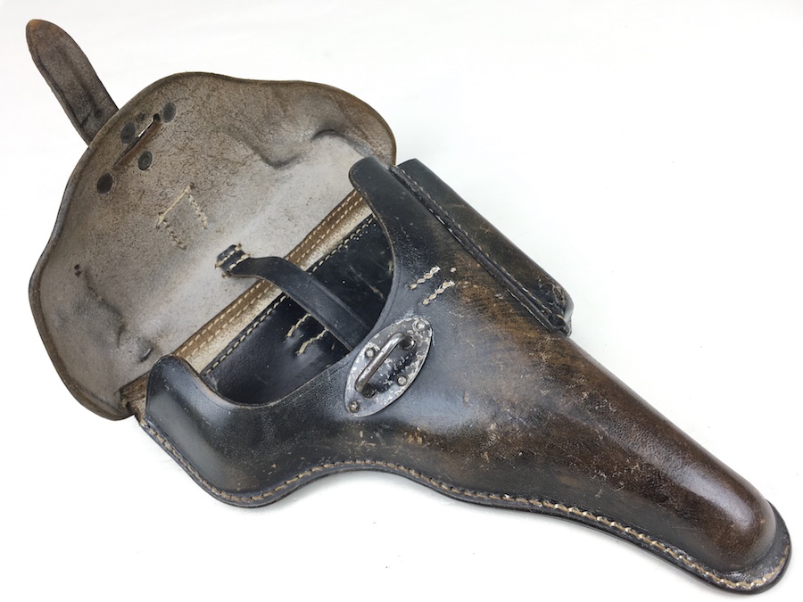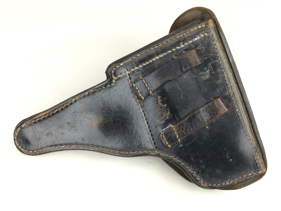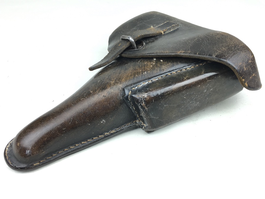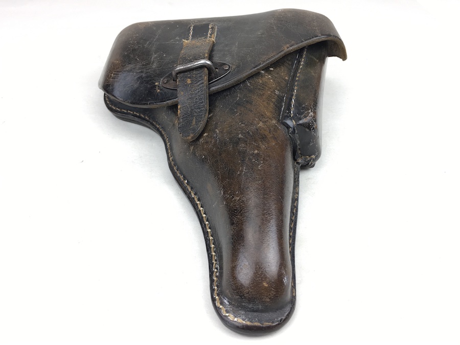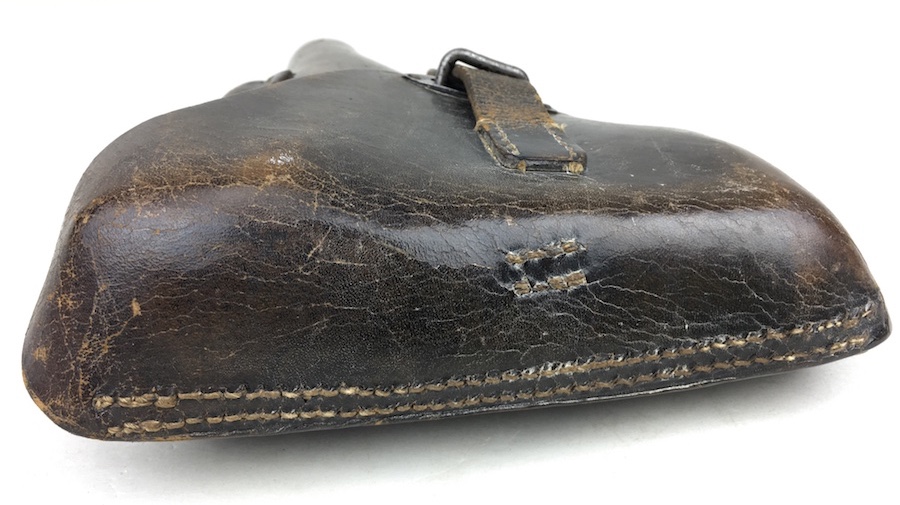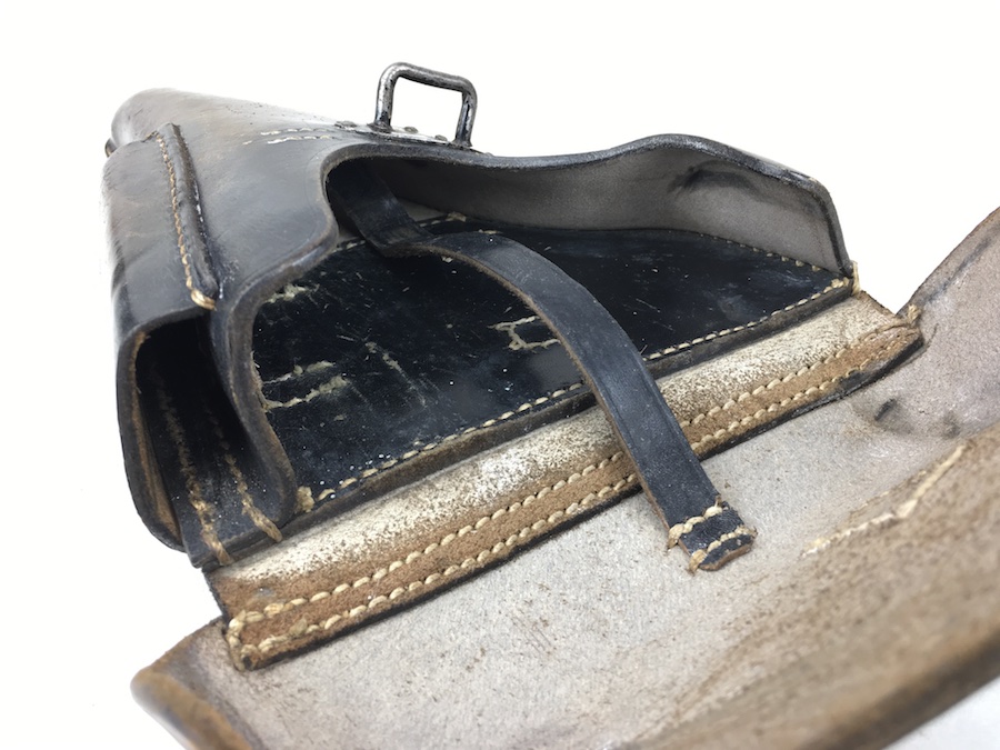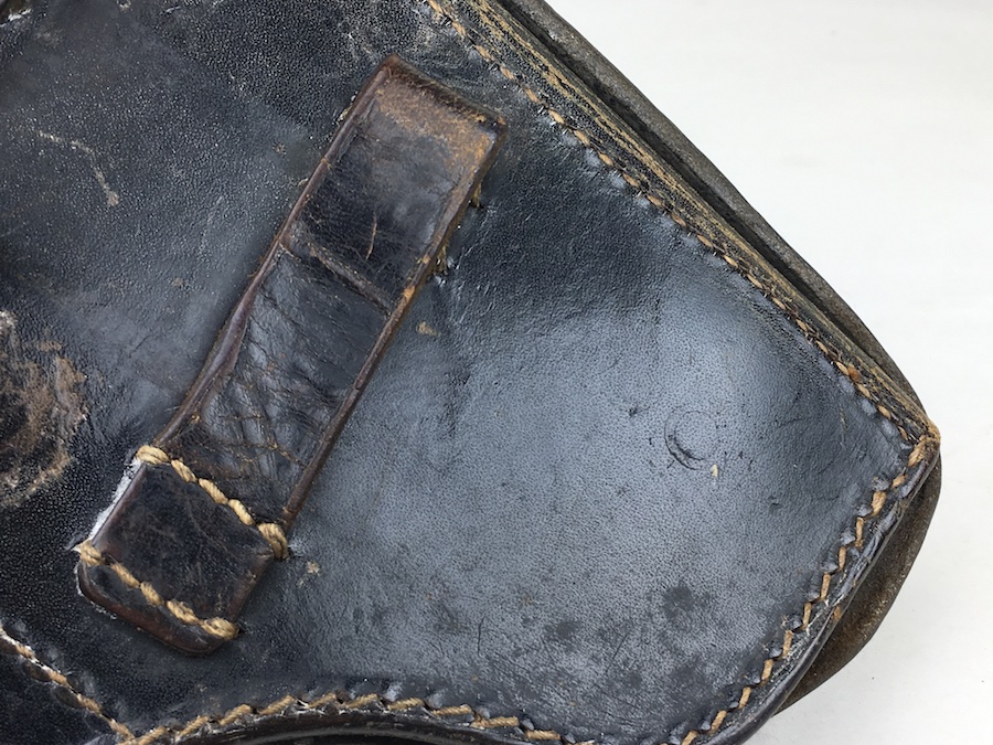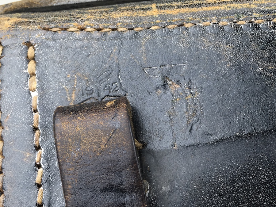 9/16/19 – This is an original 1942 dated P.38 holster. The back of the holster has a Christol Neuner maker stamp, which is known as the bearskin oakleaf 9. There is a 1942 date at the base of the oakleaf. There is also a waffen eagle stamp next to the maker on the back leather. The stamp is faded towards the right side. Even more faded is the “P.38” stamp on the far right side of the back leather. There is evidence of the stamp. The leather has great shape and overall quality, but there is some surface wear and scuffing on the exterior. The interior is clean. The back belt loops are in tact. The stitching on this holster is completely intact and original.