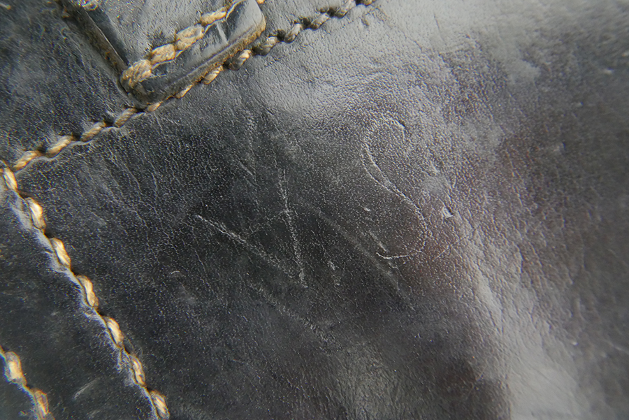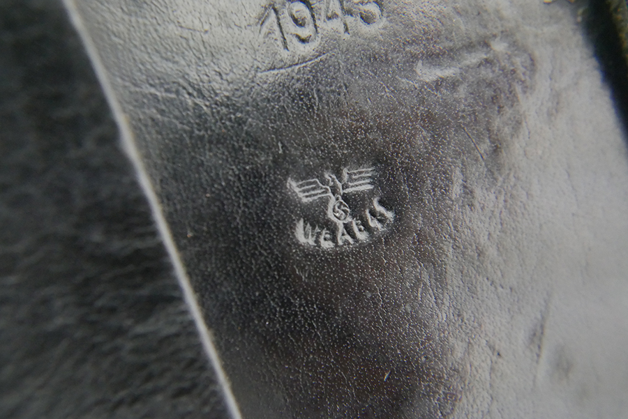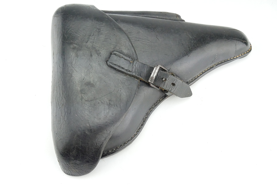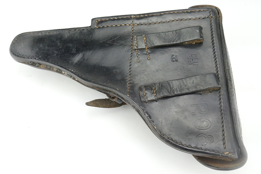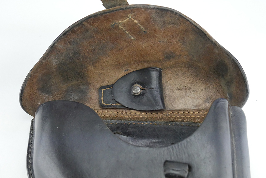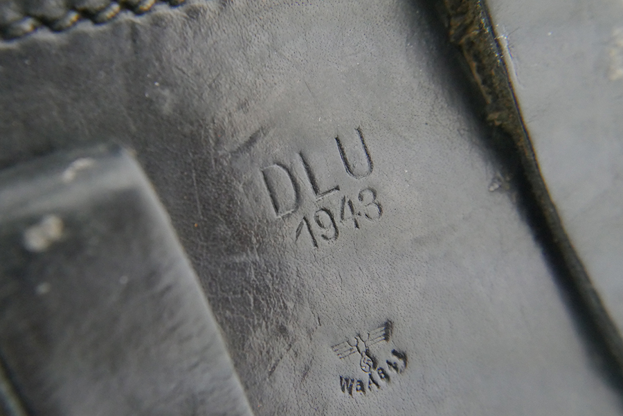 9/4/24 – This is an original WW2 production Luger holster. The holster is dated 1943 on the back, which is uncommon since most Luger production had ended by the conclusion of 1942. The markings on the back of the holster are still strong and easily legible. The back is maker stamped “DLU 1943” as well as Waffen Eagle WaA641, and the P. 08 stamp. The left loop on the back is missing the top part of the stitching and is loose, but still attached to the holster. The back of the holster was also marked “V. S.” by a previous owner. The leather thoroughout the holster is still soft and pliable. There are two cracks in the leather on the toe of the holster, and there is a minor spot of separation of the leather on the left side of the flap. The holster also is slightly coming apart on the left side near the toe where it appears some of the stitching is missing. The luger tool pouch is still present and is in great condition.