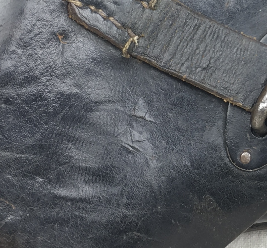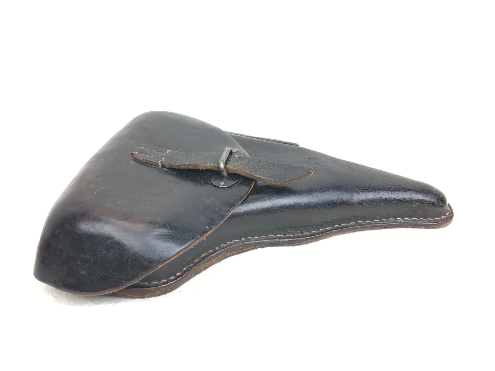 2/25/19 – Original and excellent black hard-shell P.38 holster. Manufactured late WWII. Maker stamped “gmo 44” with a waffen stamp underneath. Visible, but not distinct. Faint markings as shown in photos. Very minor surface scuffs with all original intact stitching. Initials “”KF” etched near the closure strap, but not very noticable. A little soft near the toe but still holding its shape nicely. Clean interior with secure lift strap. Guaranteed authentic. Very few hardshell P.38 holsters were made in 1944.