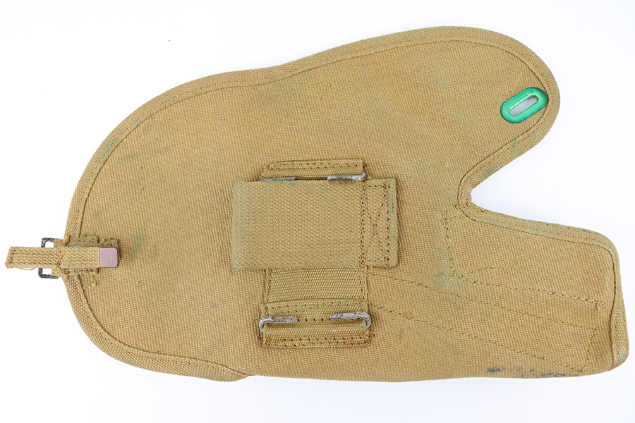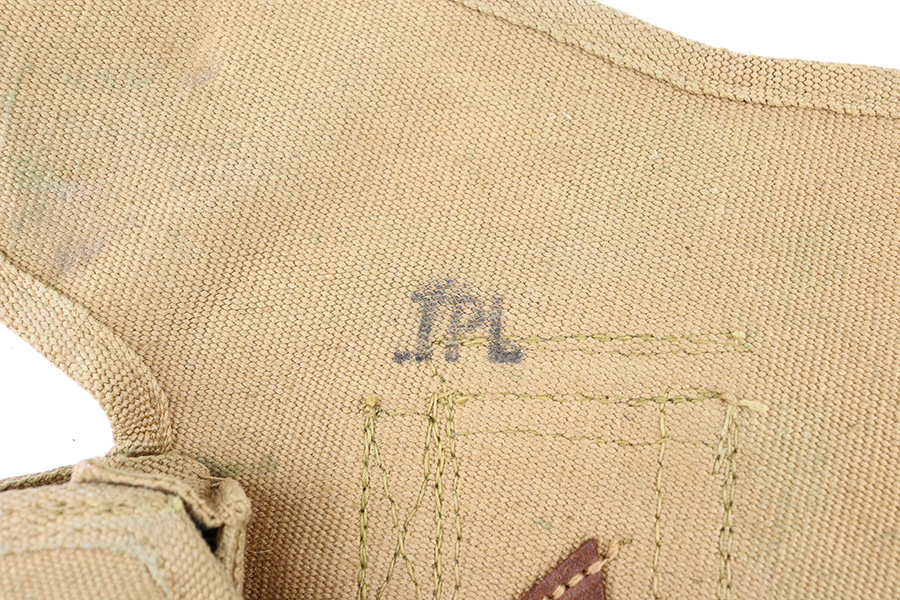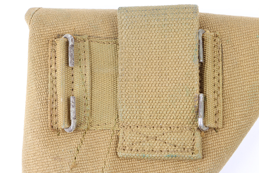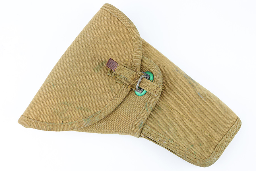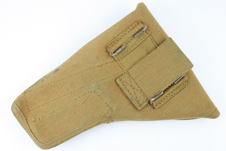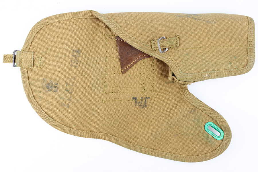 1/2/24 – This is an original late WW2 production Canvas holster for a Canadian Inglis High Power pistol. The holster is ink stamped with a military proof, maker, and 1945 date on the interior canvas. The canvas is clean and in near excellent condition with some light surface wear from use and aging. No stitching issues. These are fairly scarce and not many canvas High Power holsters are on the market today.