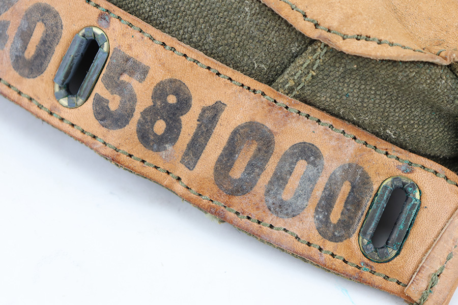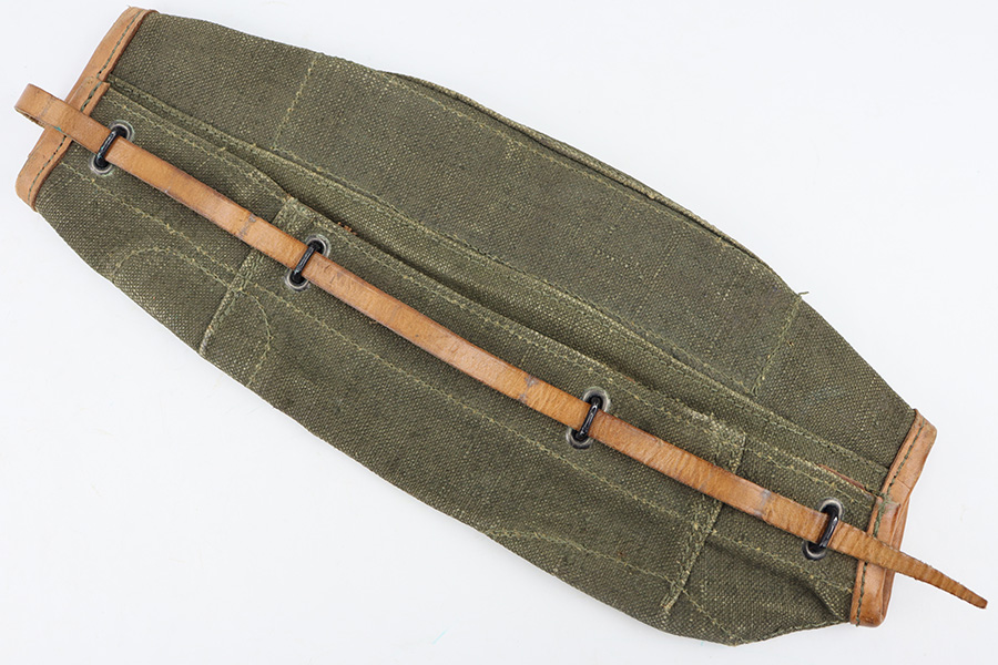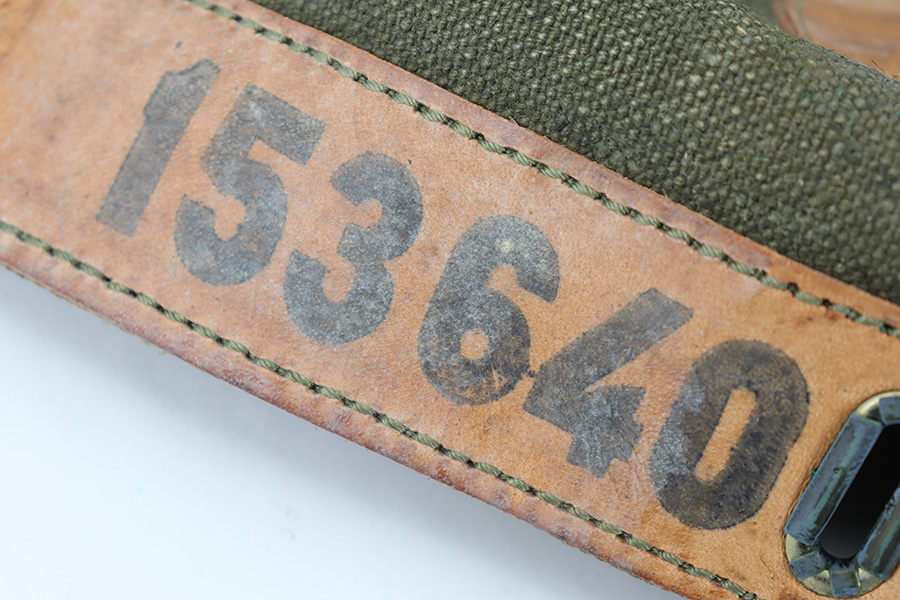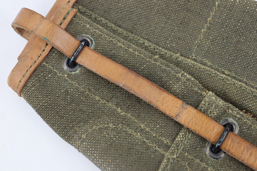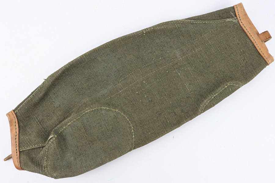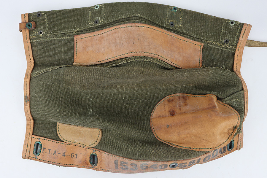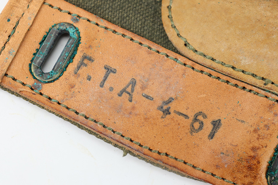 12/4/23 – This is an excellent condition 1961 dated Canvas rifle action cover. The cover measures 15 inches long. The leather, canvas, and stitching is original and excellent throughout.