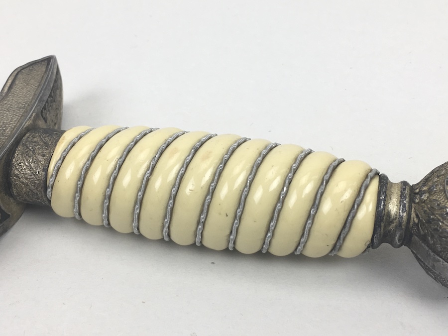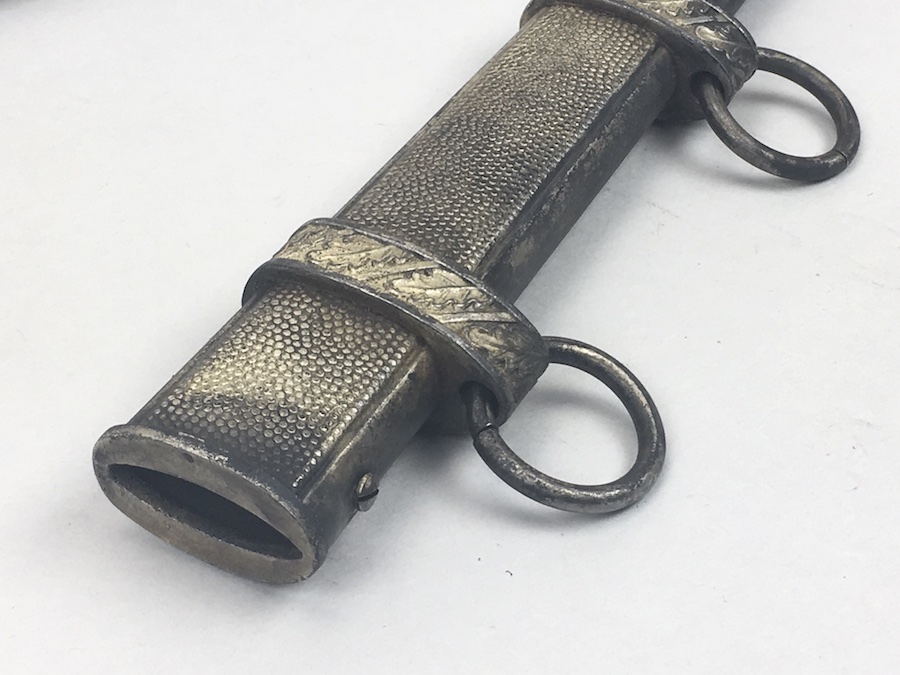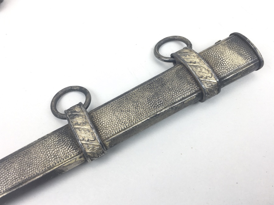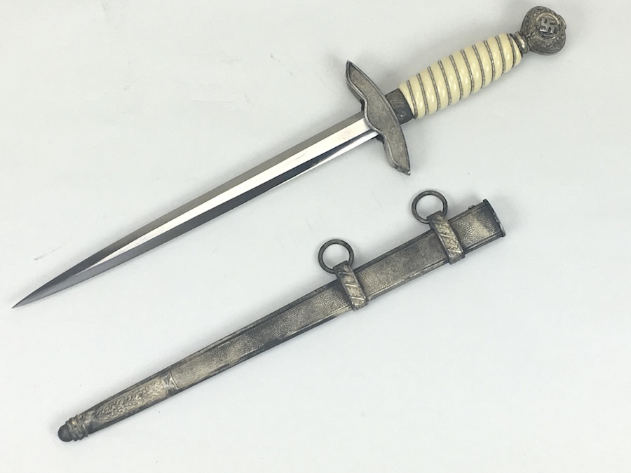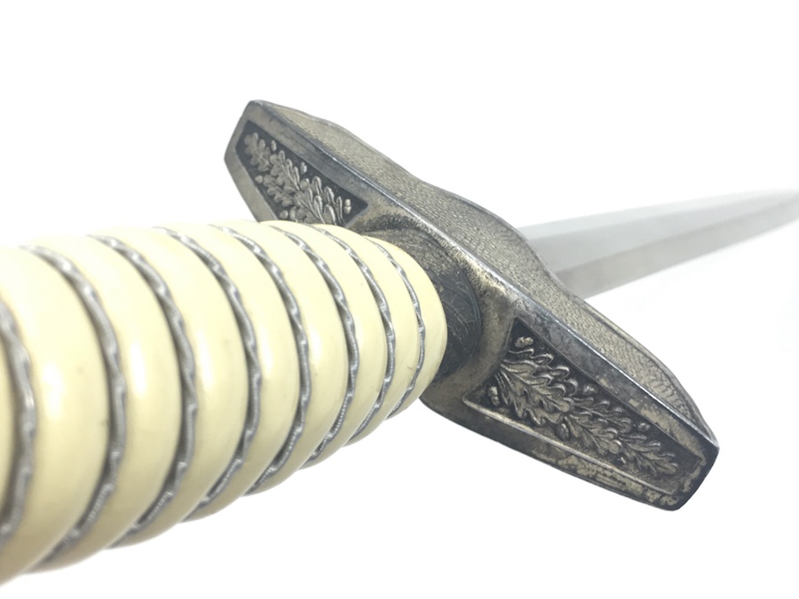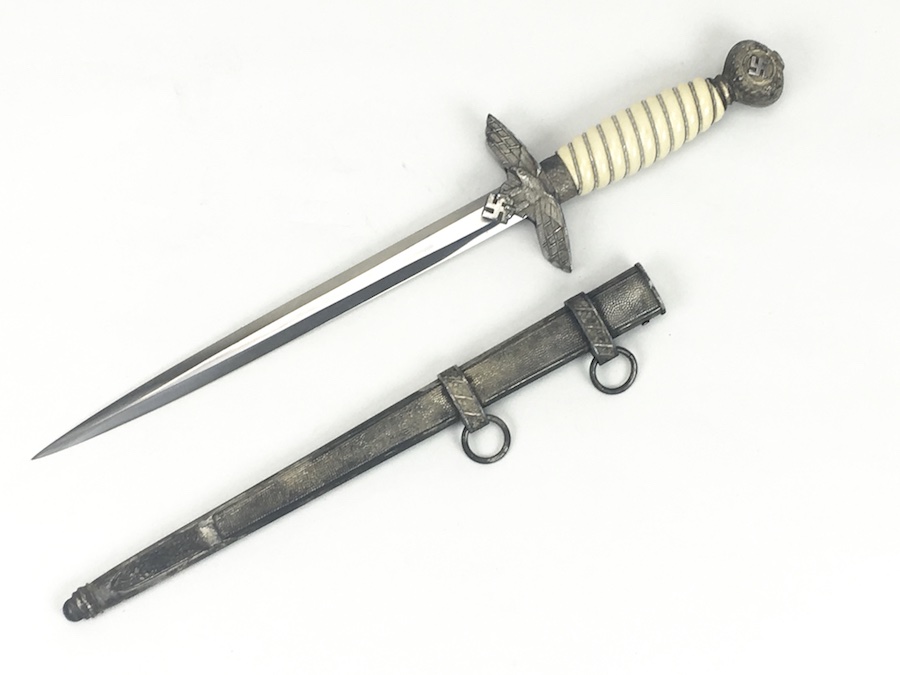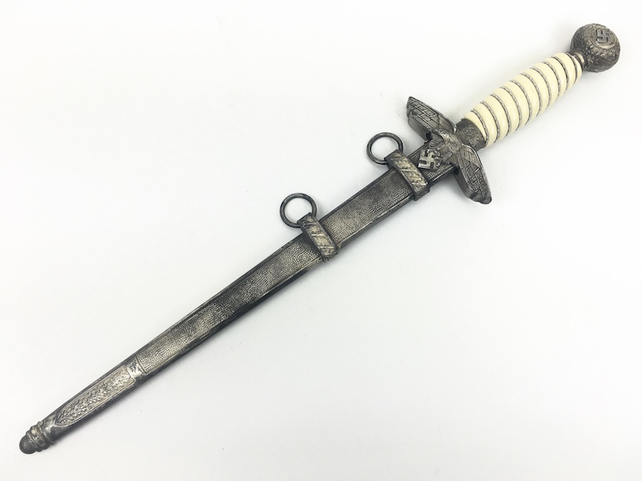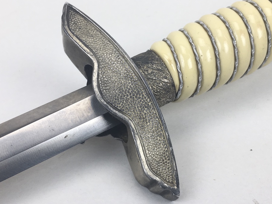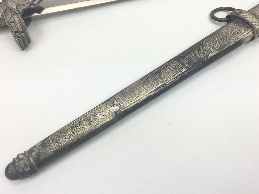 6/18/19 – Very nice condition 2nd Model Luftwaffe Dagger from WWII. Un-marked blade is in great condition and remains bright but has a few age spots in the surfaces and minor scabbard wear. No evidence of sharpening. The lack of a maker stamp doesn’t scare / concern us about the authenticity of this blade. We believe this is original. Blade washer / stopper still in place. The steel scabbard has worn silvering with age patina, but no dents or cracks. Hangers are secure. Although there is some patina on the surface, the cross guard has good detailing throughout the bird and swastika. The grip is intact with no chips or cracks. Pommel is tight and secure.