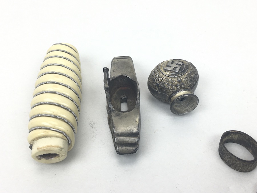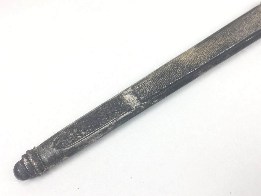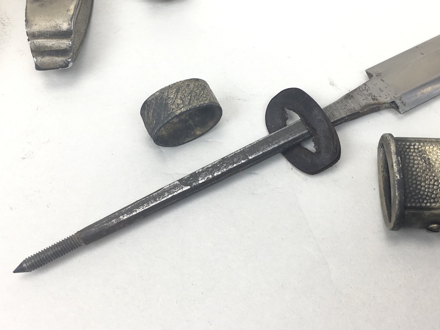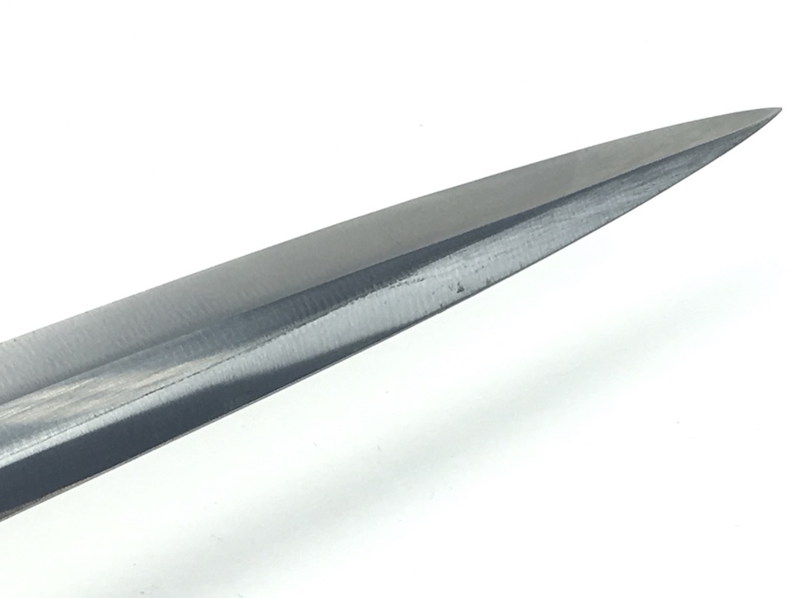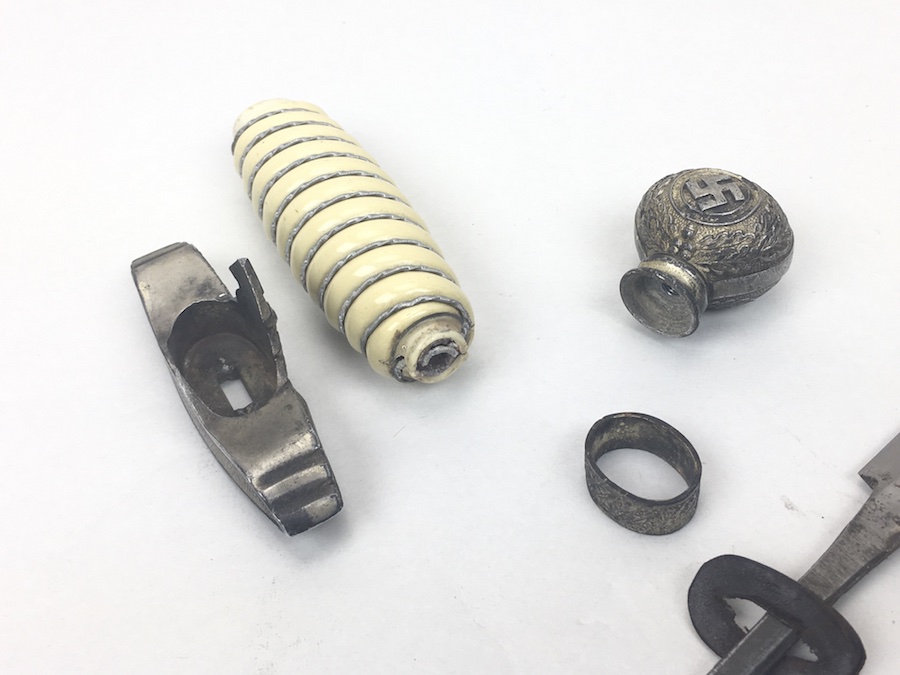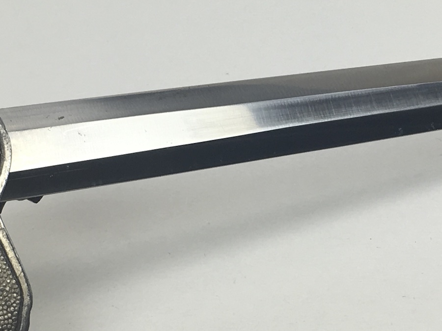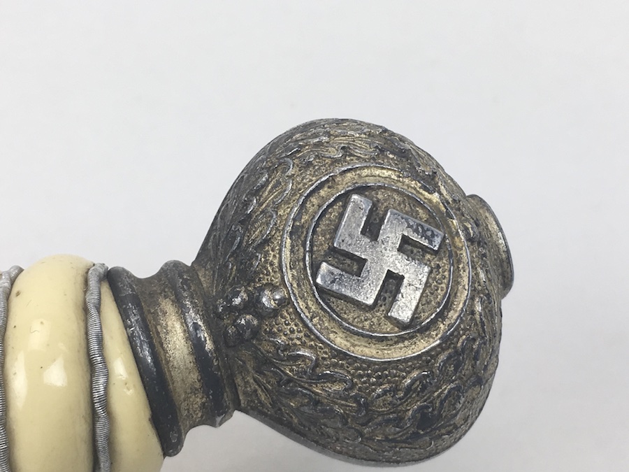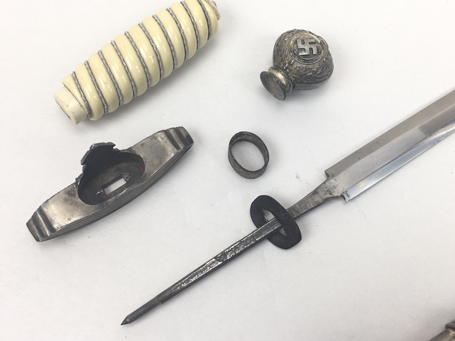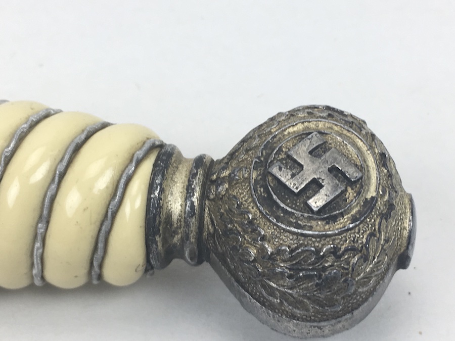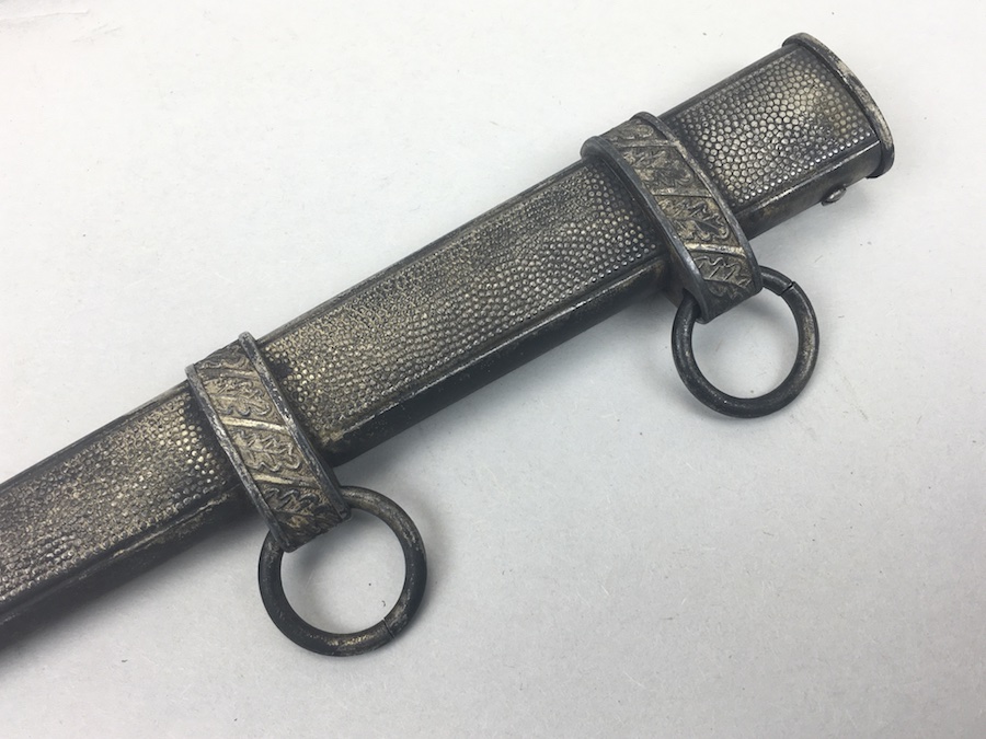6/18/19 – Very nice condition 2nd Model Luftwaffe Dagger from WWII. Un-marked blade is in great condition and remains bright but has a few age spots in the surfaces and minor scabbard wear. No evidence of sharpening. The lack of a maker stamp doesn’t scare / concern us about the authenticity of this blade. We believe this is original. Blade washer / stopper still in place. The steel scabbard has worn silvering with age patina, but no dents or cracks. Hangers are secure. Although there is some patina on the surface, the cross guard has good detailing throughout the bird and swastika. The grip is intact with no chips or cracks. Pommel is tight and secure.