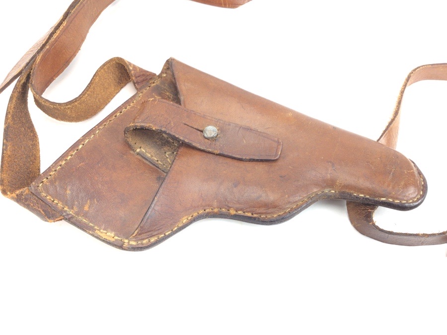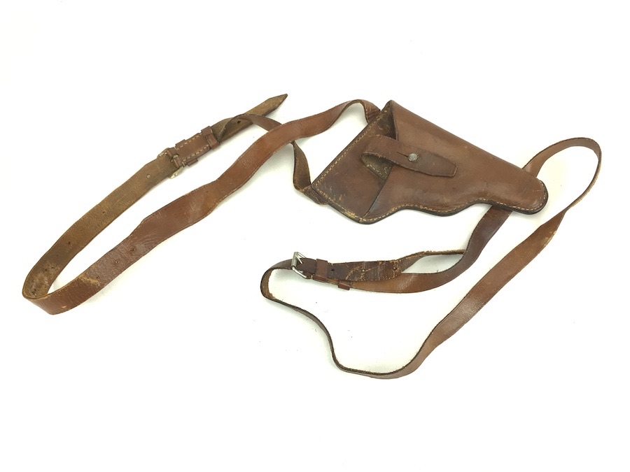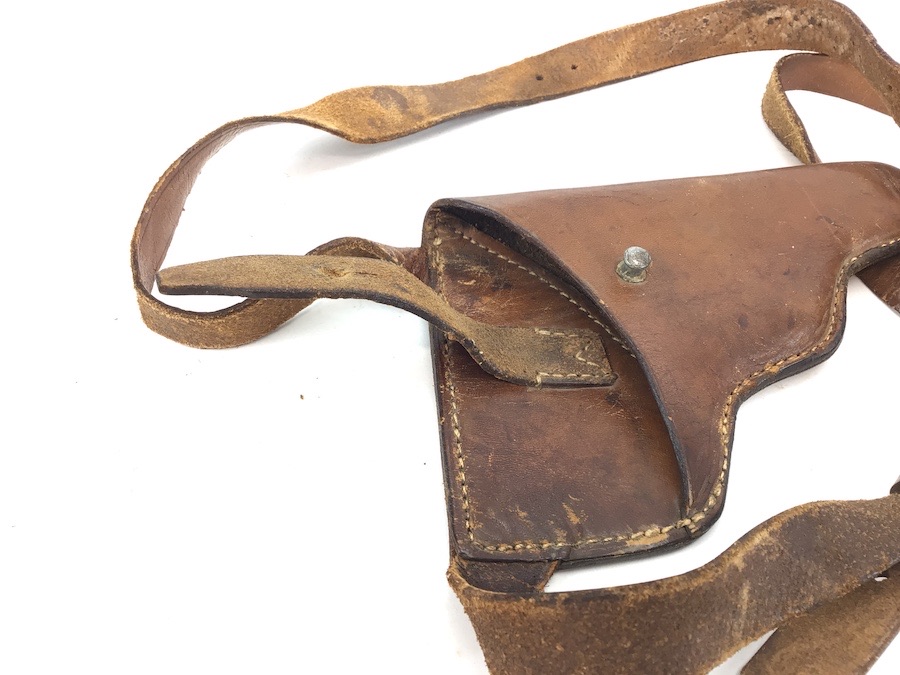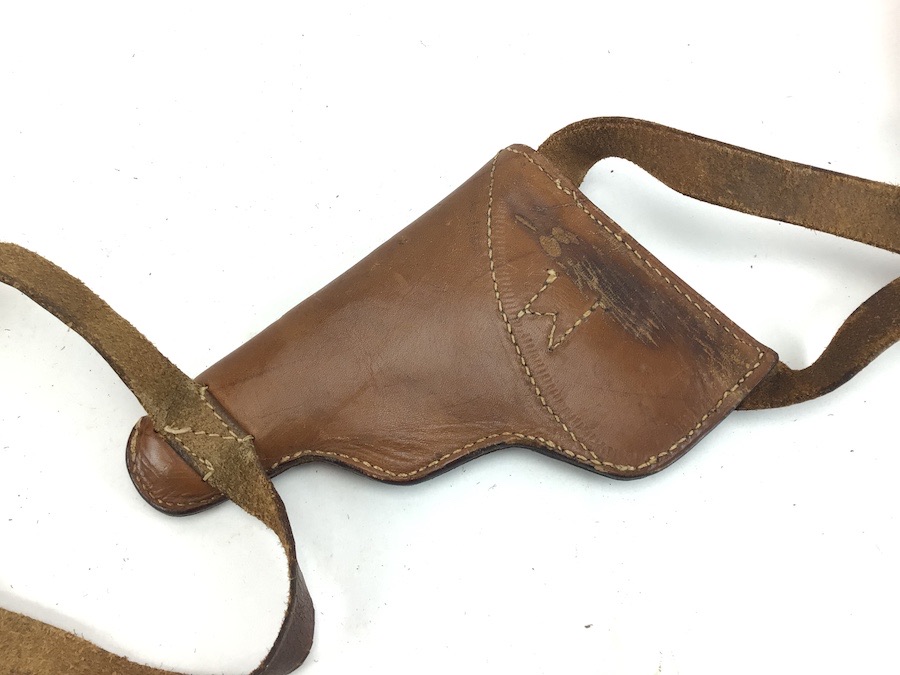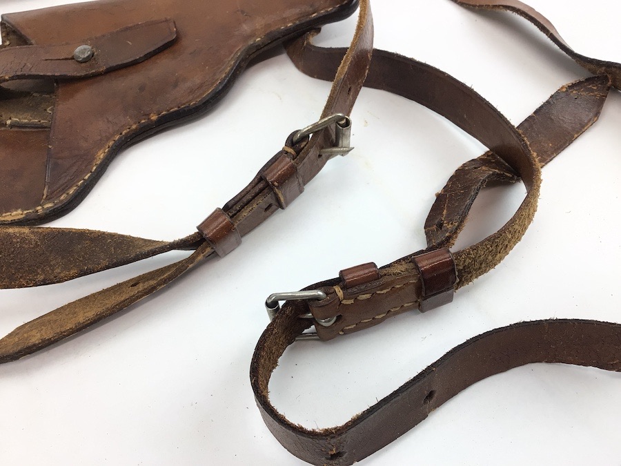 3/25/22 – This is an unmarked and undated leather shoulder holster. Made for a 7.65mm handgun. Such as a PPK or other similar sized pistols. Strong leather with minimal wear. Tight rivets and stitching. Possible late WWII or immediately post war. Stitching is intact. Buckle and straps are secure.