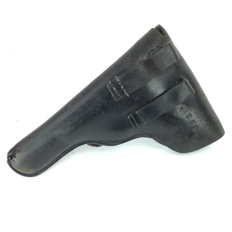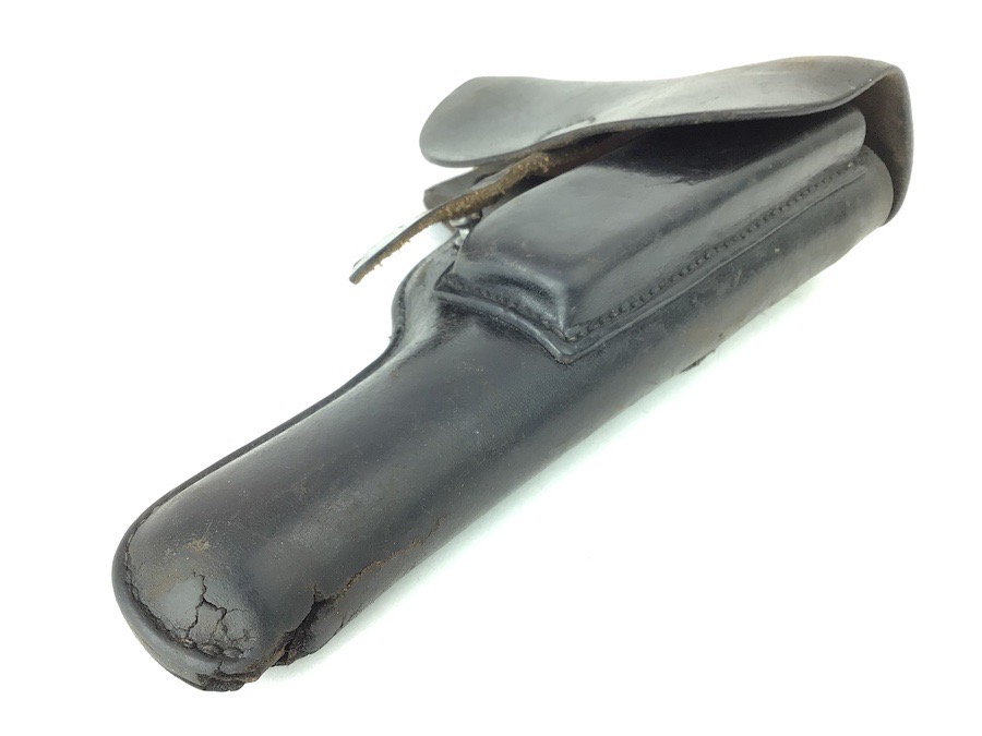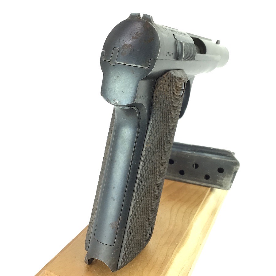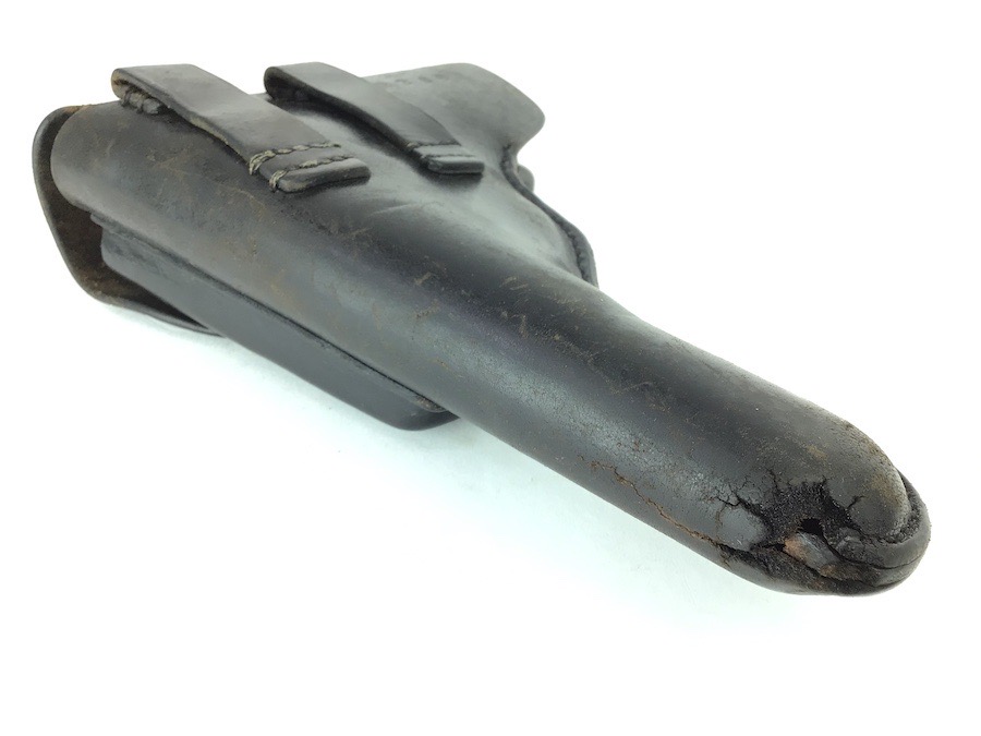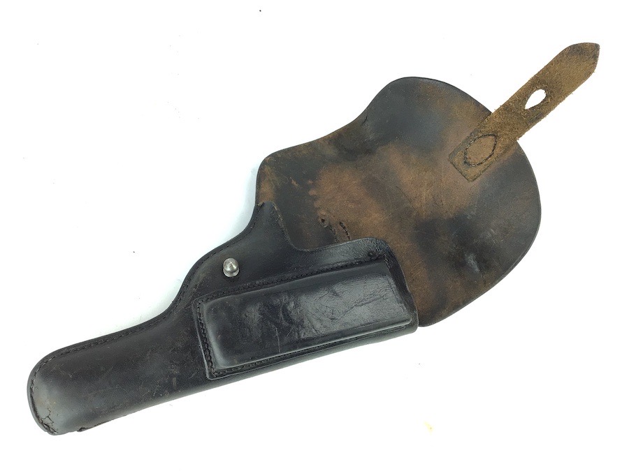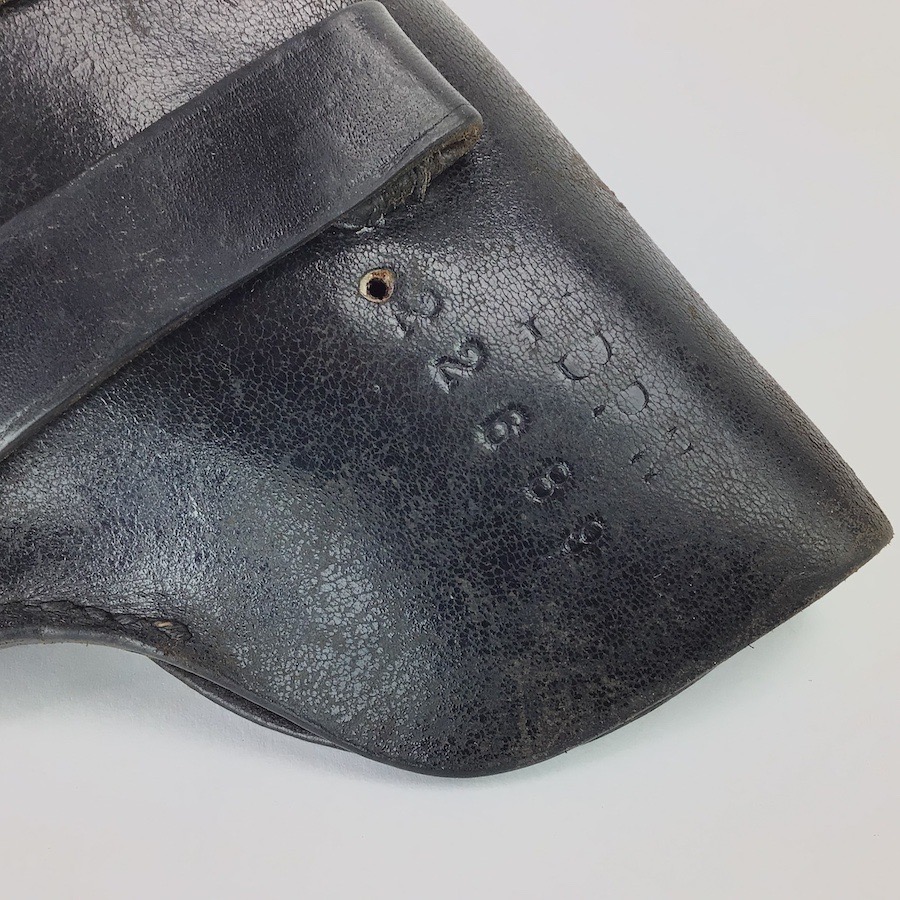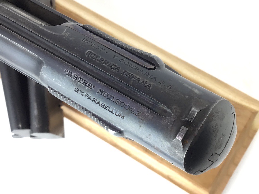 11/7/23 – This is a Astra 600 that comes with 2 magazines and Police holster. Holster has the LBPN police department marking. One of the magazines has the numerals 118 etched in the base, the other magazine is un-marked. The pistol is all matching and original with about 85% blue remaining. There is high edge thinning and minor finish loss as well as some pin pricking on the rear slide area. Excellent grips with no noteworthy flaws. Bore is shiny with strong rifling and rates a strong 8 of 10. The holster shows some honest wear and a hole at the toe, but remaining stitching is secure.