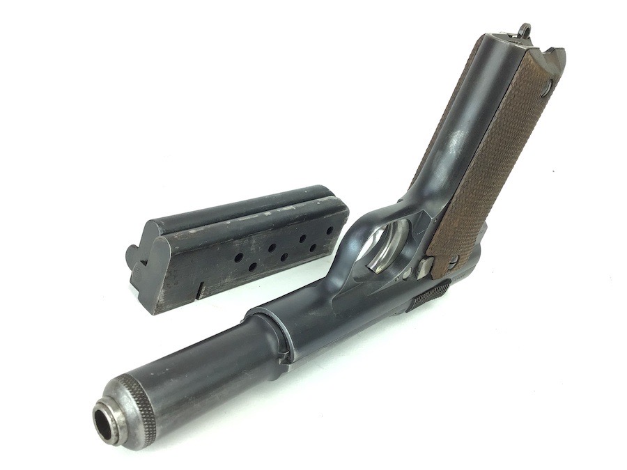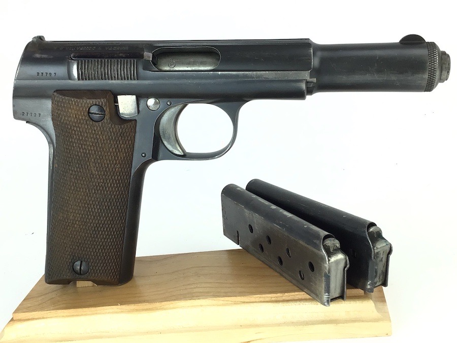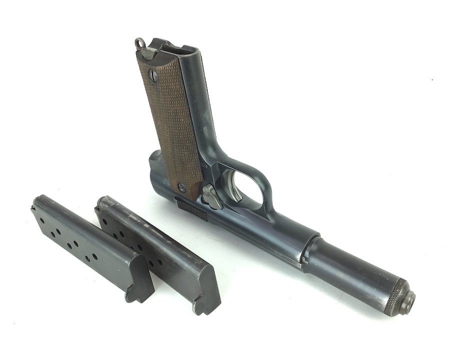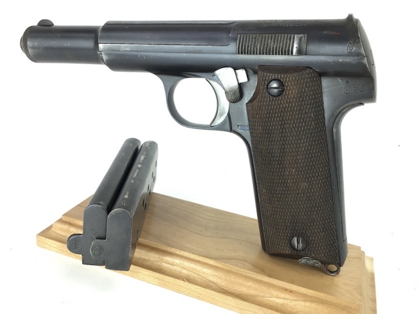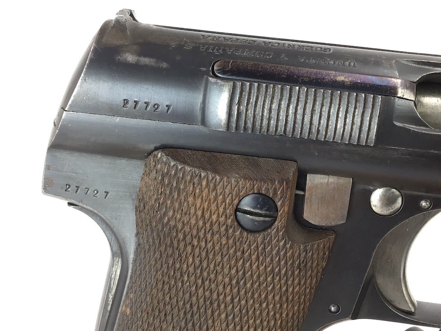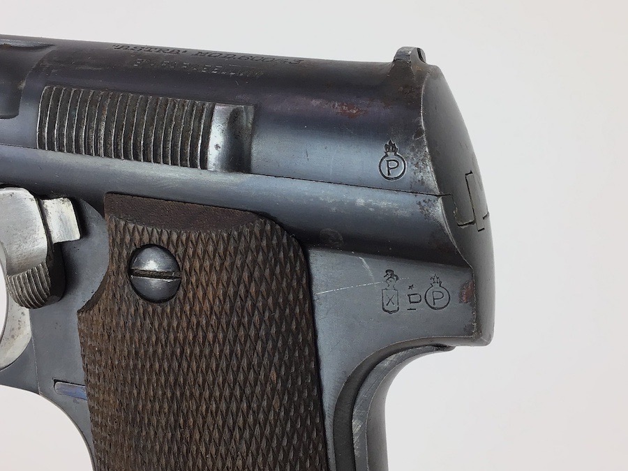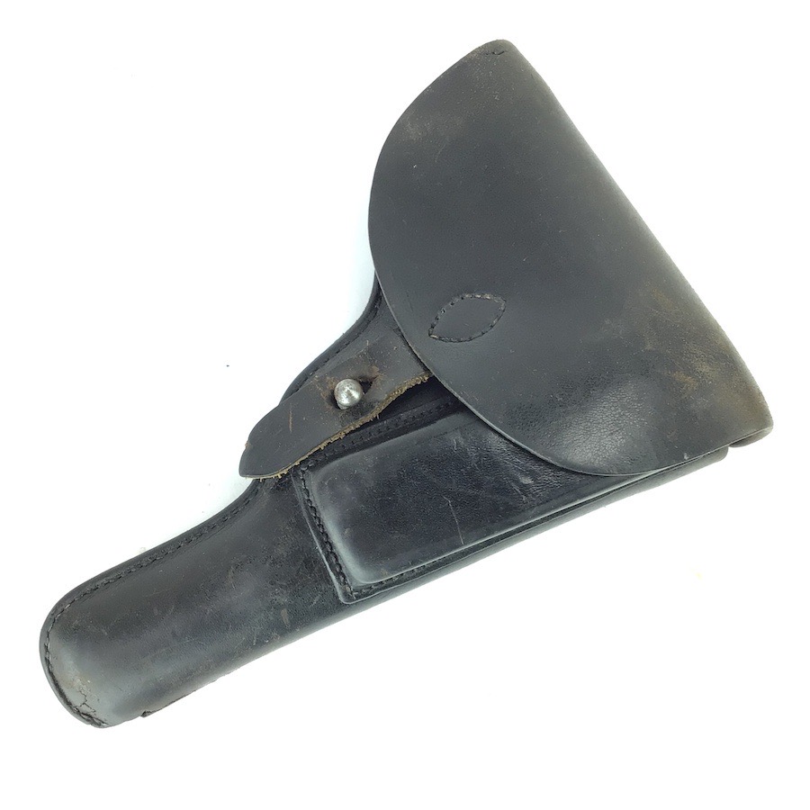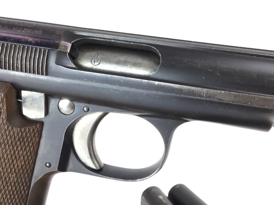 11/7/23 – This is a Astra 600 that comes with 2 magazines and Police holster. Holster has the LBPN police department marking. One of the magazines has the numerals 118 etched in the base, the other magazine is un-marked. The pistol is all matching and original with about 85% blue remaining. There is high edge thinning and minor finish loss as well as some pin pricking on the rear slide area. Excellent grips with no noteworthy flaws. Bore is shiny with strong rifling and rates a strong 8 of 10. The holster shows some honest wear and a hole at the toe, but remaining stitching is secure.