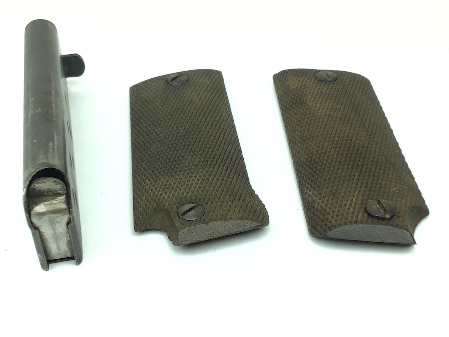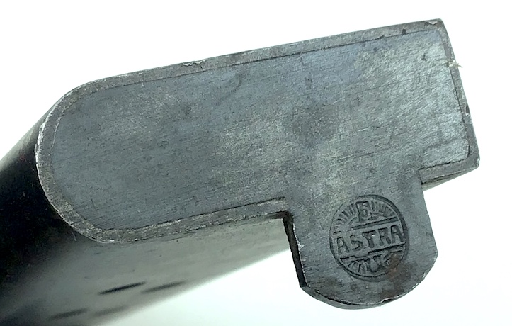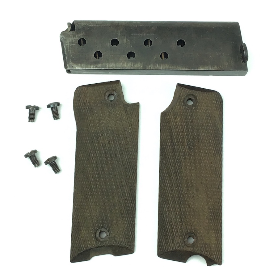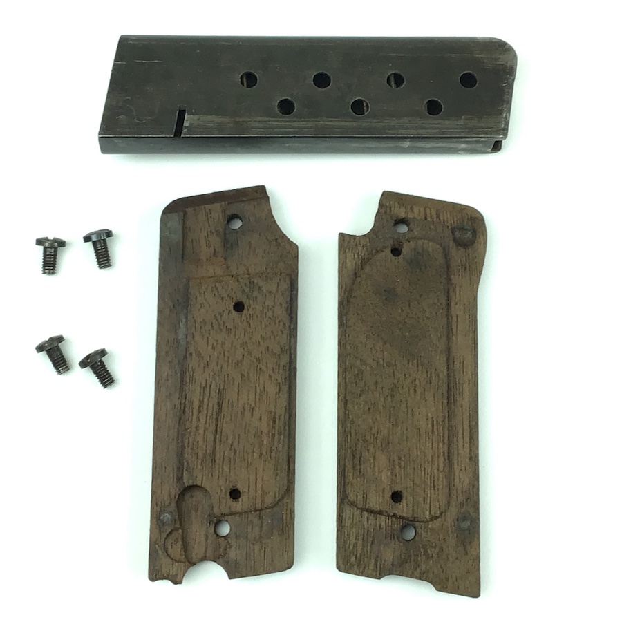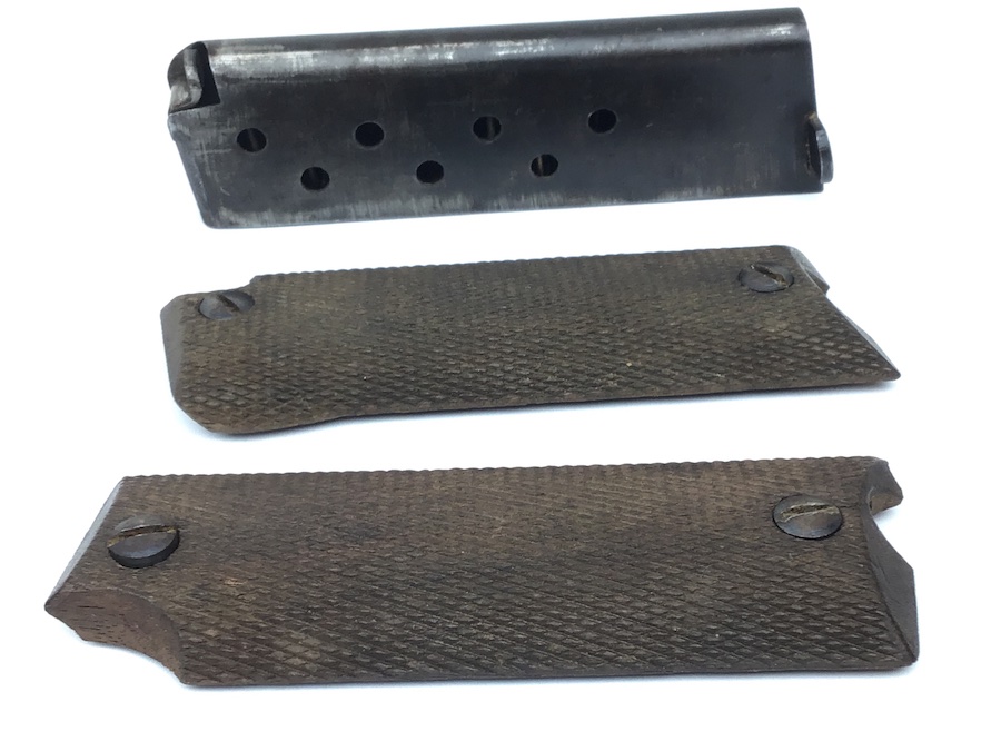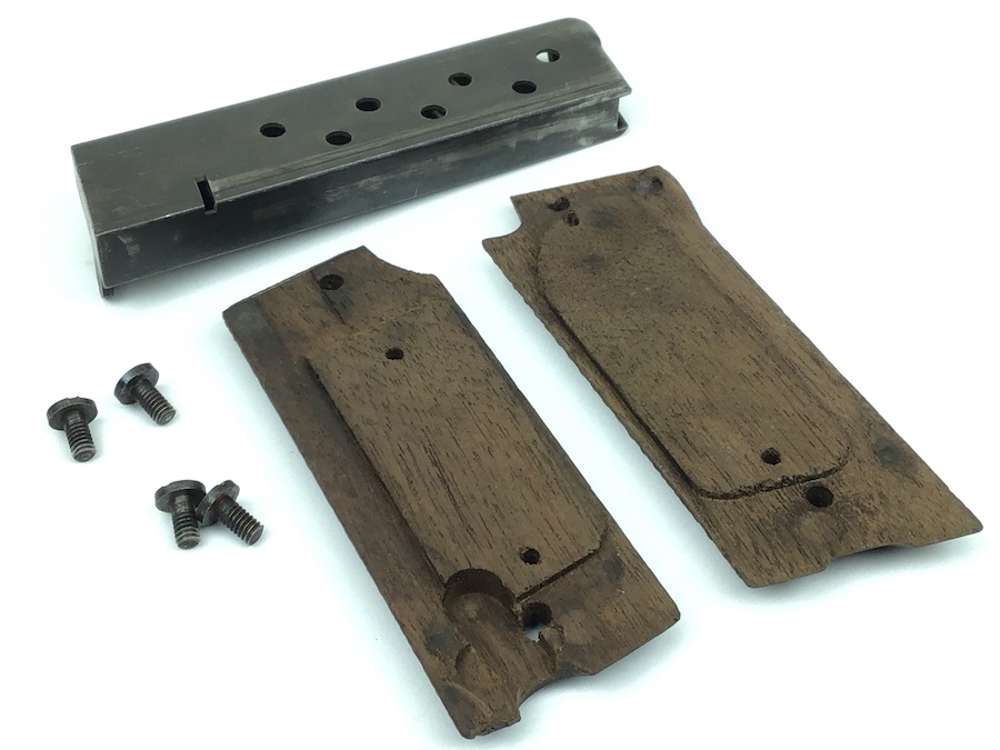 4/22/20 – These are original Astra 600 wooden grip panels, screws and a magazine from the WW2 era. The magazine has some light bluing loss, but no rust or pitting. Holds 7 rounds, and has a strong, fully functional spring. Astra stamped on the base. The wooden grips have great checkering with no cracks or chips.
