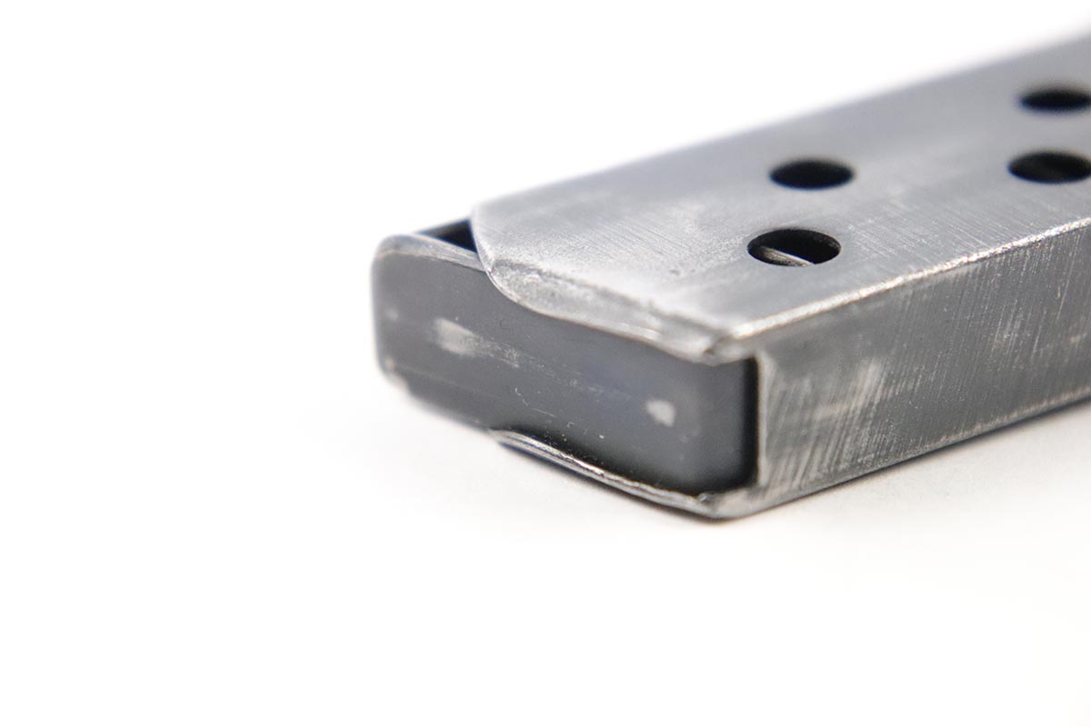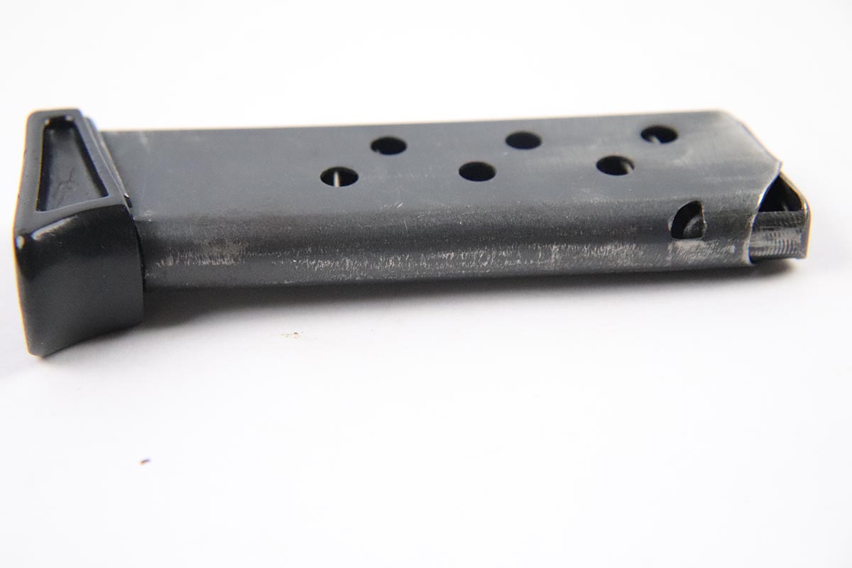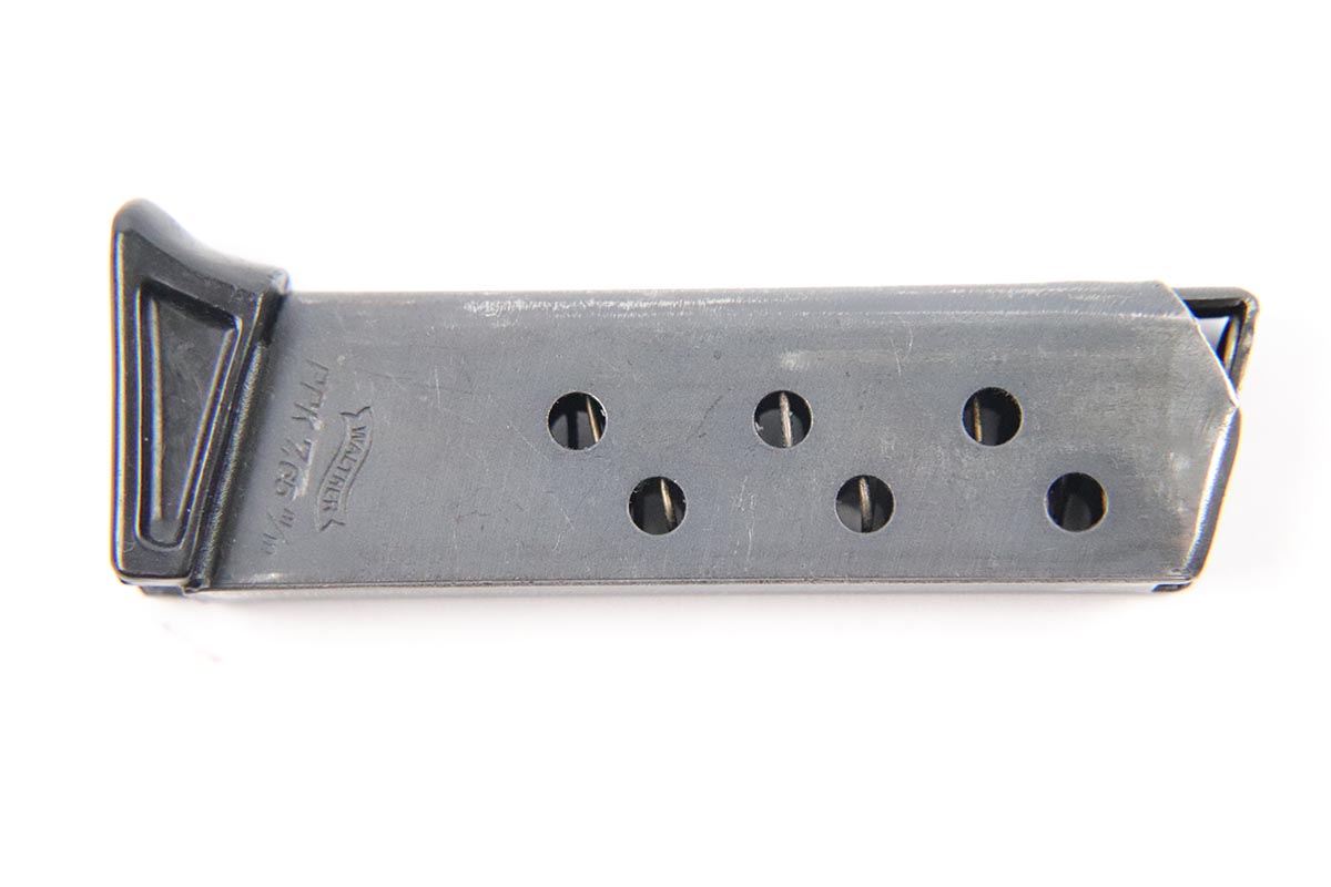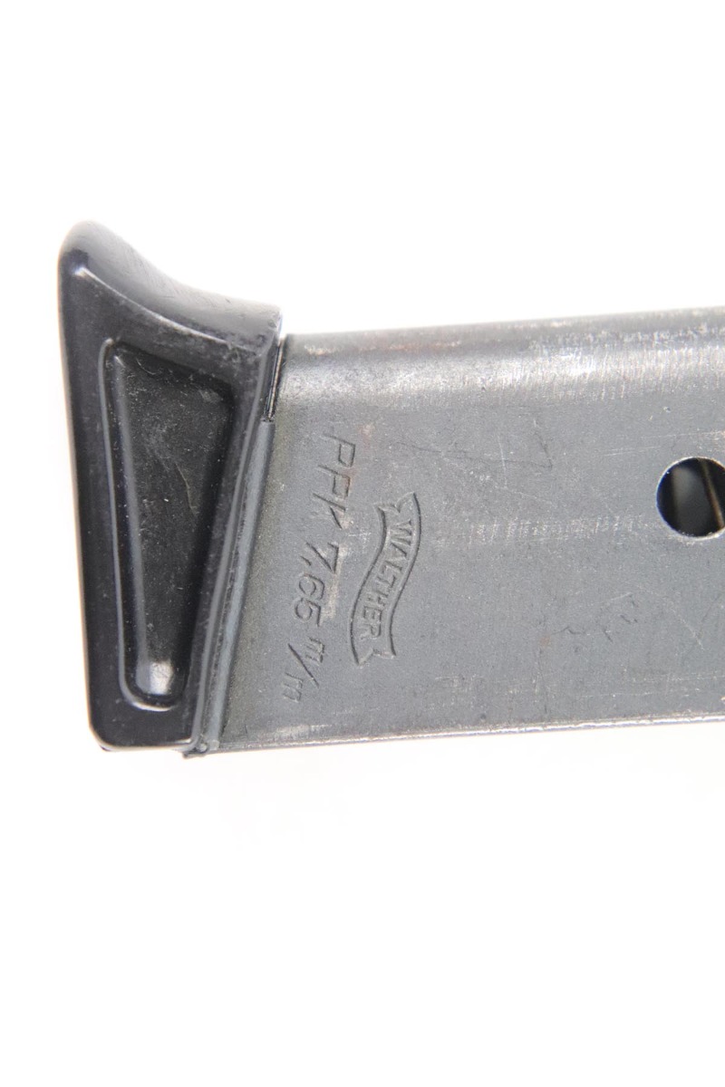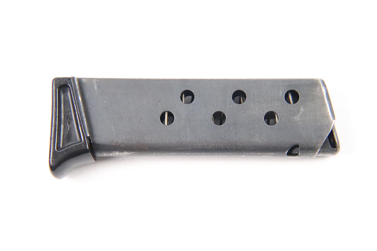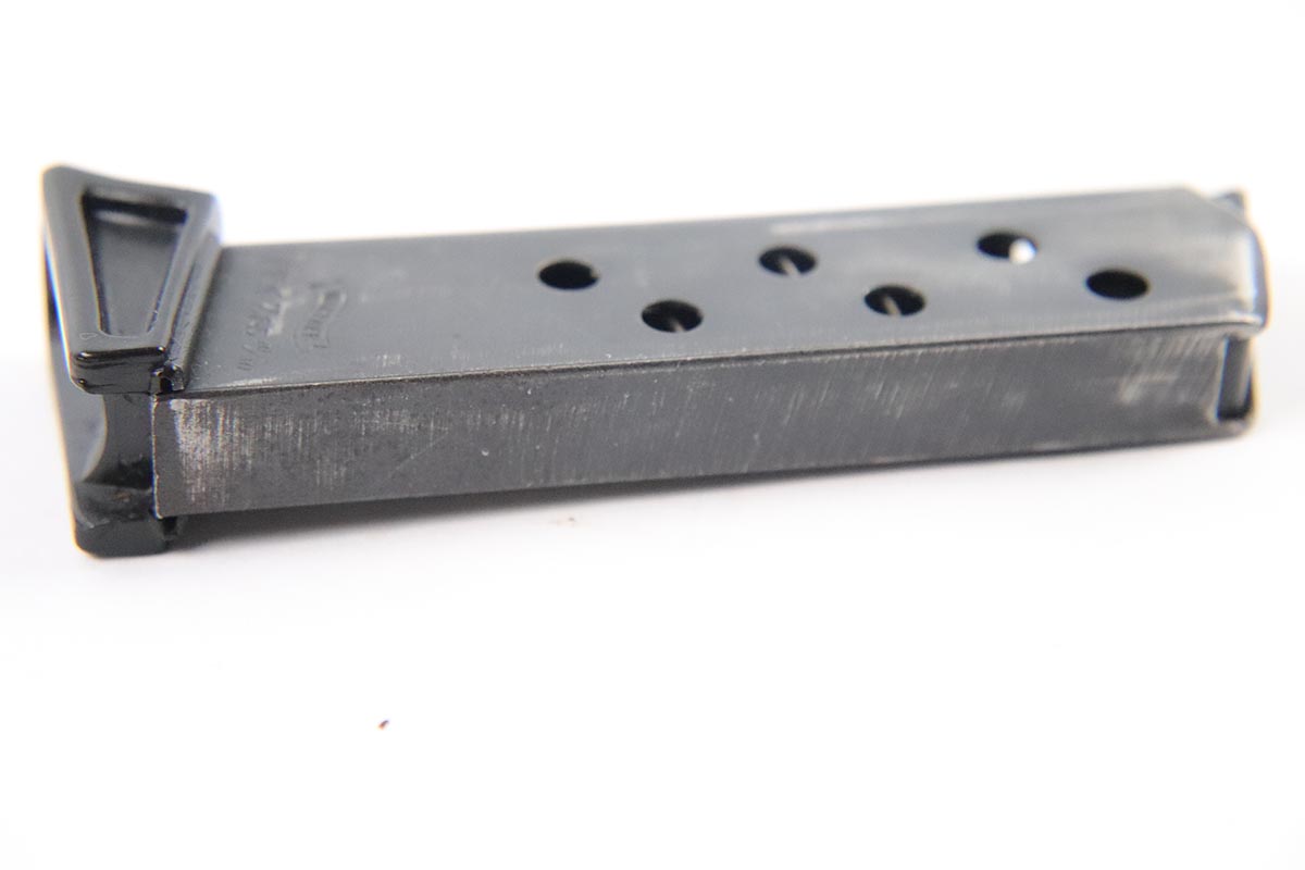 5/16/18 – This is an original, excellent WW2 wartime production PPK magazine. The magazine has a black bakelite finger extension. The magazine frame is a dull blued finish with some thinning of the finish, but no rust or pitting. The spring is strong and fully functional. Proper wartime finger extension with no cracks or chips. Guaranteed original.