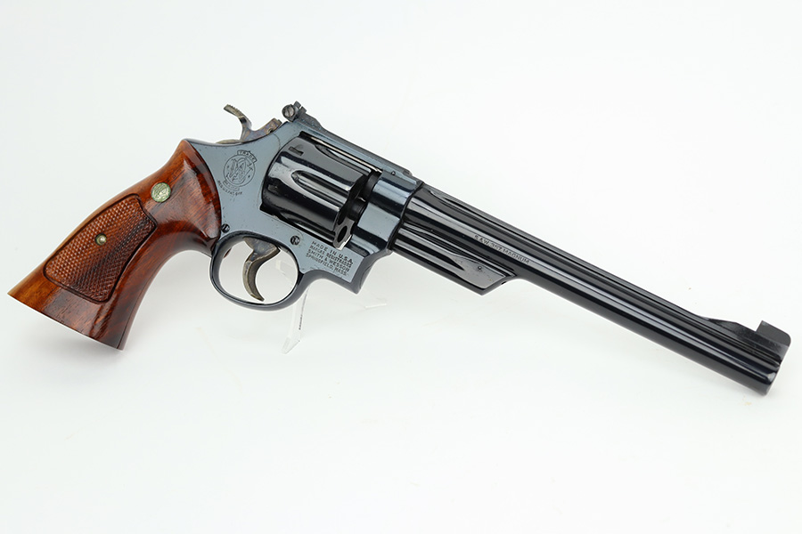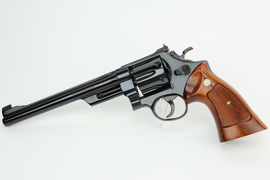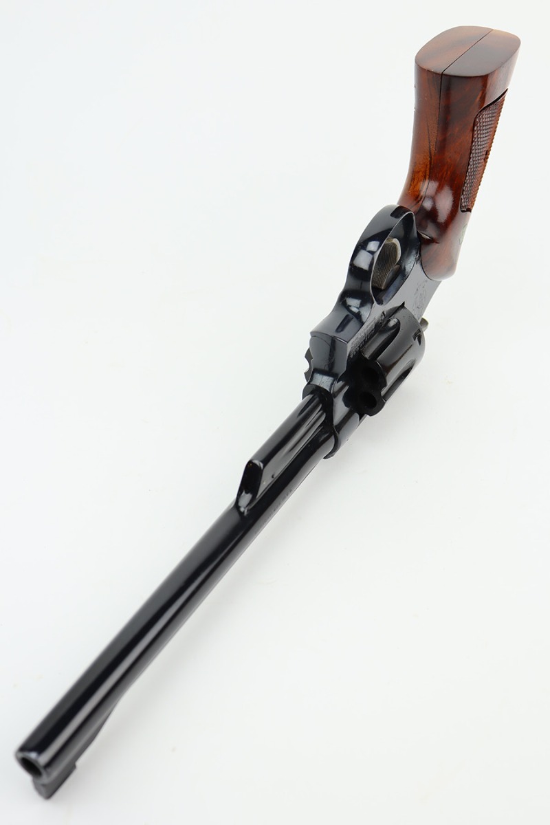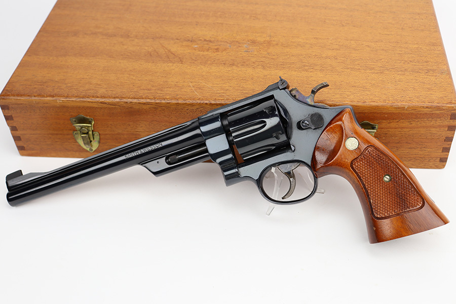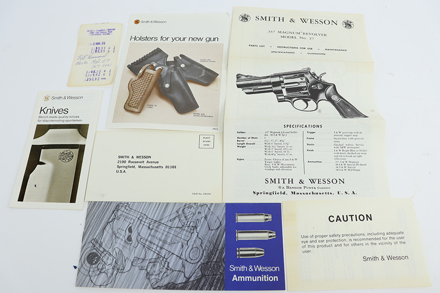 3/11/24 – This is a mint, cased Smith & Wesson 27-2 revolver from 1976. Barrel is 8.25in with mint bore. Hardly even a turn line on the cylinder, with no other finish loss and beautiful case hardening on hammer and trigger. Terrific wood grips. Original case with the manual, cleaning rod and brushes. FFL required.