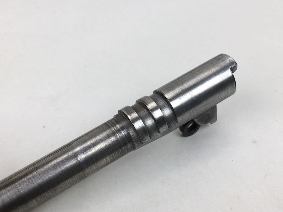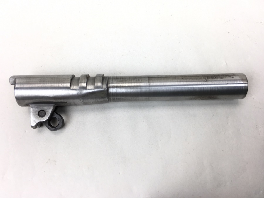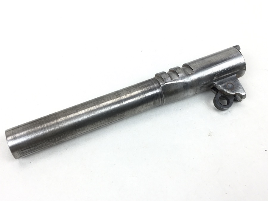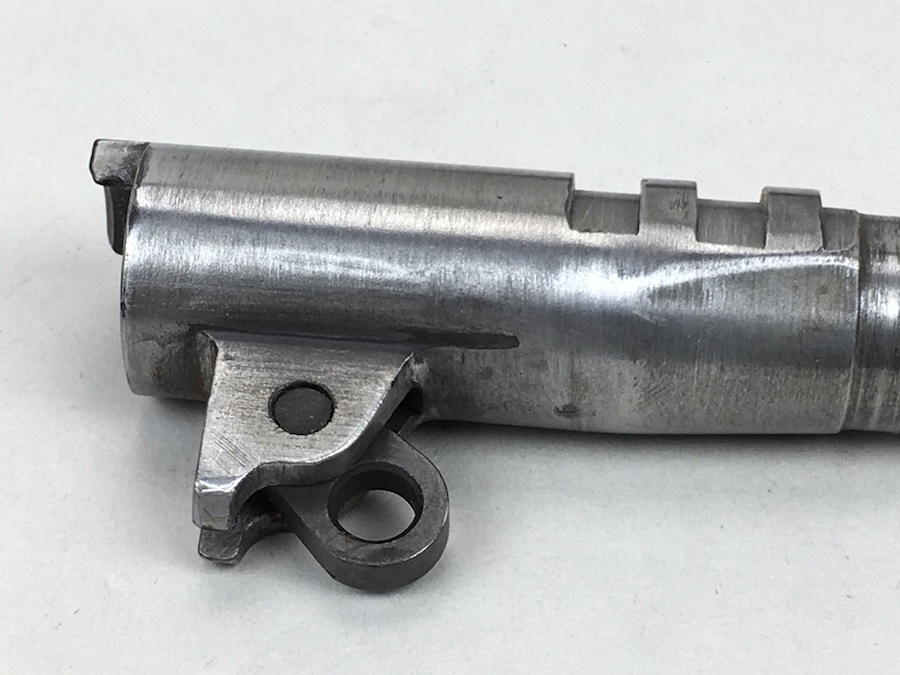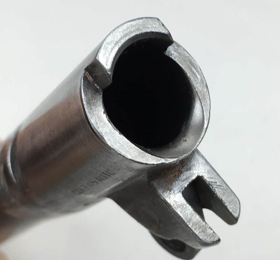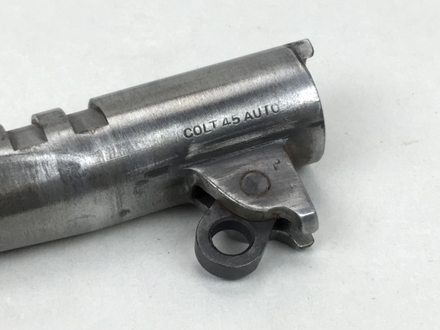 7/29/19 – Original WWII Era Colt M1911 .45 caliber pistol barrel. This has the Colt Barrel Markings for serial numbers 710,000 through the end of production.  1937 through 1945. Good condition showing some use wear, with virtually no bluing remaining. The bore is about a 5/10 with light pitting yet strong rifling. Chamber area and feed ramp in very good condition. Guaranteed Original