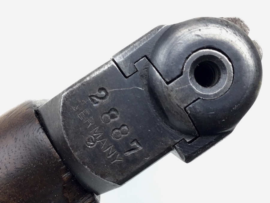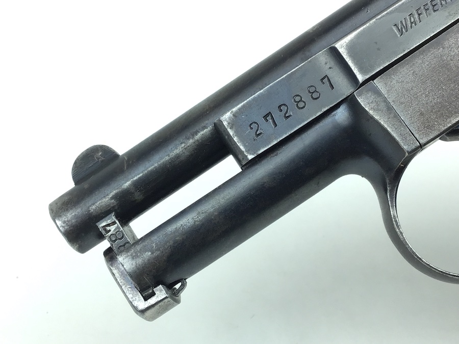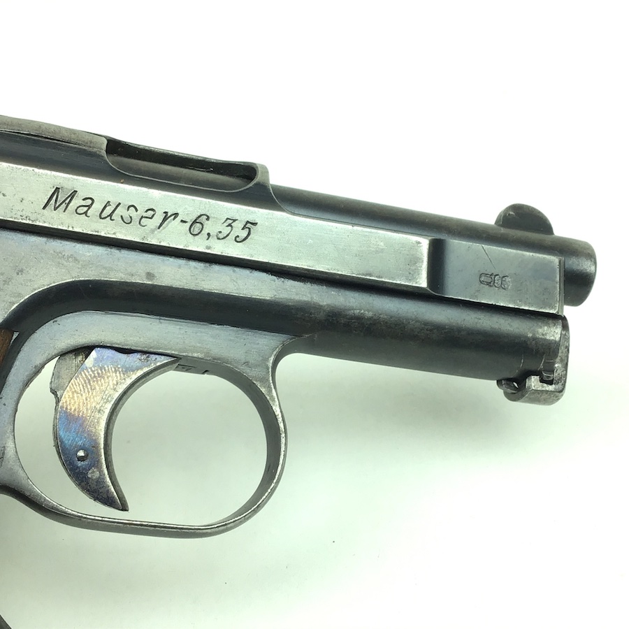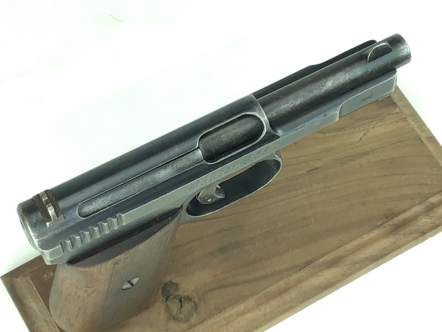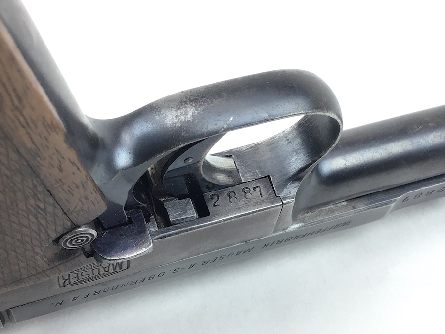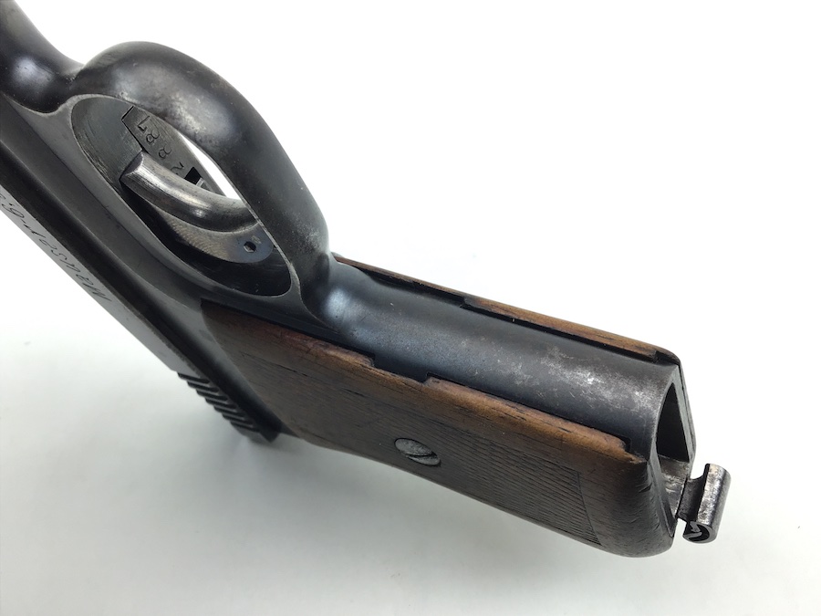 3/5/20 – Very nice, original Mauser 1910. Finish rates about 80% with wear on the frame and high edges of the slide. Fire blue trigger has some wear as well. All matching numbers with original wood grips. The grip checkering is present but somewhat smooth. A small chip is located at the top near the rear. No import marks, but has a “GERMANY” export stamp on the back of the frame. Bore is clean and rates about 6 of 10. Nice original magazine. Fully functional piece.