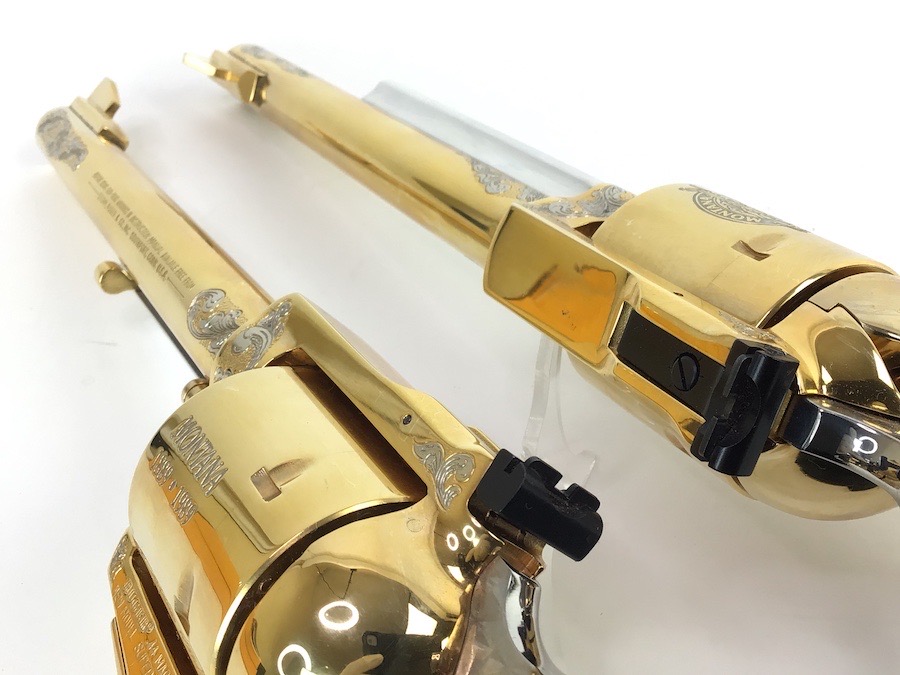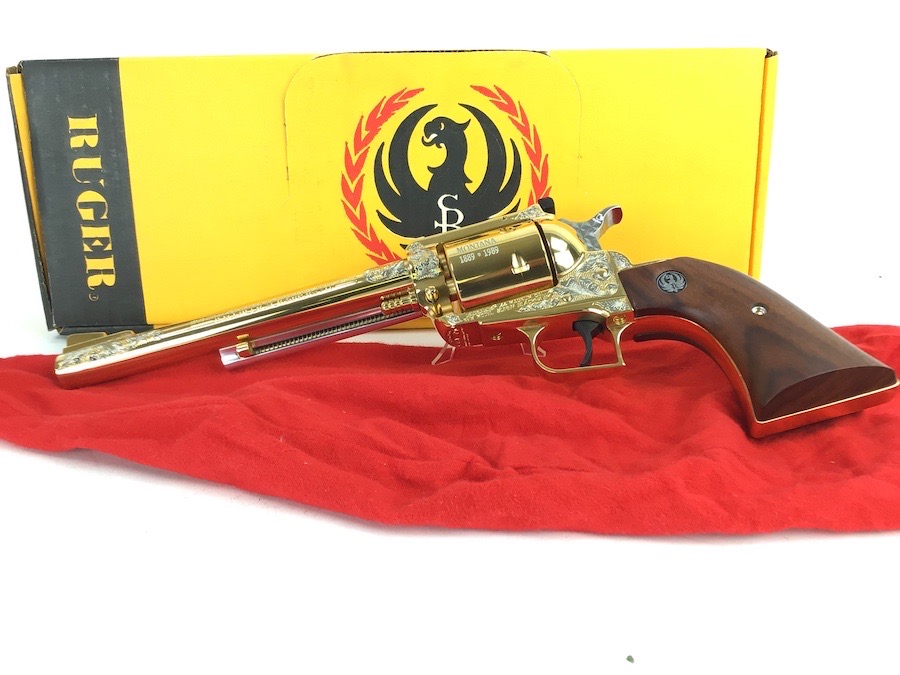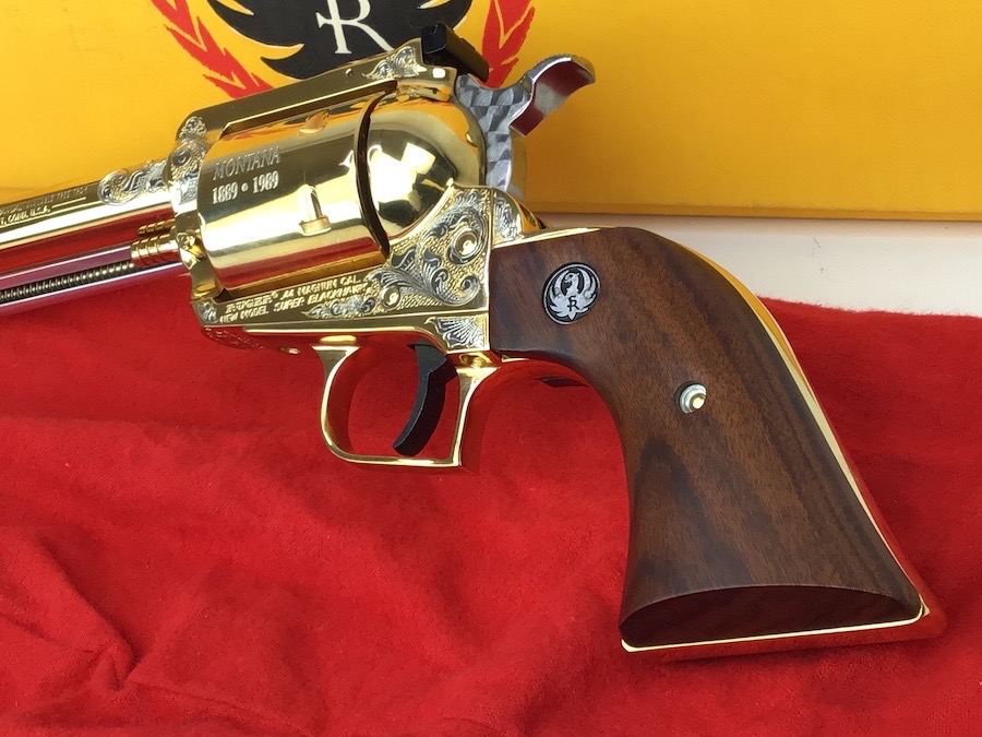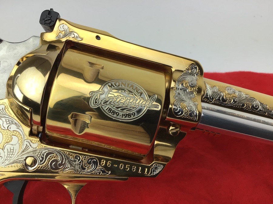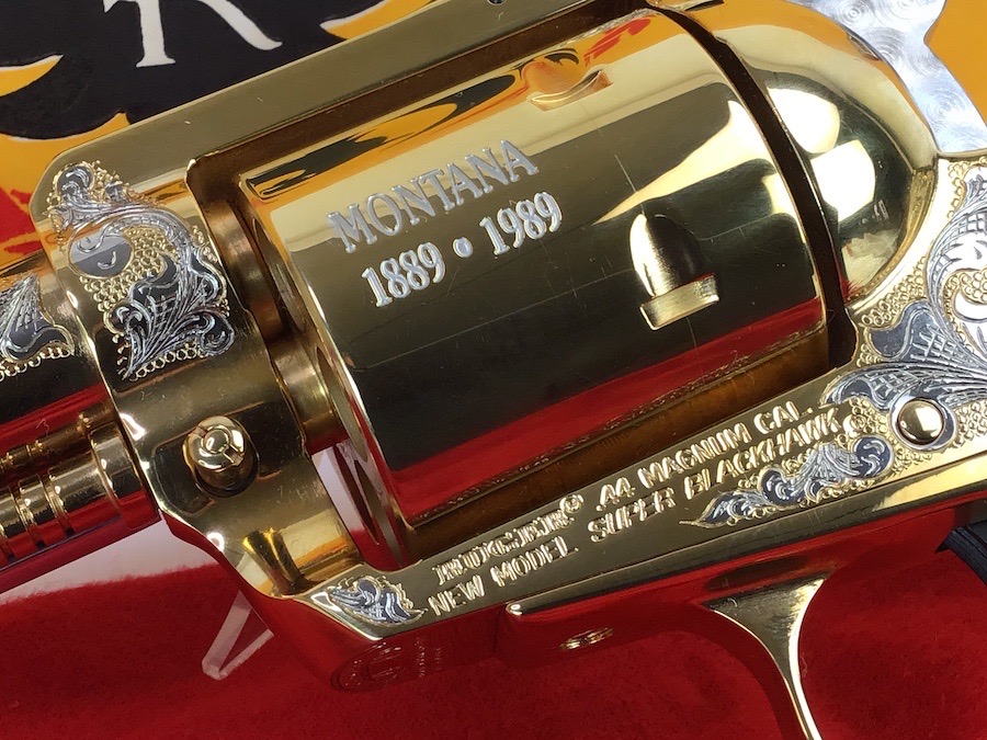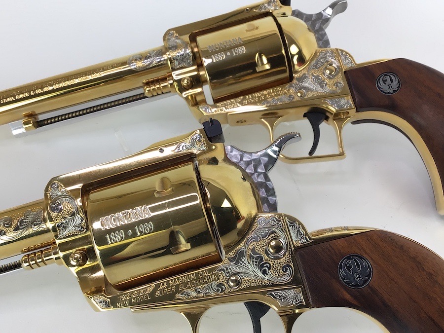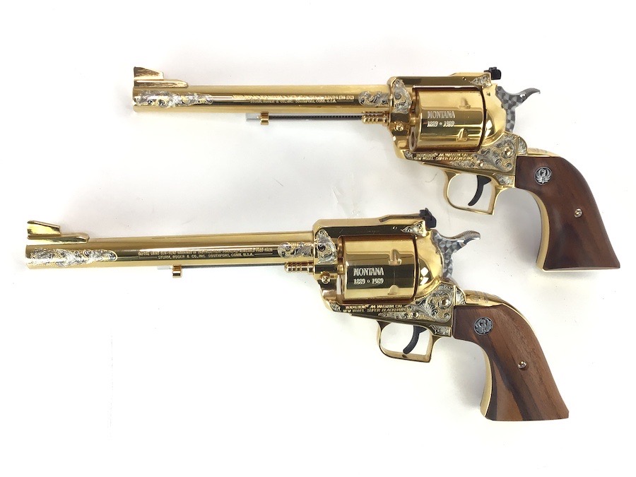 11/7/23 – NIB Ruger New Model Super Blackhawk revolvers. This pair of gold & silver, engraved revolvers are Number 67 & 68 of 250. The engraving was performed by master engraver David Armstrong to commemorate the state of Montana centenial. These beautiful revolvers include original matching boxes with all manuals and paperwork.