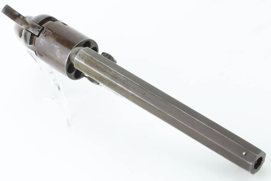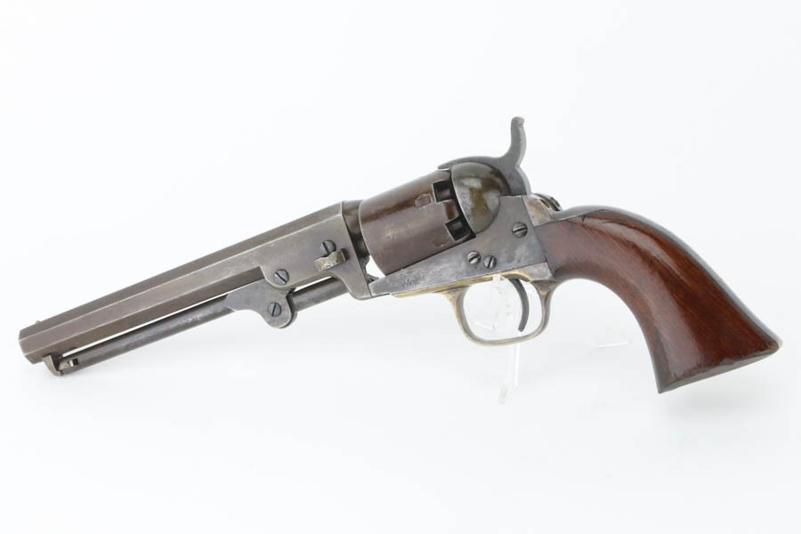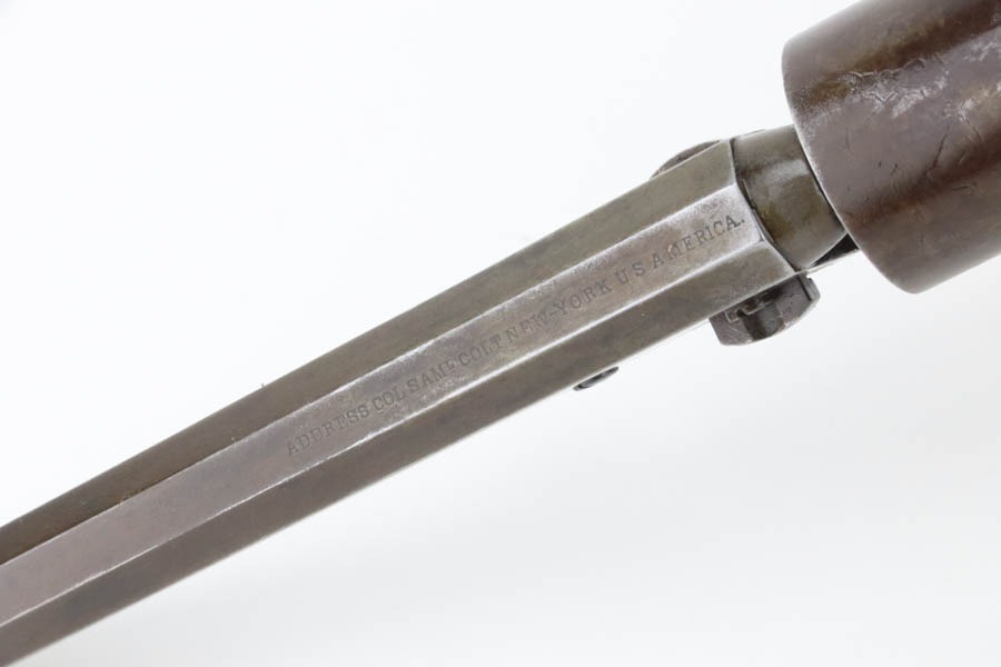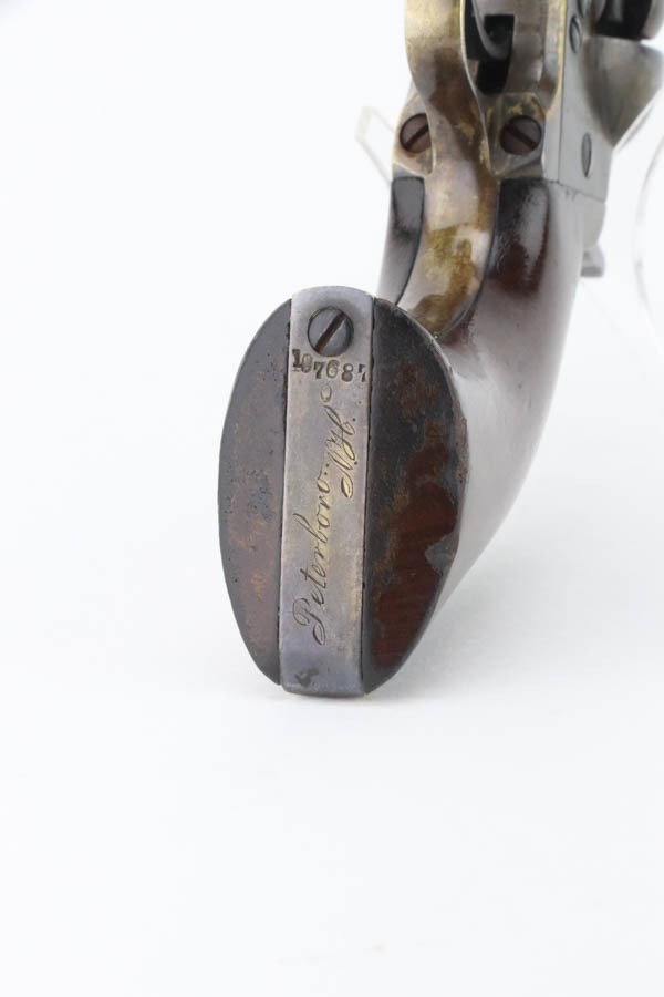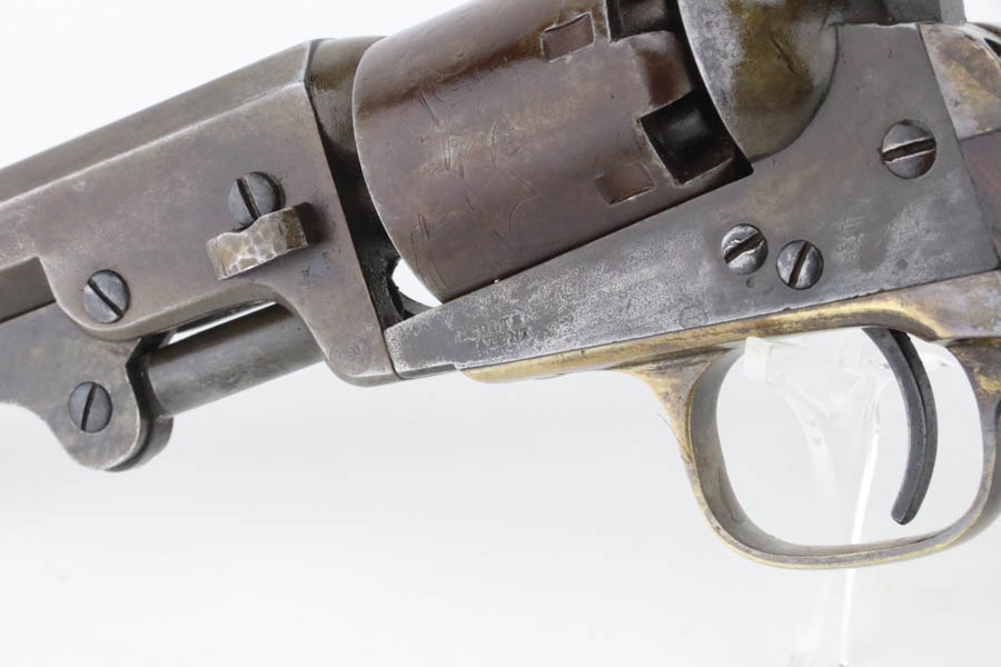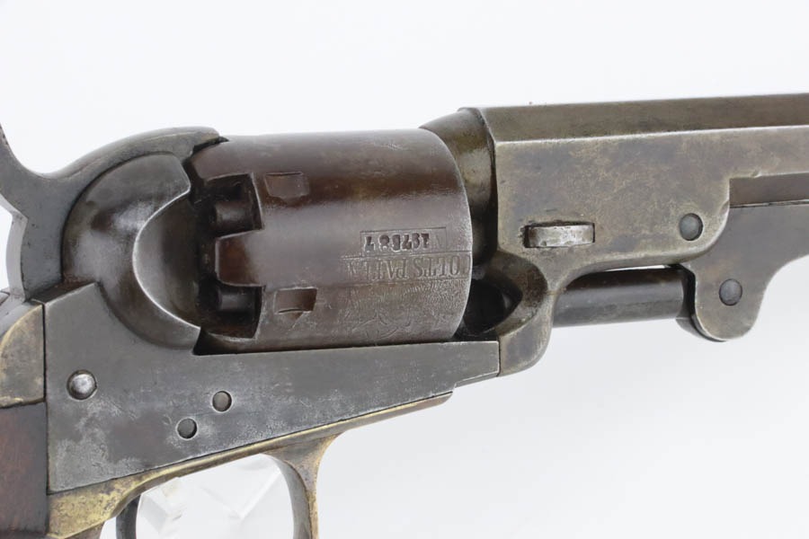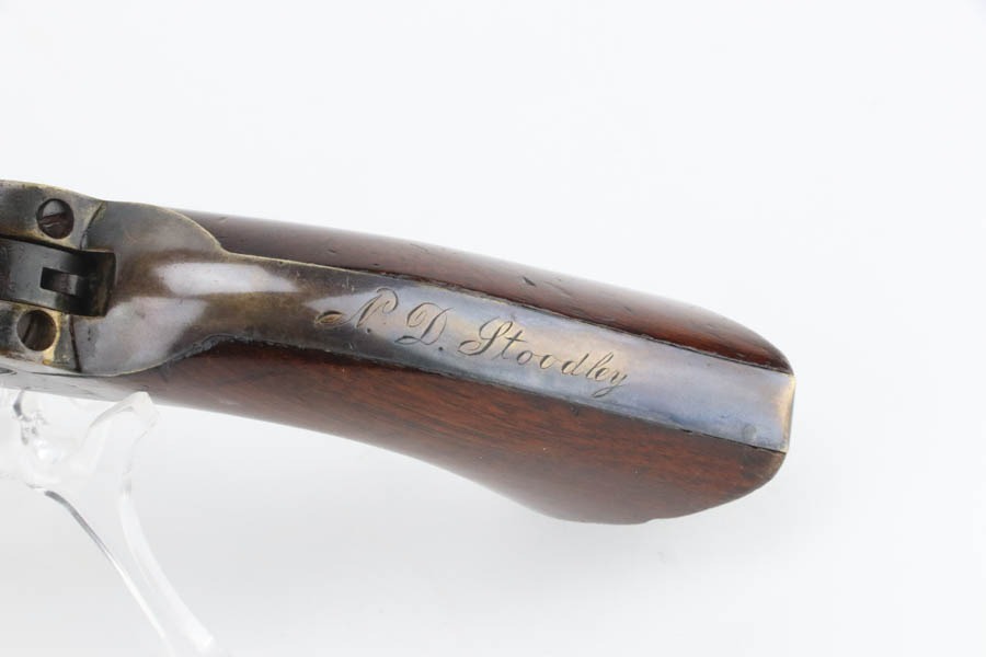 11/21/24 – This is a Colt Model 1849 Pocket Pistol, manufactured in 1862, and verified as the service weapon of decorated Major Nathan Stoodley, used during the Civil War. It is engraved with its owner’s name on the backstrap, and “Peterboro N.H.” on the butt. Mechanically well preserved, both timing and lockup are excellent on this example. The gun itself is in great condition for its age and usage, though minimal bluing or case hardening remains, the metal retains sharp edges, markings, and a well-defined stagecoach robbery cylinder scene. Traces of case hardening remain along the frame’s lower and rear edges. The brass along the backstrap, butt, and trigger guard has developed a rich patina, with some silver remnants in recessed areas. The bore shows fairly strong rifling, but is heavily oxidized throughout. Fitted with an excellent set of tight fitting grips, with minimal handling marks and no major chips or cracks. This listing includes photocopies of attribution tying this weapon to Stoodley through service records, and thorough documentation of Stoodley’s prolific service career.