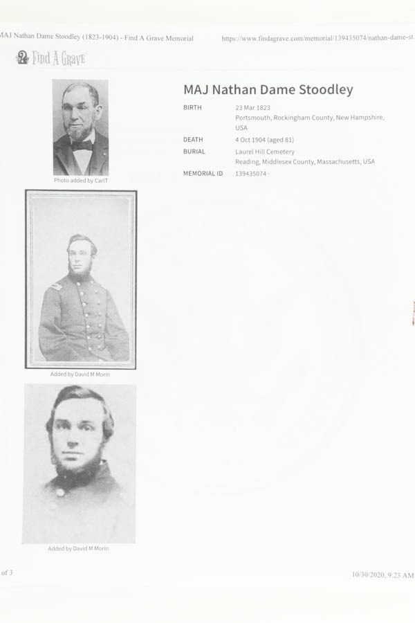 Born March 9, 1823, Stoodley was a shoe manufacturer when he enlisted as a private on August 9, 1862. He organized the 130-man “Company G” of the 13th New Hampshire and was promoted to captain on September 27, 1862, after serving in several major engagements, including Fredericksburg, Drewry’s Bluff, Cold Harbor, Petersburg, and Fort Harrison. The regiment, part of the 9th, 7th, 18th, and later 24th Corps, suffered significant losses, with 5 officers and 84 enlisted men killed or mortally wounded. Stoodley himself was wounded during the Battle of Providence Church Road in May of 1863, and narrowly escaped injury from an exploding shell at Suffolk. At Cold Harbor on June 1, 1864, he attempted to rally his men by having them sing “Rally Round the Flag.” His daring assault on Battery Number Five at Petersburg saw him and a small group of men scale a 40-foot embankment, capturing four guns and 200 prisoners. During the Fort Harrison campaign, he commanded the regiment after the wounding of its major, leading them through intense fighting with heavy casualties (55 of 187 men). Stoodley was promoted to major on October 28, 1864, and served until the regiment mustered out on June 21, 1865, in Richmond, where he acted as division officer of the day during President Lincoln’s visit. After the war, Stoodley resumed the shoe trade in Reading, Massachusetts, where he became a boot and shoe dealer and was appointed postmaster in 1891. Active in organizations like MOLLUS and the G.A.R., he passed away in Reading in 1904.