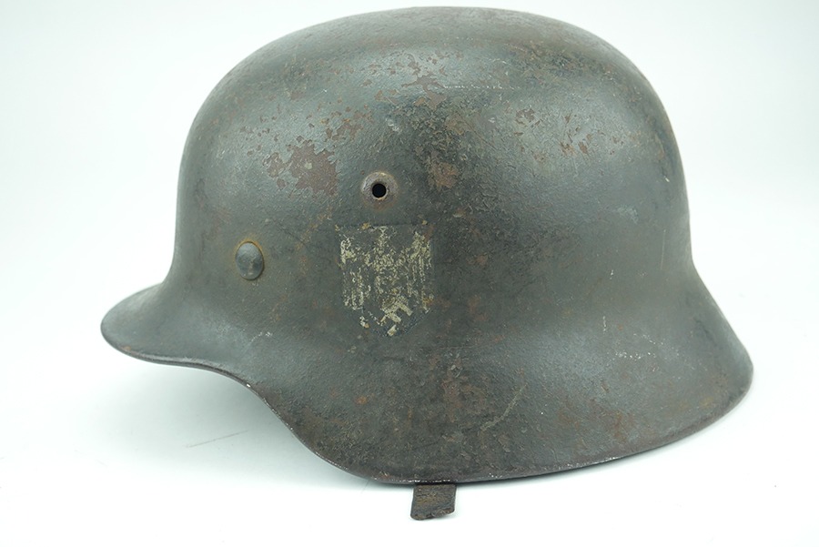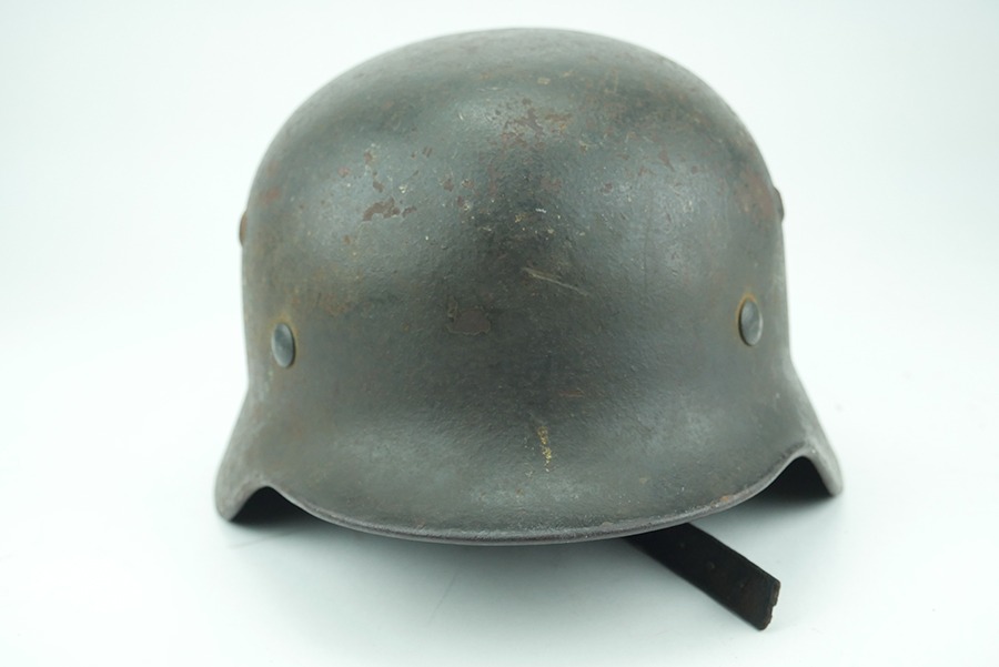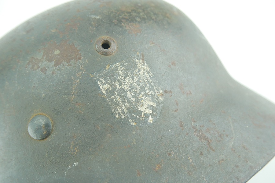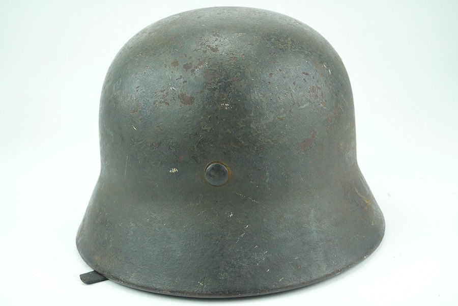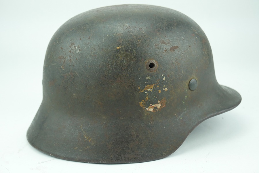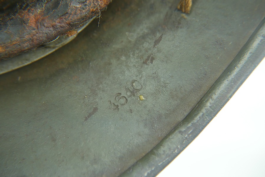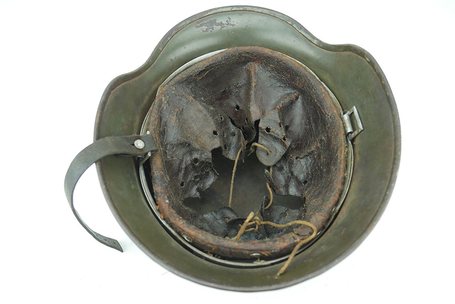 11/20/24 – This is a good example of an M35 German Army Helmet with two exterior decals. The eagle decal on this helmet is still present and is recognizable, however the shield decal is almost entirely gone, with only enough to see that it was once there. The exterior of the helmet retains some of it’s original paint finish, but it does have spots of oxidation throughout. The interior of the helmet still has its liner, but this liner is cracked and is missing portions of leather. A portion of the leather chinstrap is still also present on this helmet. The helmet shell is maker marked “SE62” and heat stamped “4640”.