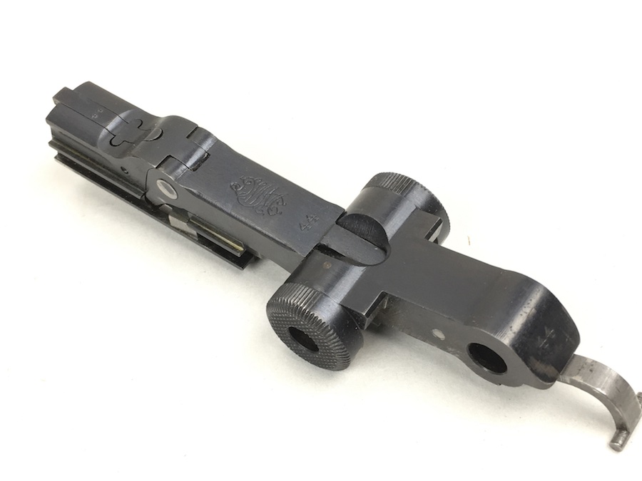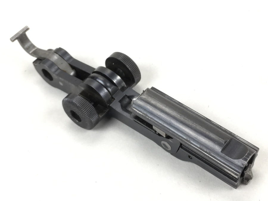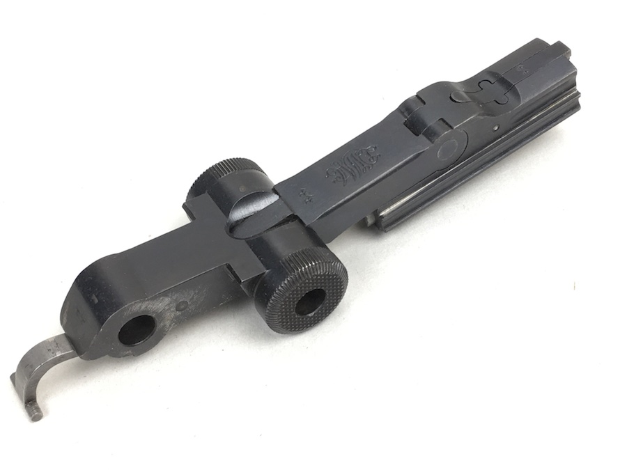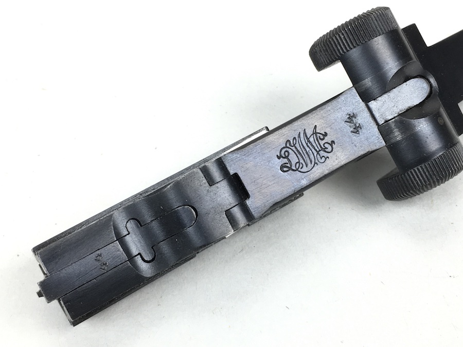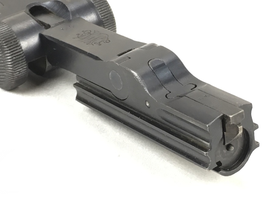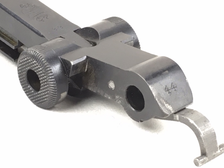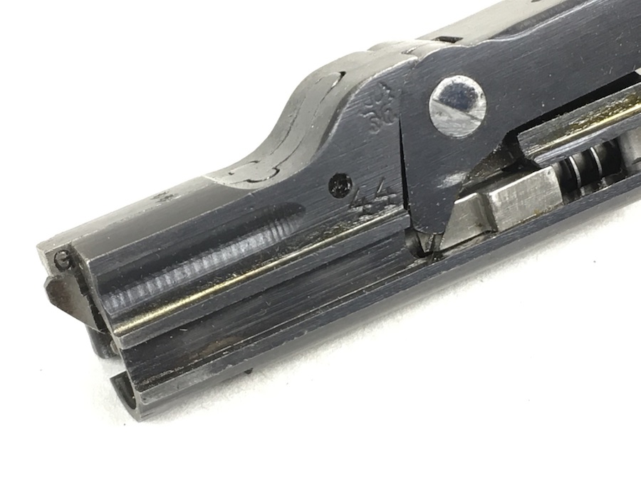 7/18/19 – This is a complete, authentic, numbers matching. (Number 44) Toggle Assembly for a DWM WWI era Artillery Luger. Note, there is no integral rear sight. Bluing is 98% and all pieces function properly. Firing pin is un-fluted and un-numbered. Includes the breech block, extractor, springs, pins, firing pin and coupling link. No rear toggle pin included.