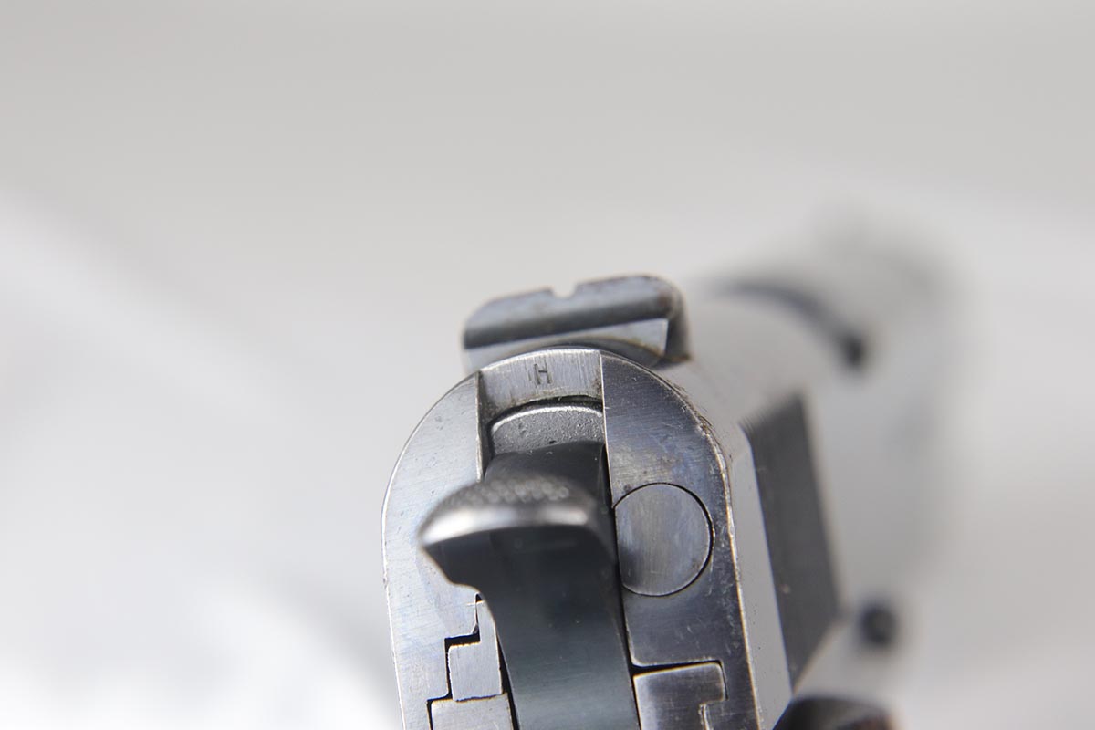 8/8/18 – This is a scarce Colt 1911 from the Great War era, with all original parts and finish.  Manufactured in early 1914, as it has the early slide. Notice the final Patent date is 1911, and not the later 1913 Patent date; making it a rare transitional piece. This pistol has about 80% original blue with minor slide thinning and freckling near the muzzle, as well as a thin front strap.  Correct slide with H proof, as well as the correct HP marked barrel, which is faintly stamped and has lost most of its finish.  Original grips do show some age but no major cracks or chips.  Bore has strong rifling but some minor corrosion in grooves.  Two-tone magazine.
