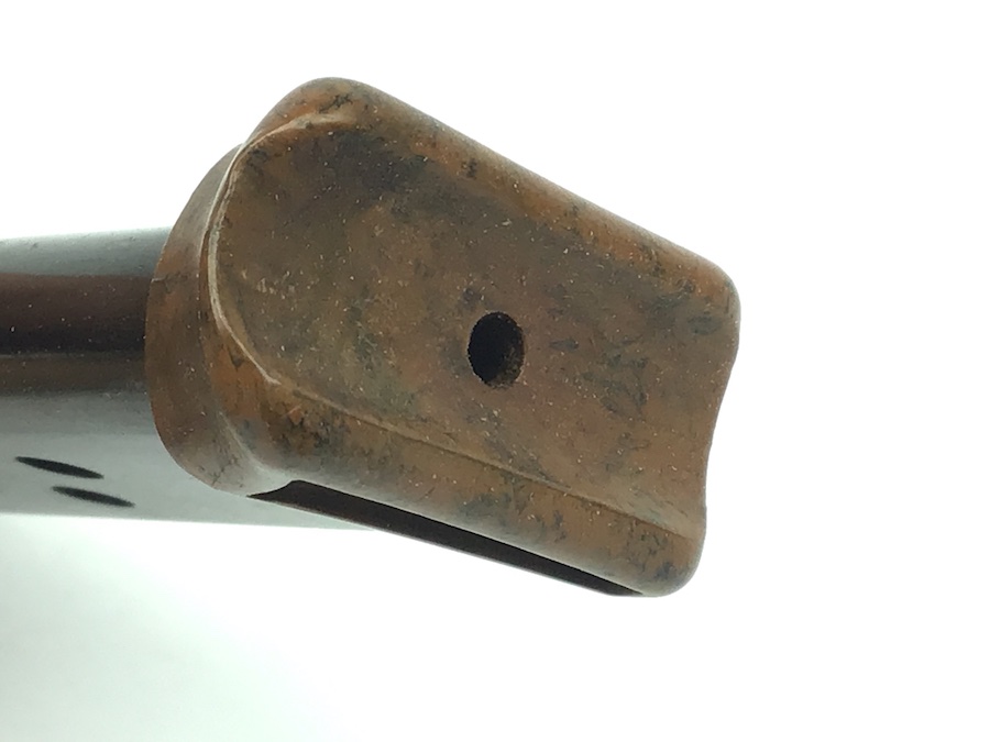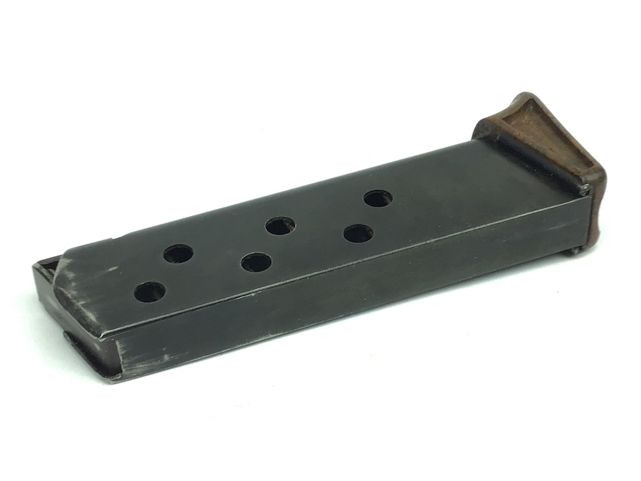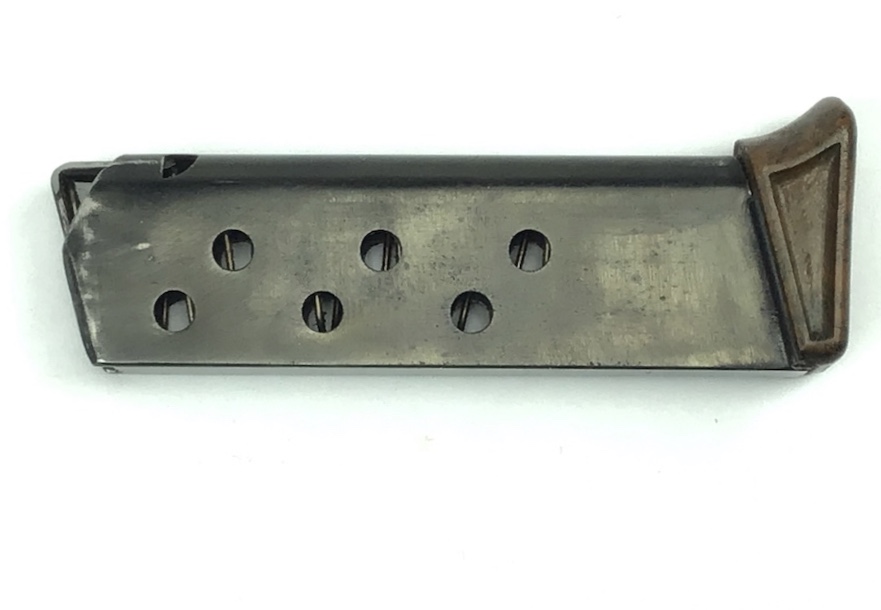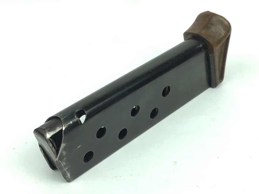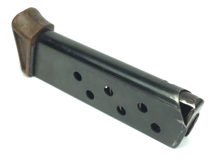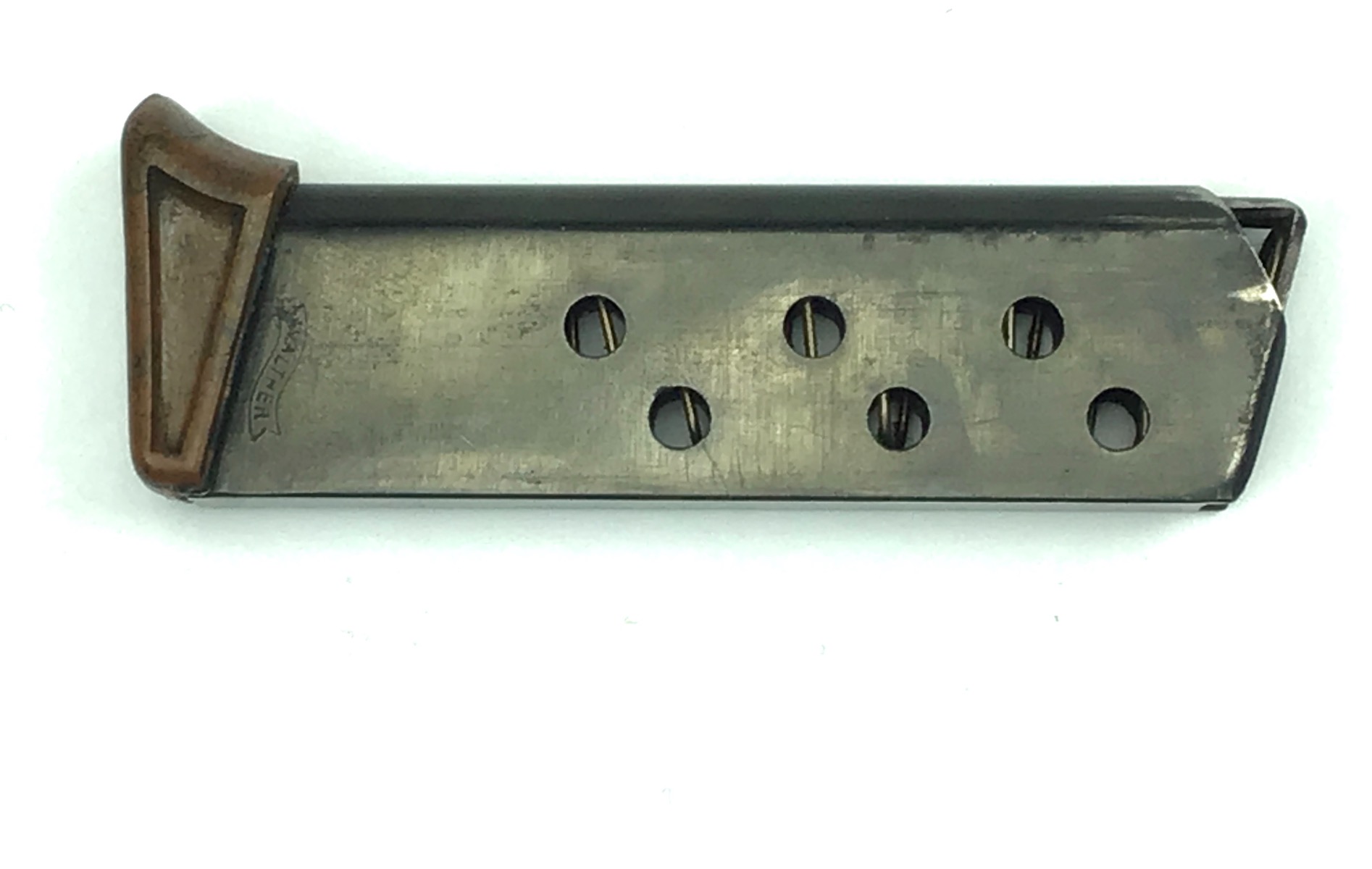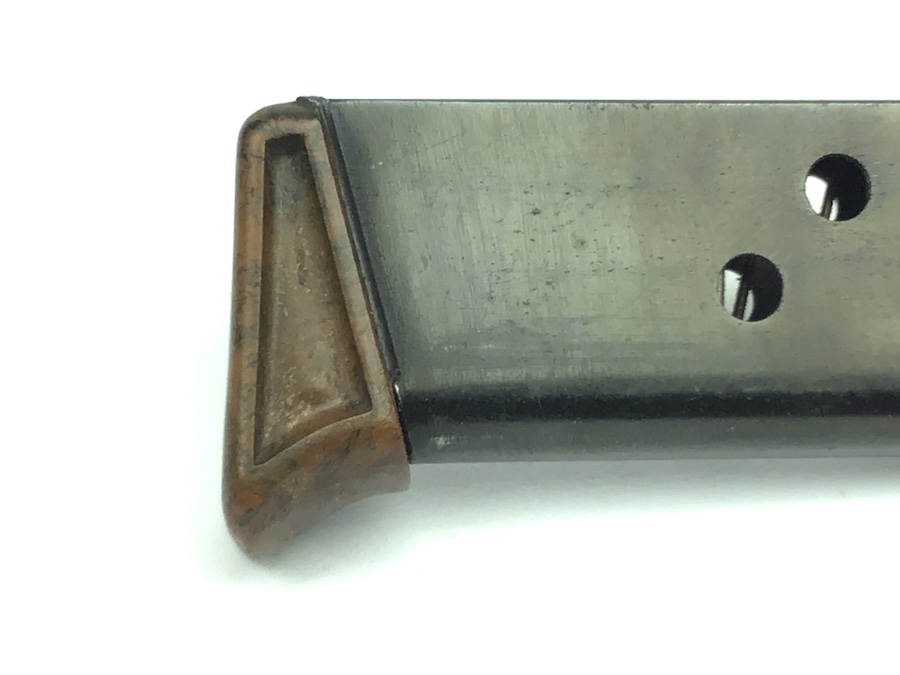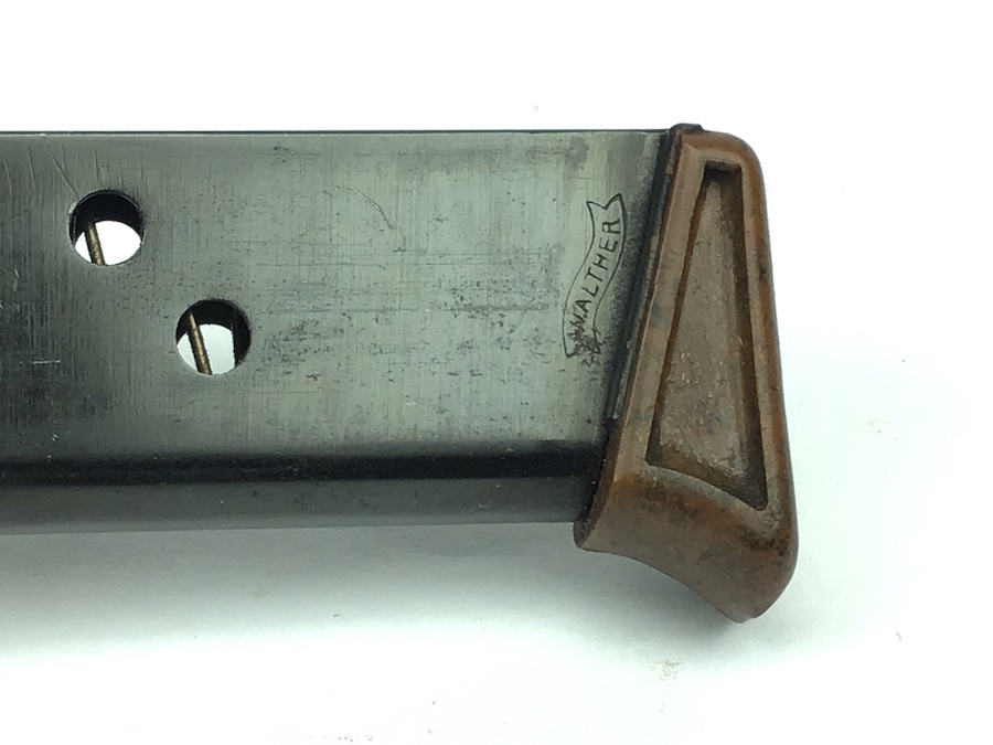 9/15/20 – This is an excellent, early / pre WW2 manufactured Walther PPK magazine. The magazine has a high polish finish with a Walther banner stamped on one side. The brown bakelite finger extension has excellent color with no flaws. This is the thin lip style. Fully functional, strong spring.