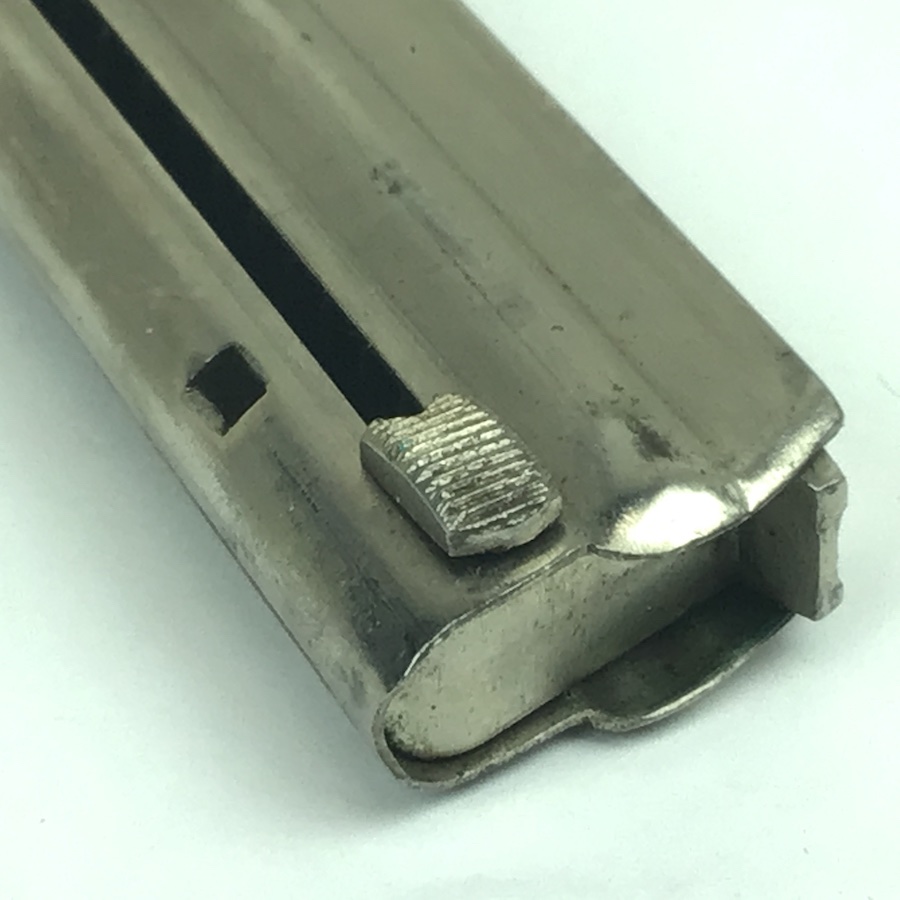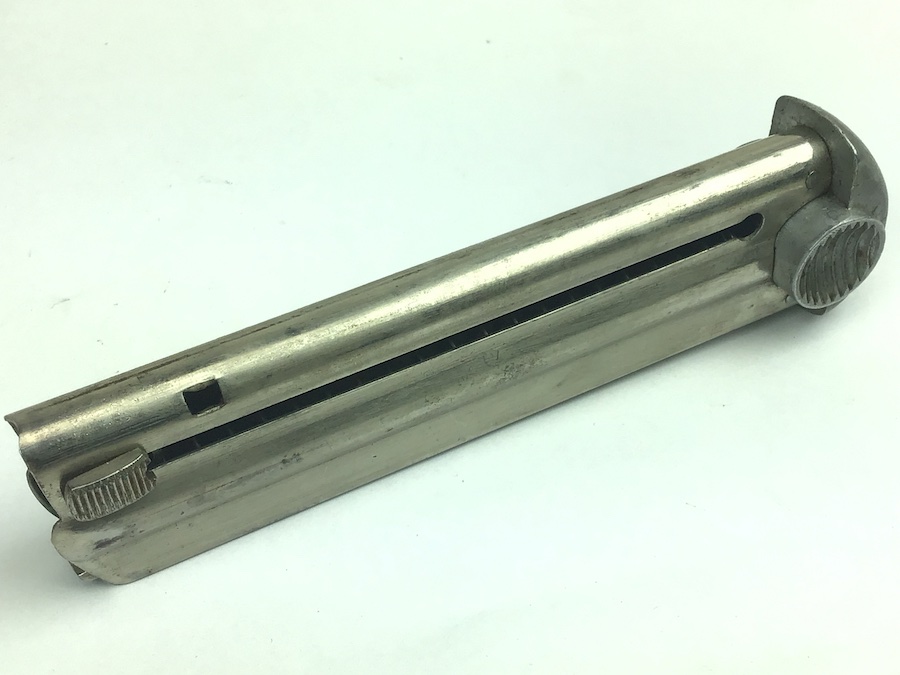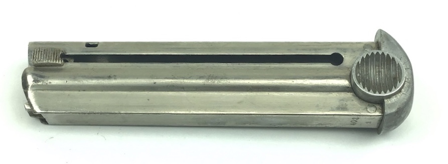 7/15/20 – This is an earlier / pre WW2 style T14 Nambu magazine. The magazine has a nickled tube that’s in great condition. There’s only minor discoloration spots – as shown in photos. The spring is strong and fully functional. The spine of the magazine has serial number “403”. This magazine is in great overall condition. Guaranteed original and authentic.