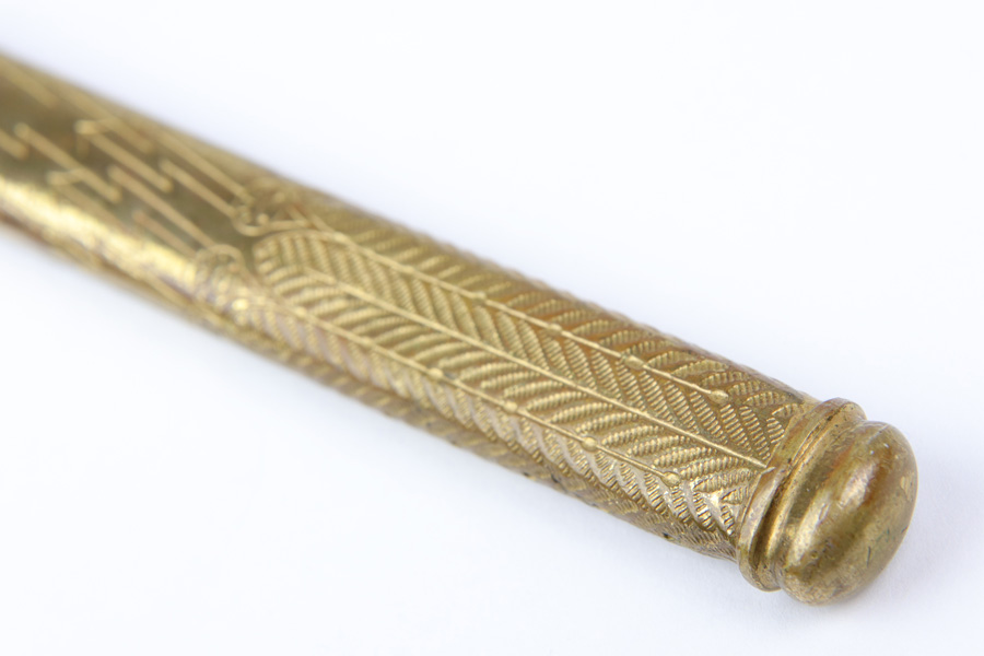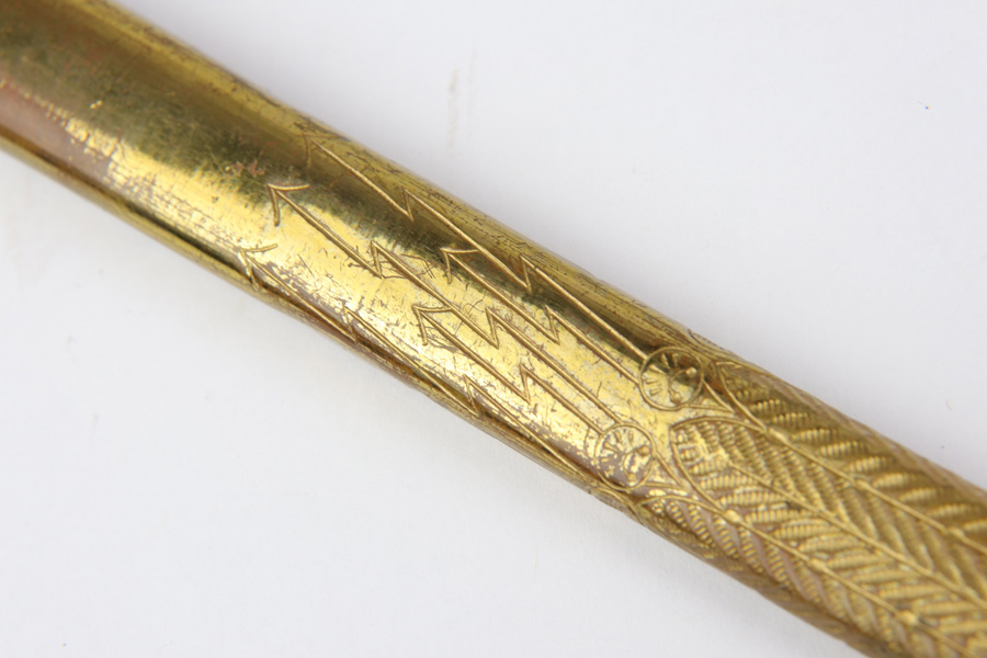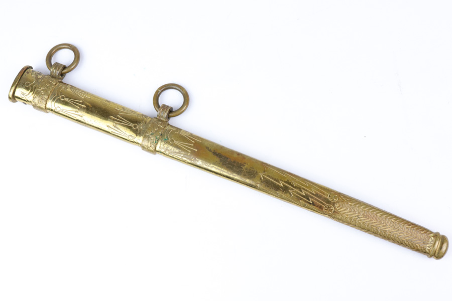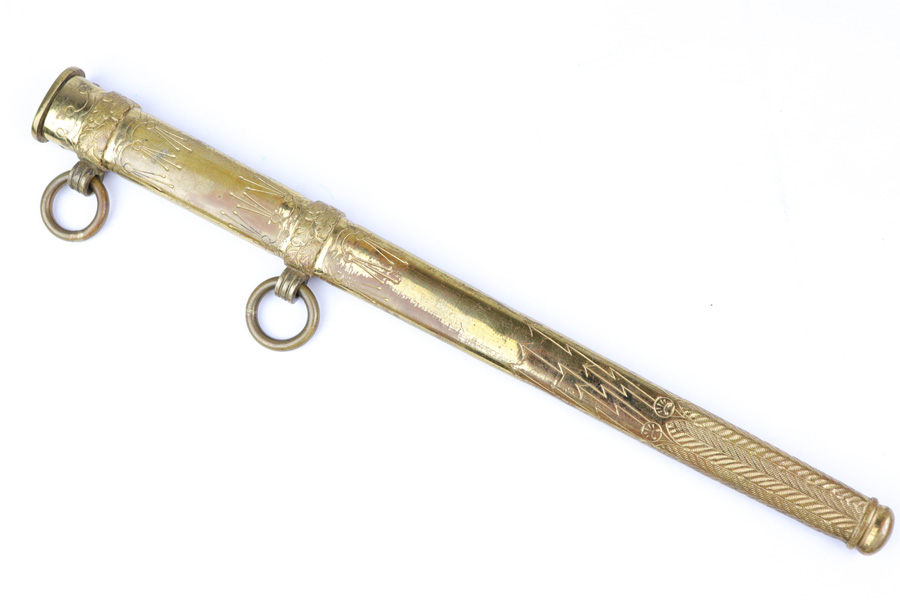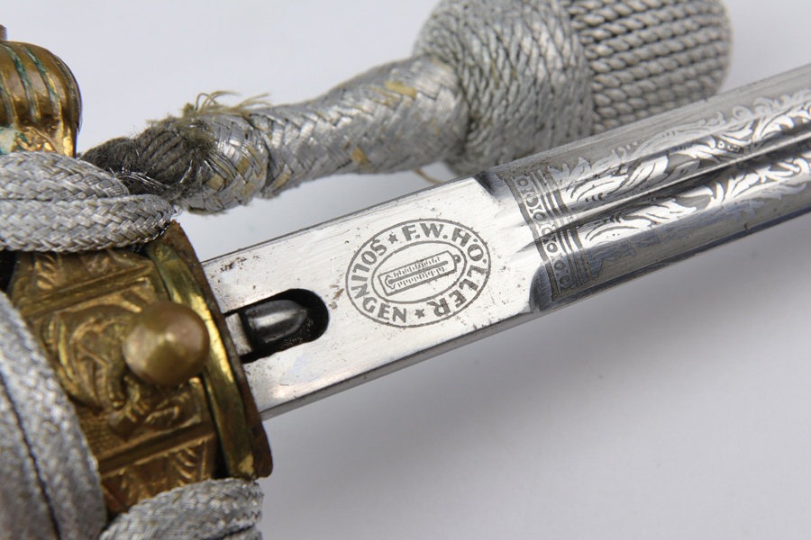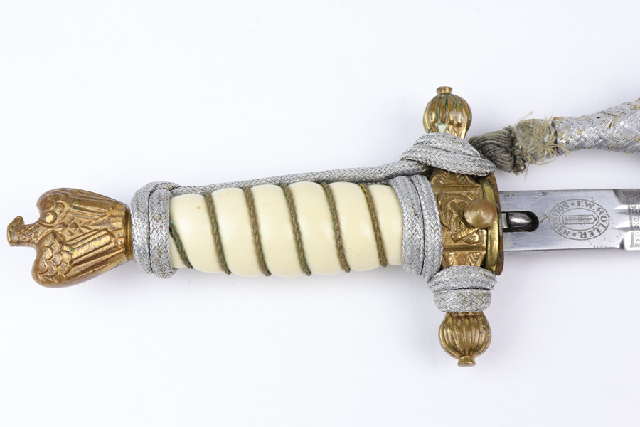 10/30/18 – This is an original Kriegsmarine dagger with an etched blade, original portepee, and scabbard. The dagger has a very nice bakelite handle absent of cracks or chips. The portepee has some light fraying on a few small areas of the string, with the worst being just before the knot, but the knot is excellent. The blade is excellent and etched on both sides. One side is maker etched by F.W. Holler. Minimal blade oxidation. The largest flaw on this piece is found on the scabbard, which is bent downward starting about 2.5 inches from the tip. There’s a few small dents on the scabbard in general, but the blade still fits with no issue. Guaranteed all original and authentic.