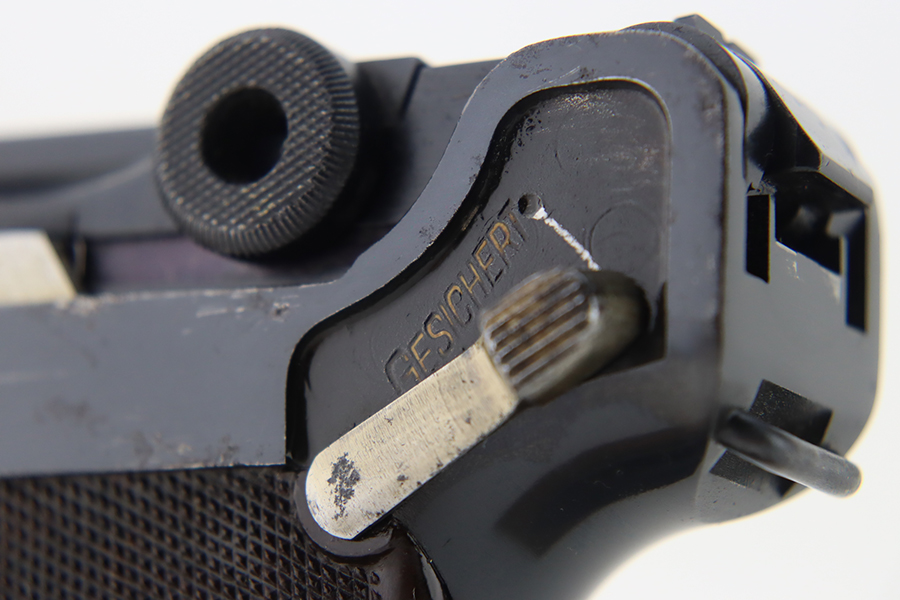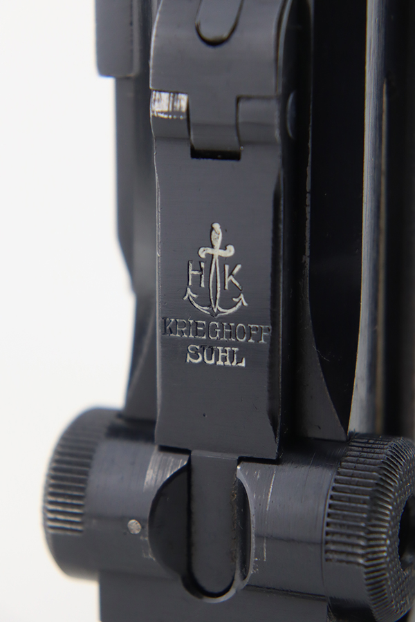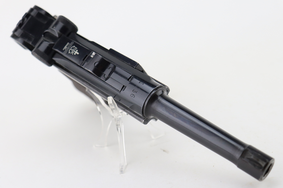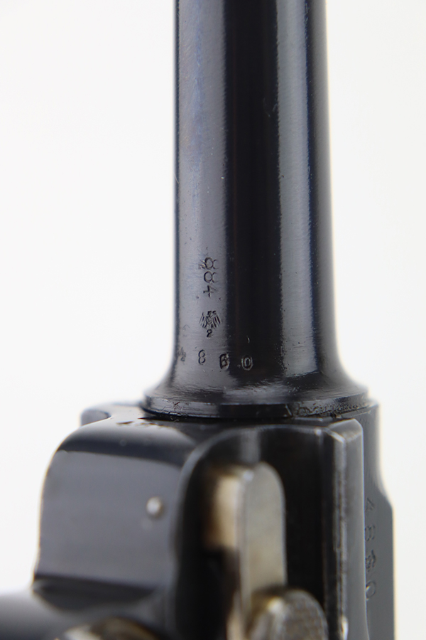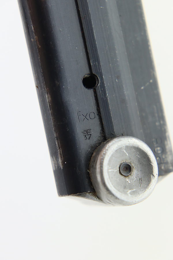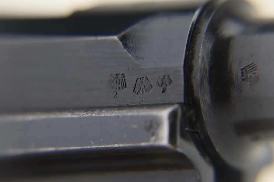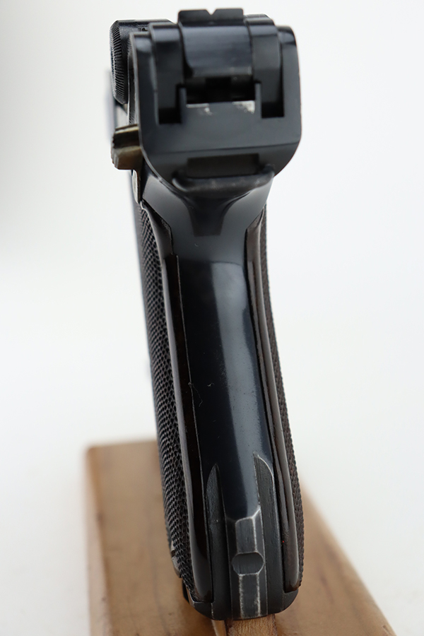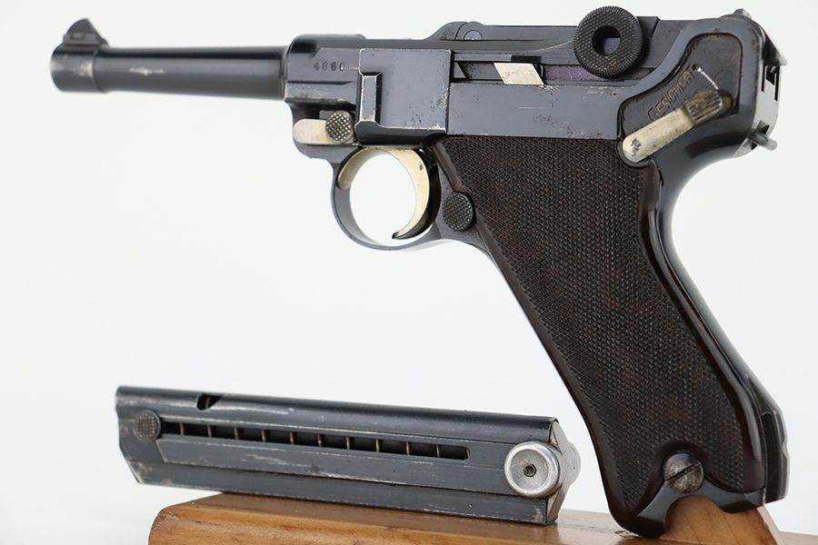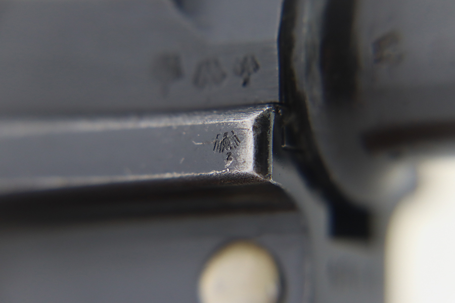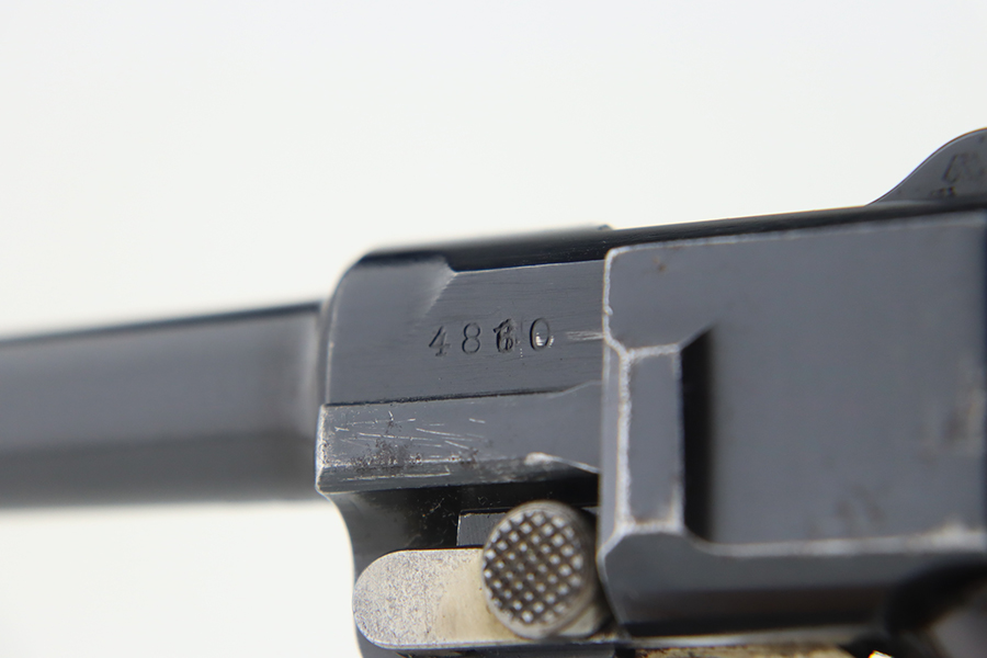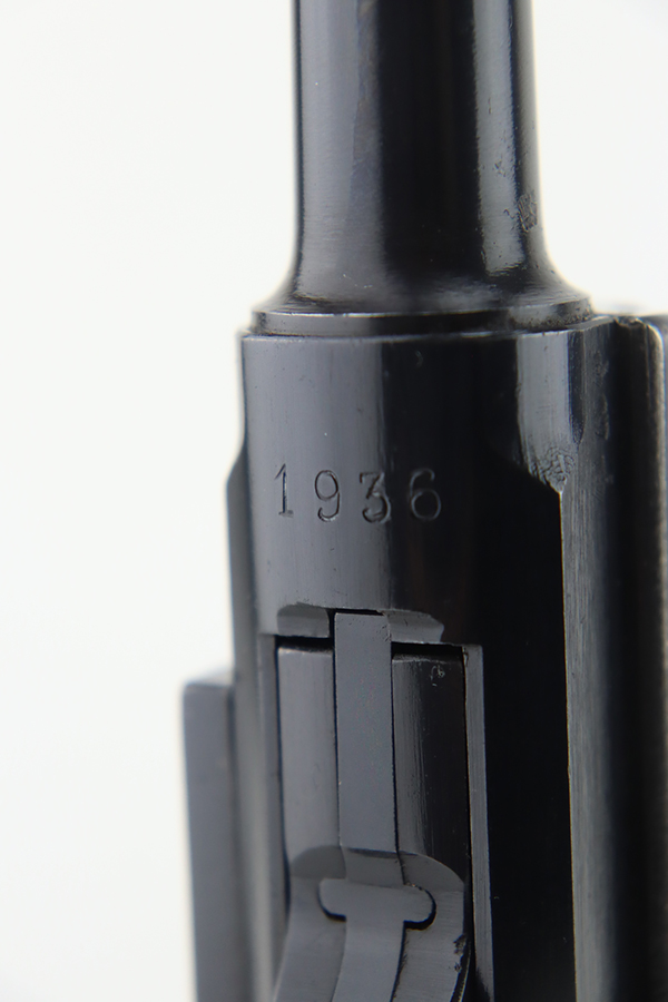 1/22/24 – This is an all matching and original example of a rare Krieghoff Luger from 1936. It’s one of only 2,500 or so produced with 1936 chamber date. Its original finish rates about 96% with minor muzzle wear, very minor wear on some of the high edges, and some tiny scratches and tiny pits on the left side of the frame and on the side plate. Fitted with excellent period-correct bakelite Krieghoff grips. Comes with a blank-bottom fxo magazine. Excellent bore with great rifling.