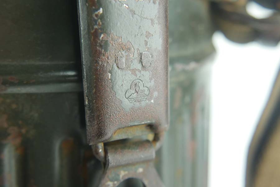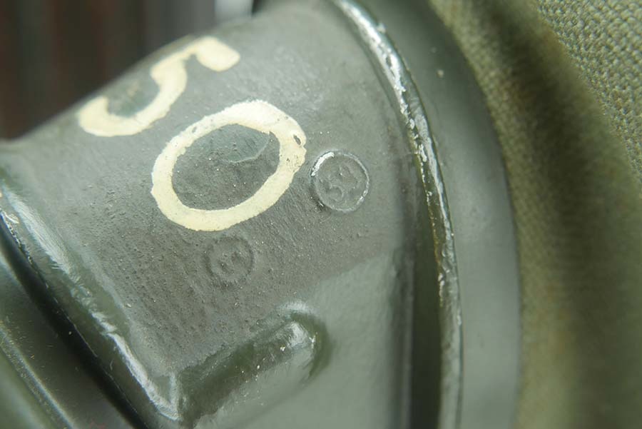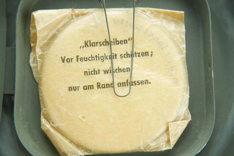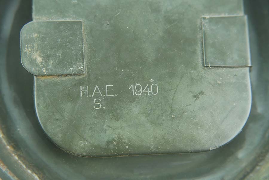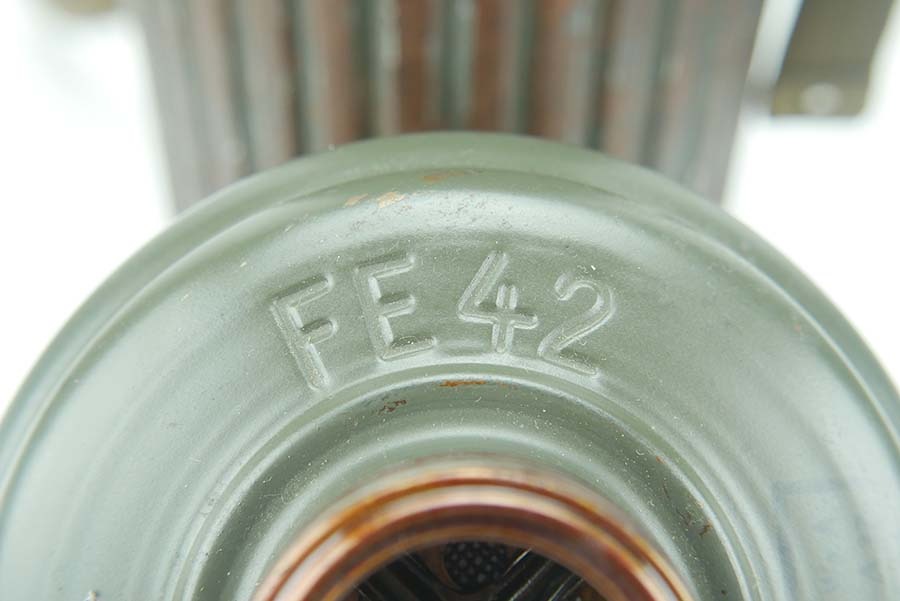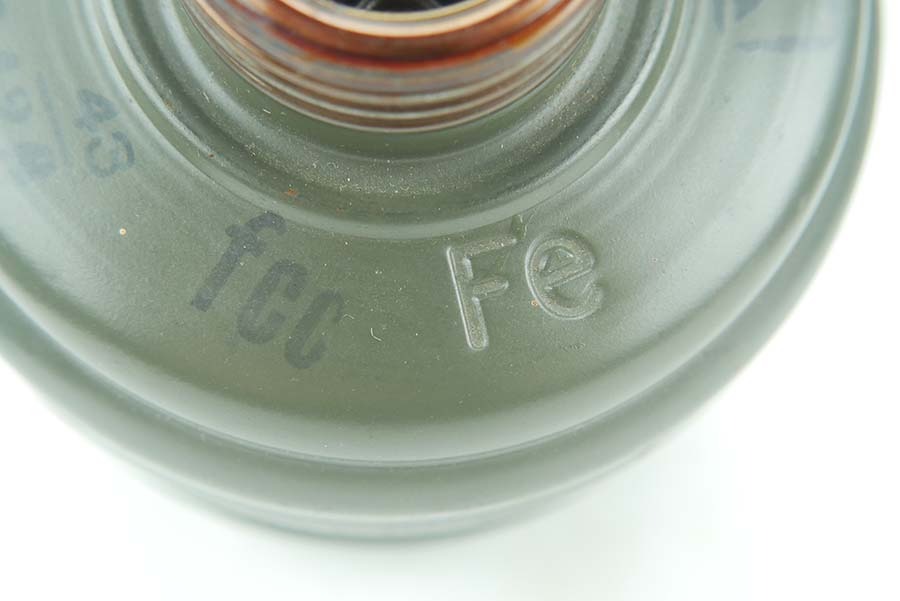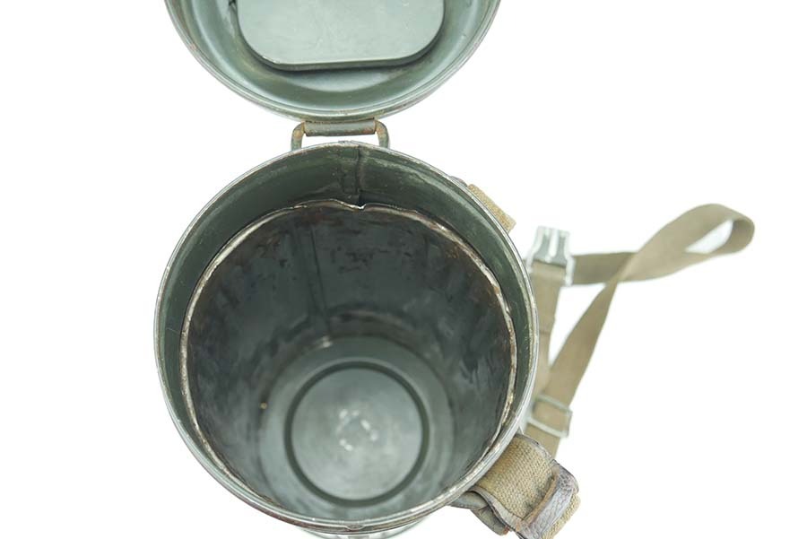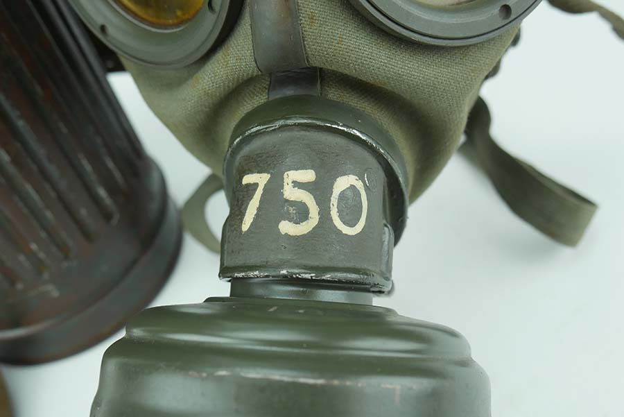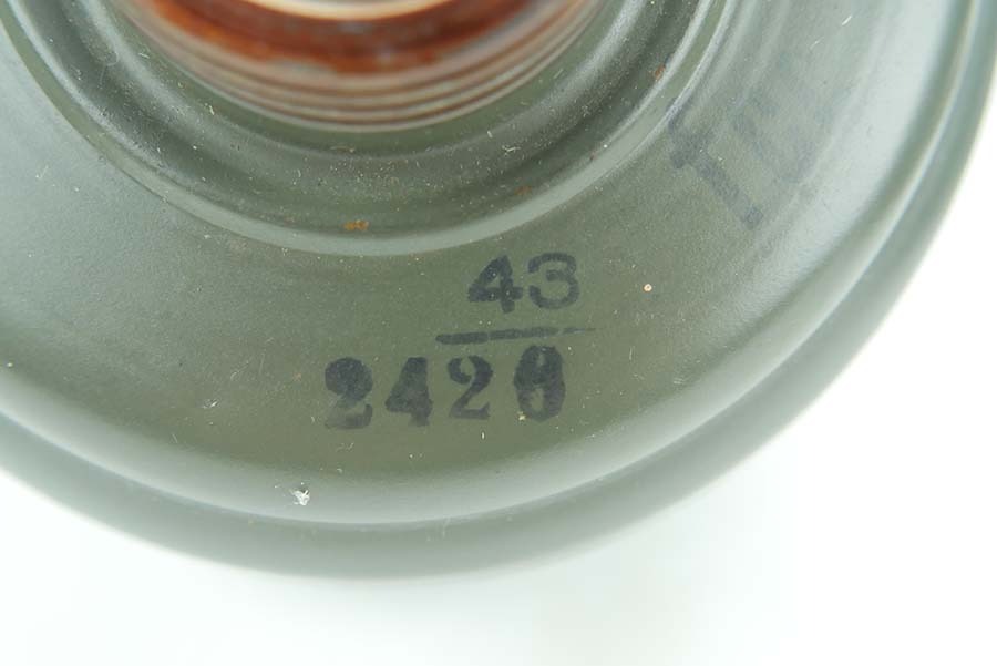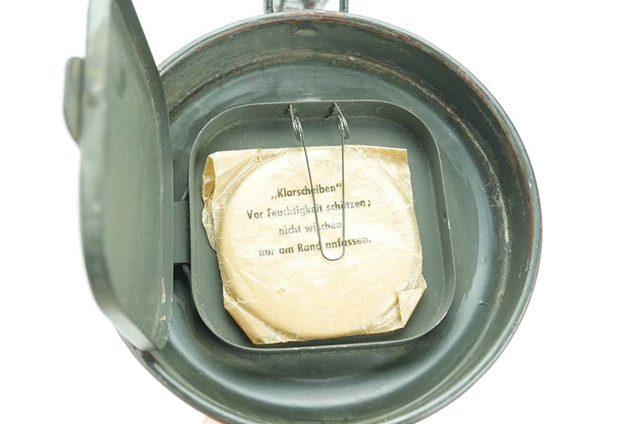 12/4/24 – This is a really nice example of a 1939 dated German gas mask with the original case. The mask is in very good condition as shown with all straps intact. The removeable filter is 1943 dated and stamped “FE42”. The filter unscrews . Excellent eye lenses as well with the spares included under the container cap. The original case comes with this gasmask as well, both the case and the mask have a matching number painted on them. The case tube is in good condition, but does have oxidation in multiple locations. Case includes the original cloth straps.