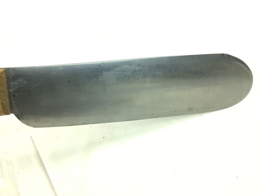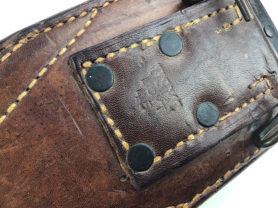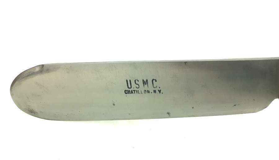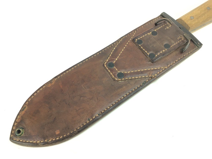 9/5/24 – This is an original USMC issued Bolo knife from WW2. This example is in excellent condition. This is likely because it was made at the end of the war, and didn’t see much use as a result. The blade has some very mild spots of oxidation but is otherwise excellent. USMC stamped from Chatillon, N.Y. on one side. The wood handle is minty and without issue. Comes with an equally excellent leather scabbard that’s USMC BOYT maker stamped and 1945 dated.
