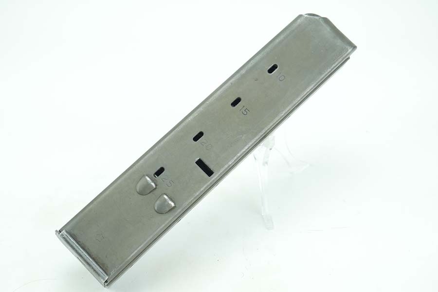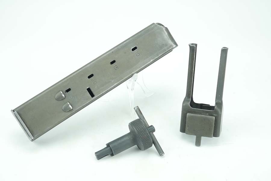 12/3/24 – This is an excellent example of an Uzi magazine and accessories. This magazine retains its original finish with only minor wear from standard use. In addition this magazine also comes with a loading adapter as well as the front sight tool for an Uzi SMG. Both of these accessories are also in excellent condition.