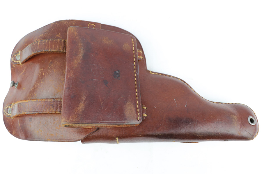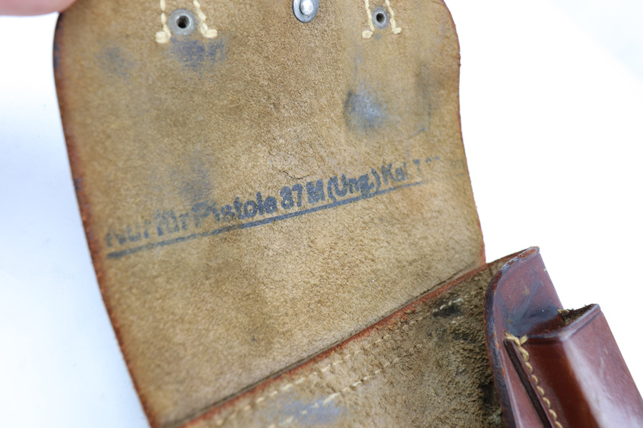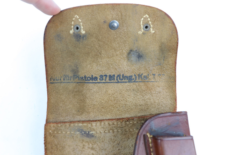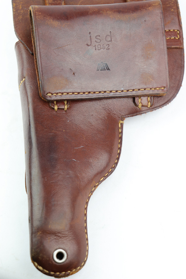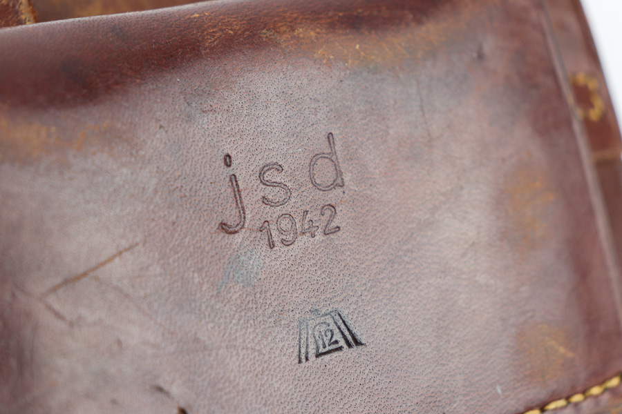 1/7/19 – This is an original WW2 production leather Femaru model 37 holster. The holster is ink stamped on the interior which designates use for a M37 7.65mm pistol. The back belt loop is “jsd” maker stamped for Gustav Reinhardt Lederwarenfabrik and 1942 dated. There is also a luftwaffe eagle proof stamp below the date. Crisp stamps and guaranteed original. The leather is pliable and soft with normal wear and signs of use. All original leather and stitching in tact. Guaranteed original and authentic.