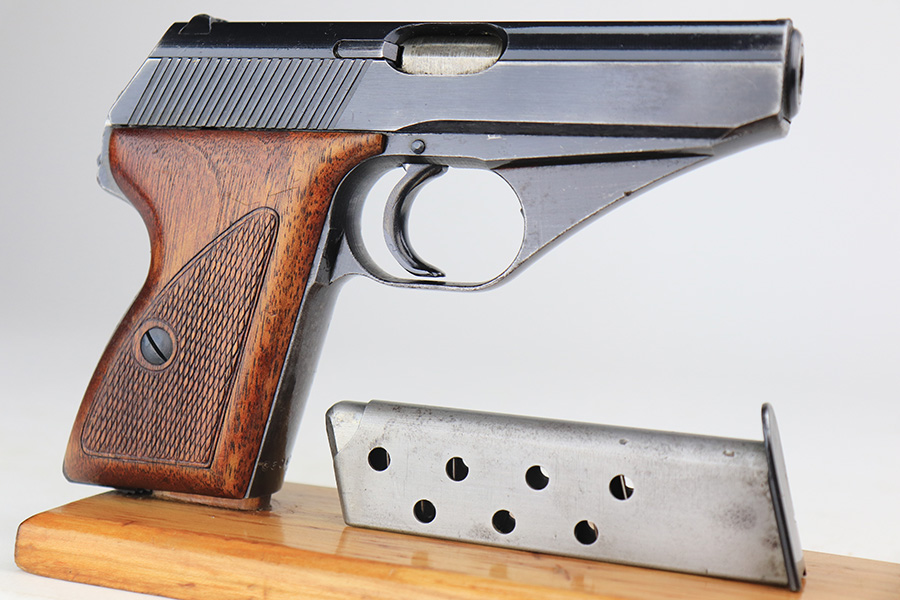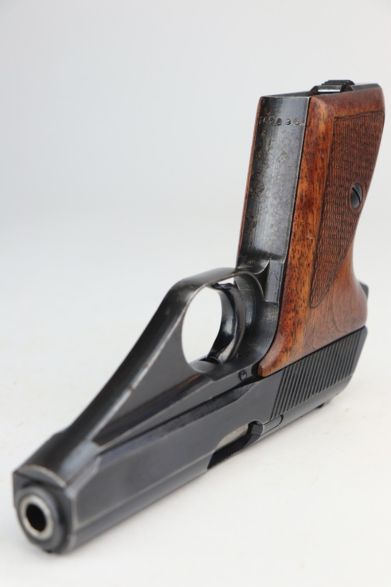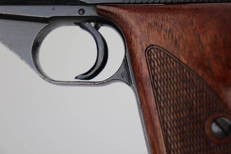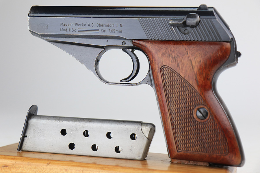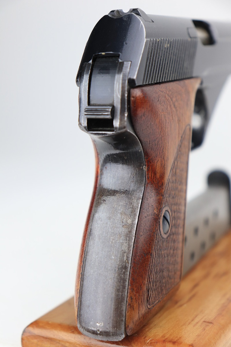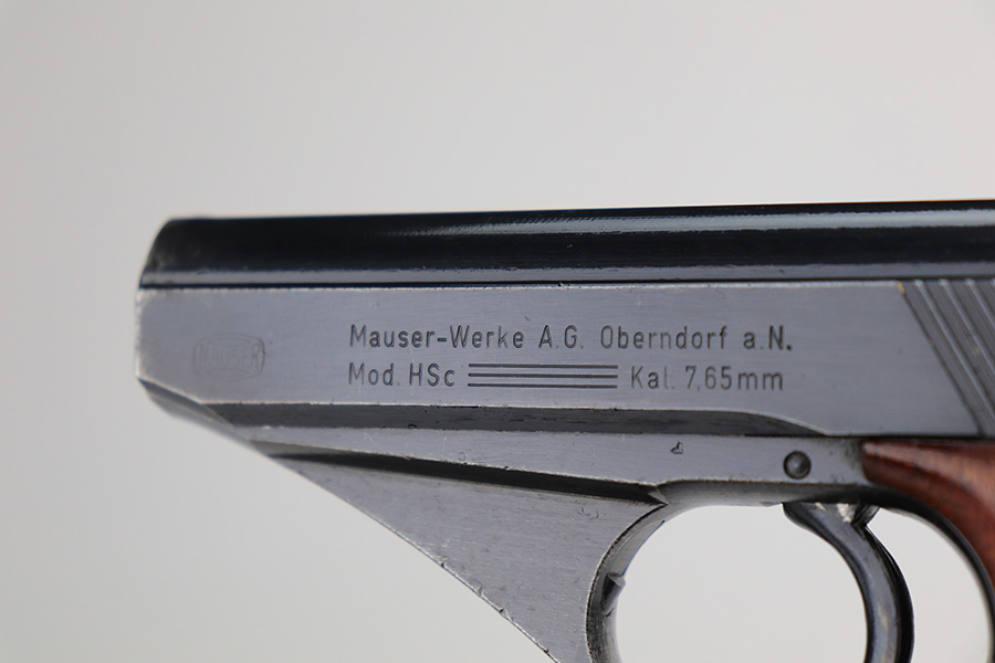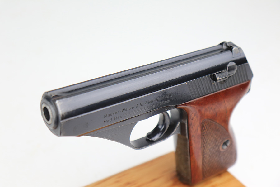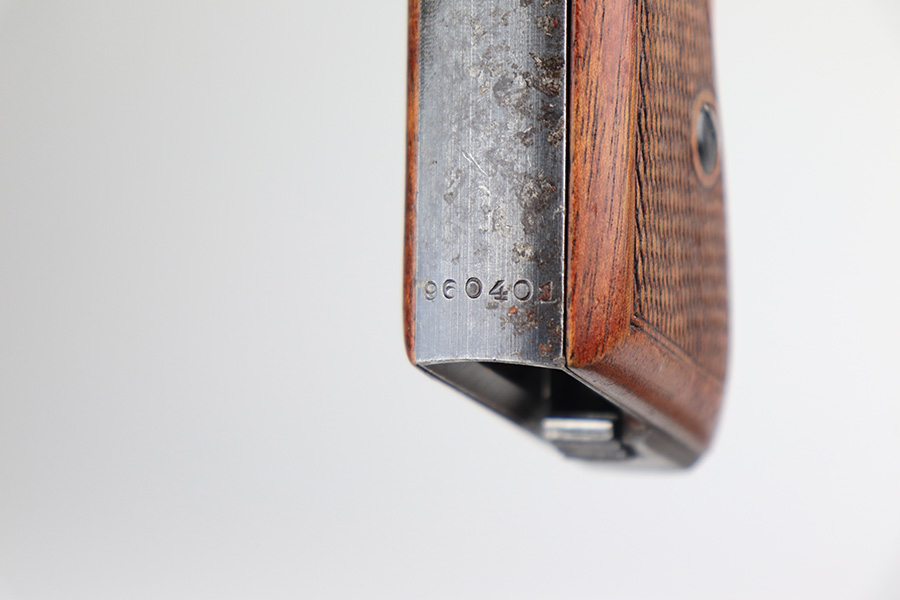 7/8/24 – This is a nice example of a French Mauser HSC made immediately after WW2. It is all matching and has the proper French proof on the trigger guard. It has retained roughly 91-92% of its finish. While there isn’t a ton of actual finish loss, there is noticeable splotchy discoloration and spotty oxidation on both grip straps. Minor wear around the muzzle. A few very light scratches on the left side of the slide. Comes with excellent post-war wood grips and one proper post-war magazine. The bore is near-mint.