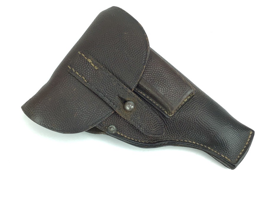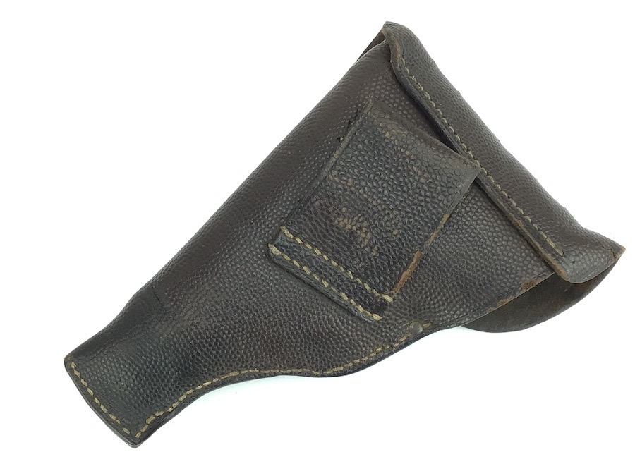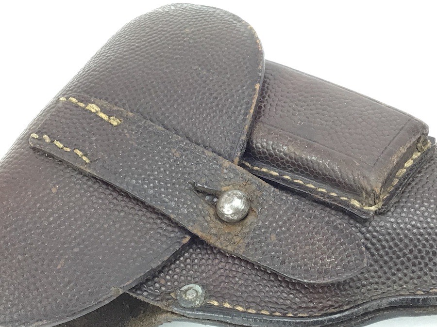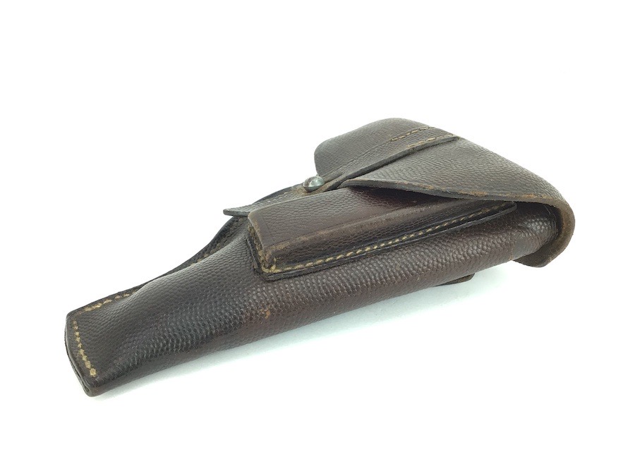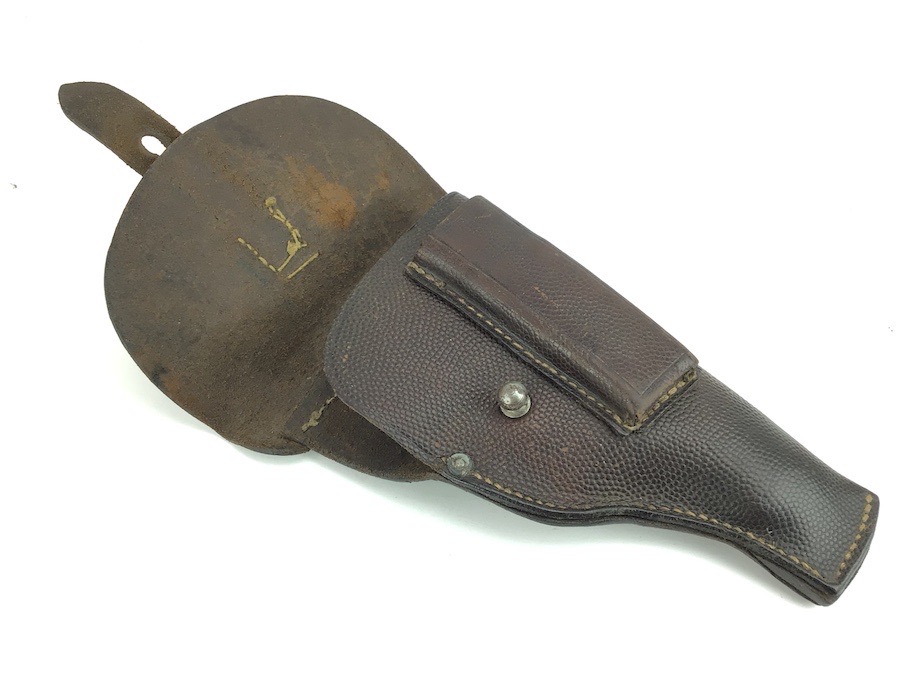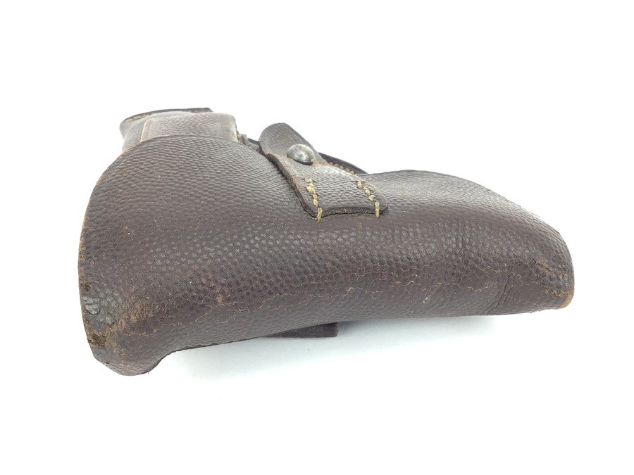 9/23/24 – Original and excellent condition WWI pebble grain holster for a 7.65mm hand gun, such as a Walther / Mauser or Sauer. Stitching is original and intact. Leather shows only minor use wear with a clean interior. Leather is firm but still pliable.
