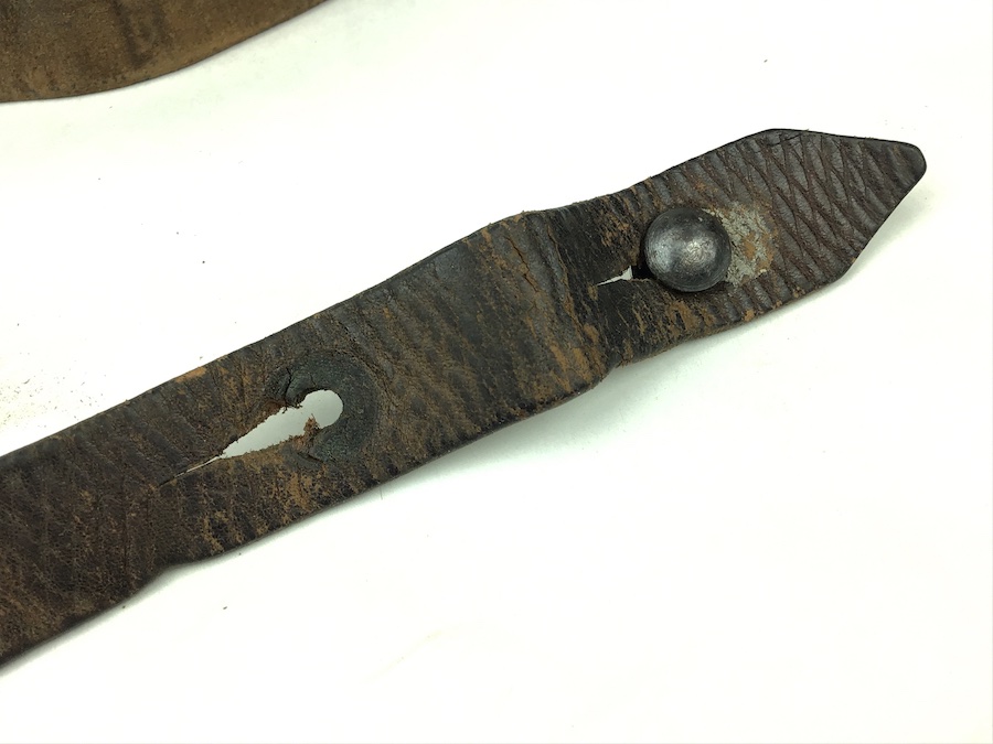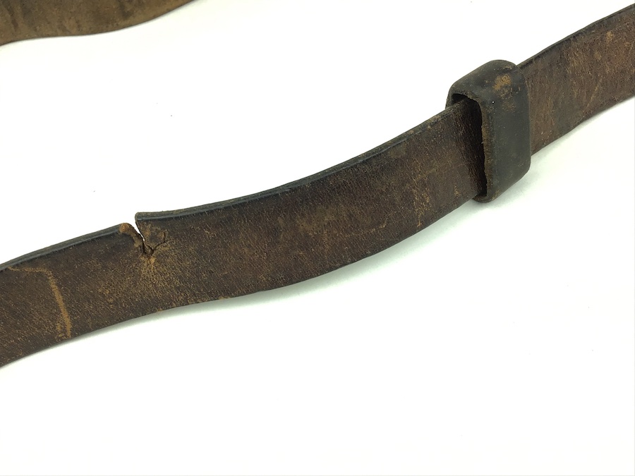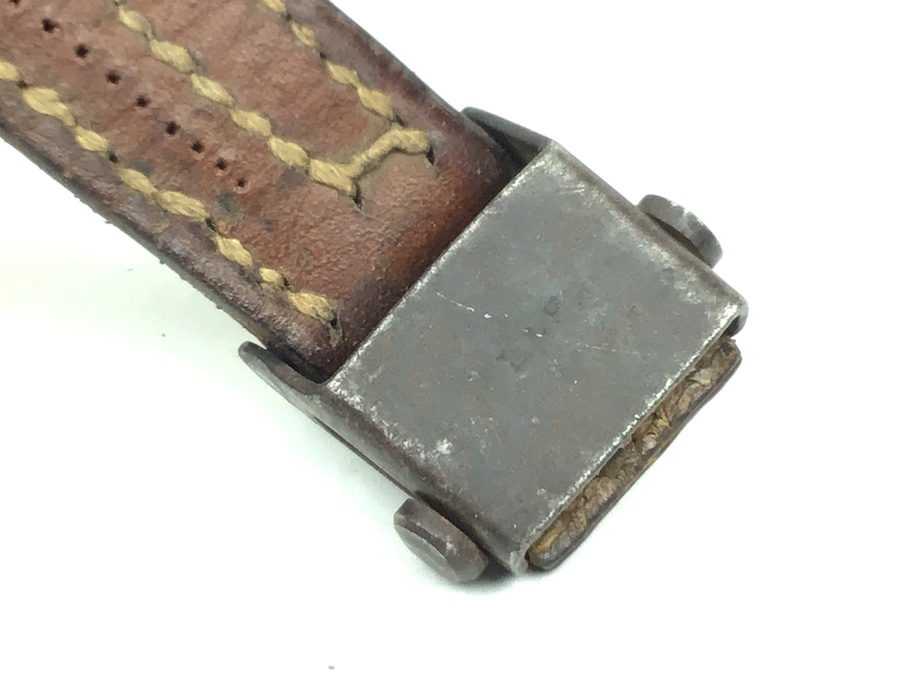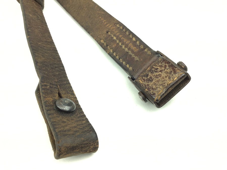 2/27/20 – This is an original German WWII manufactured, leather sling for the MP-40 Machine Guns. Comes complete with just TWO holes on one end of the sling with its original steel “collar button” in place. “L&F” maker mark stamped on the buckle. Stitching is intact and secure. Small cut on the sling about 12″ from the end, however, it is still secure and useable.