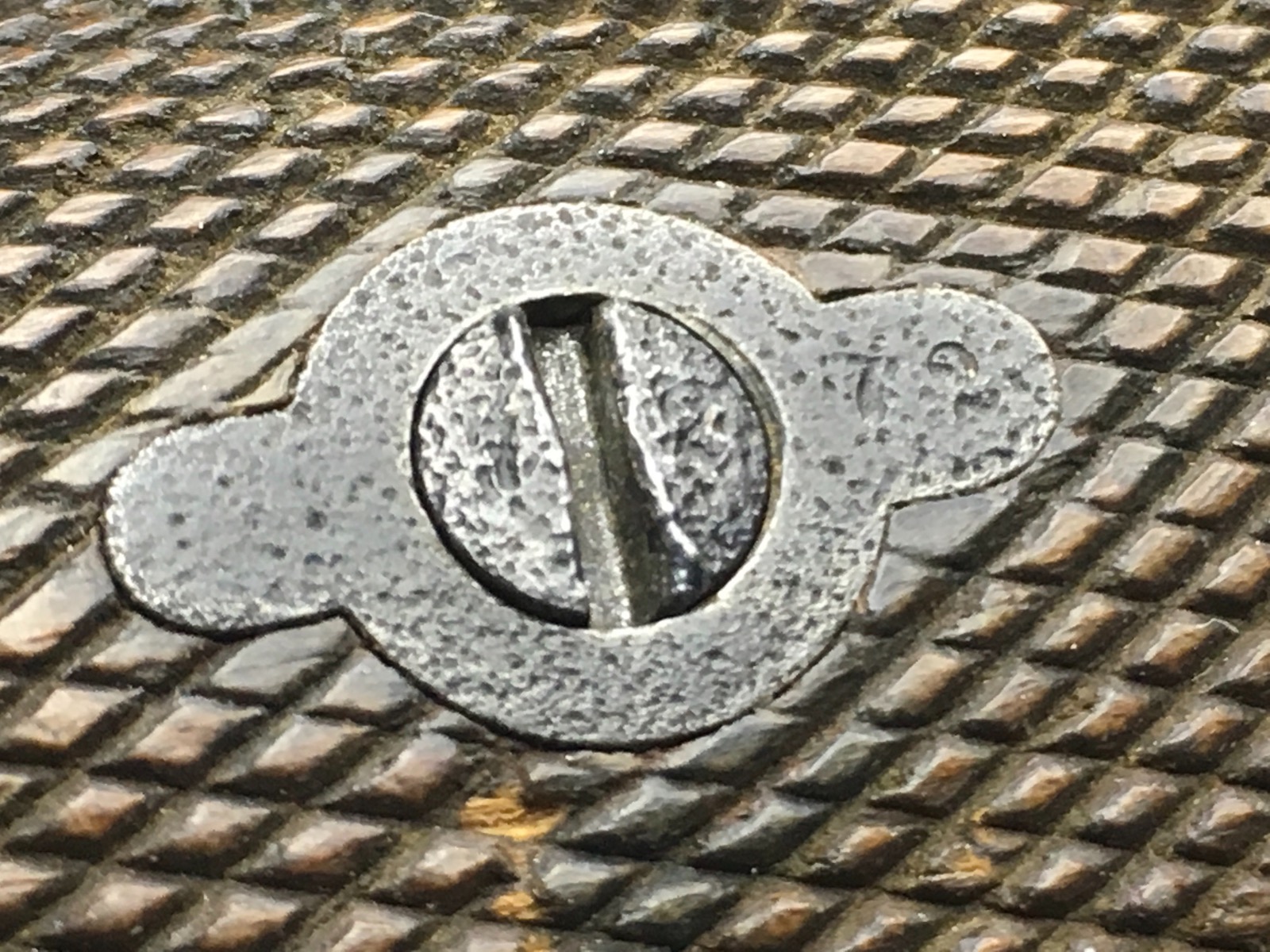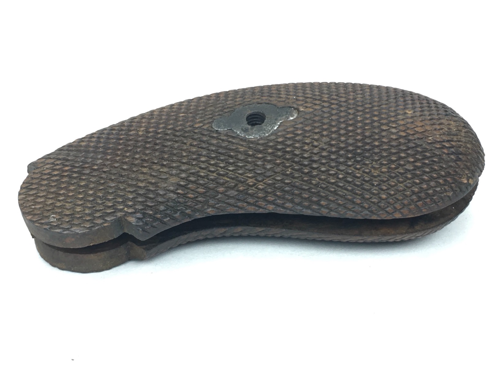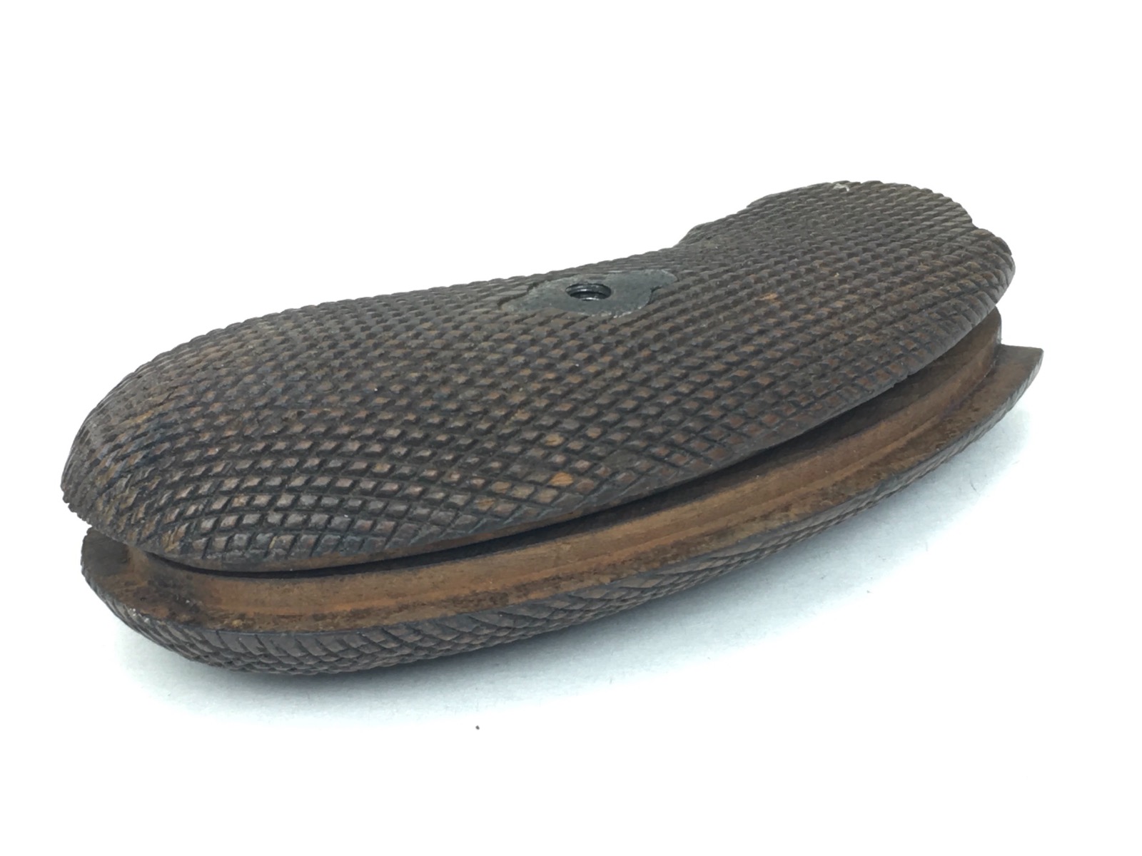 3/13/19 – These are authentic, wooden grip panels and screw for the Reichsrevolver Model 1883. The Reichsrevolver was used by the German Army from 1879 to 1908, before it was superseded by the Luger. Each of these panels has the serial number “1972” stamped on the back. The number “72” is also stamped on the grip screw and escutcheon. So, the screw matches the grips. Very good and distinct checkering. No chips, cracks or missing edges. Very nice set.