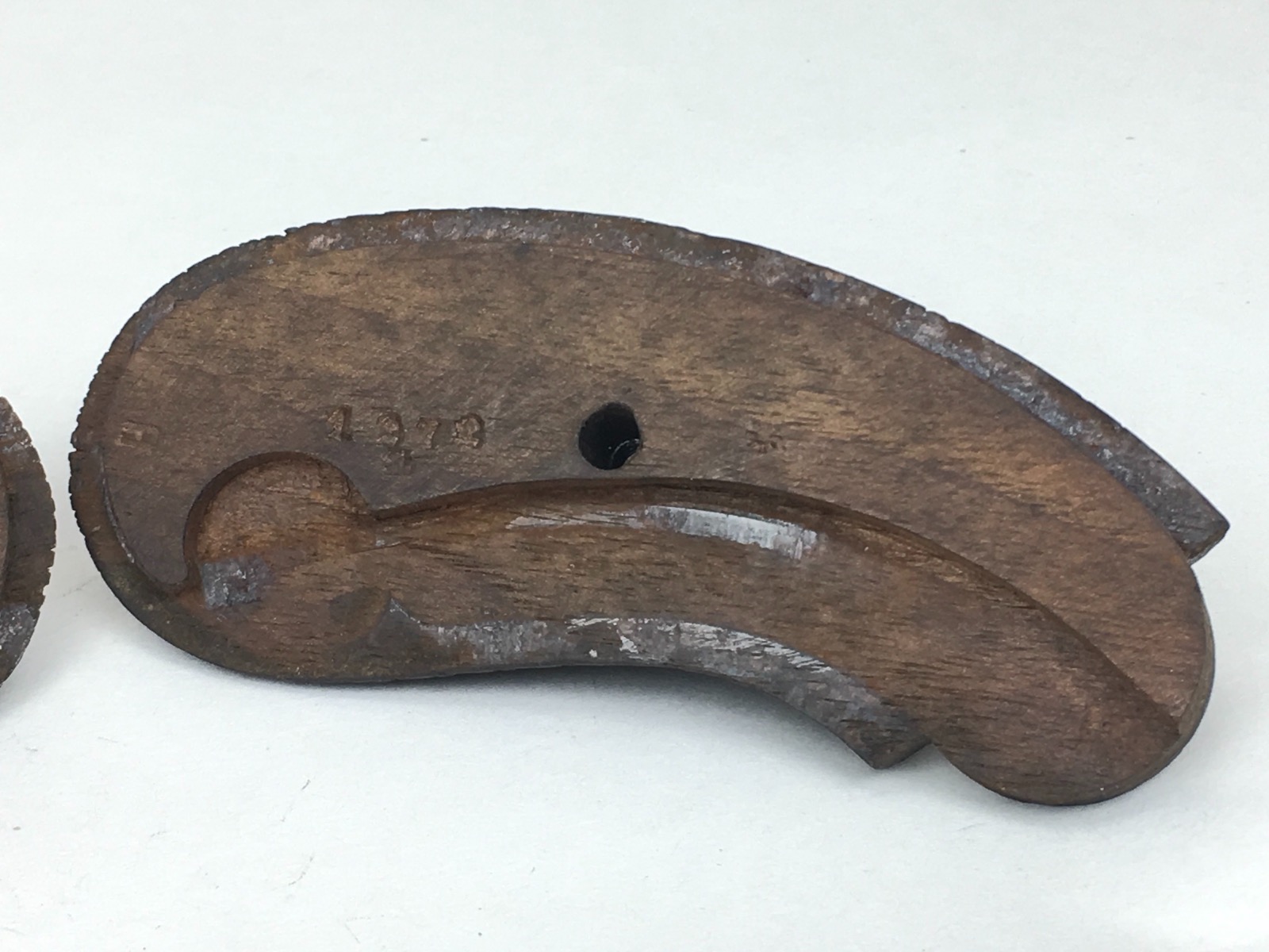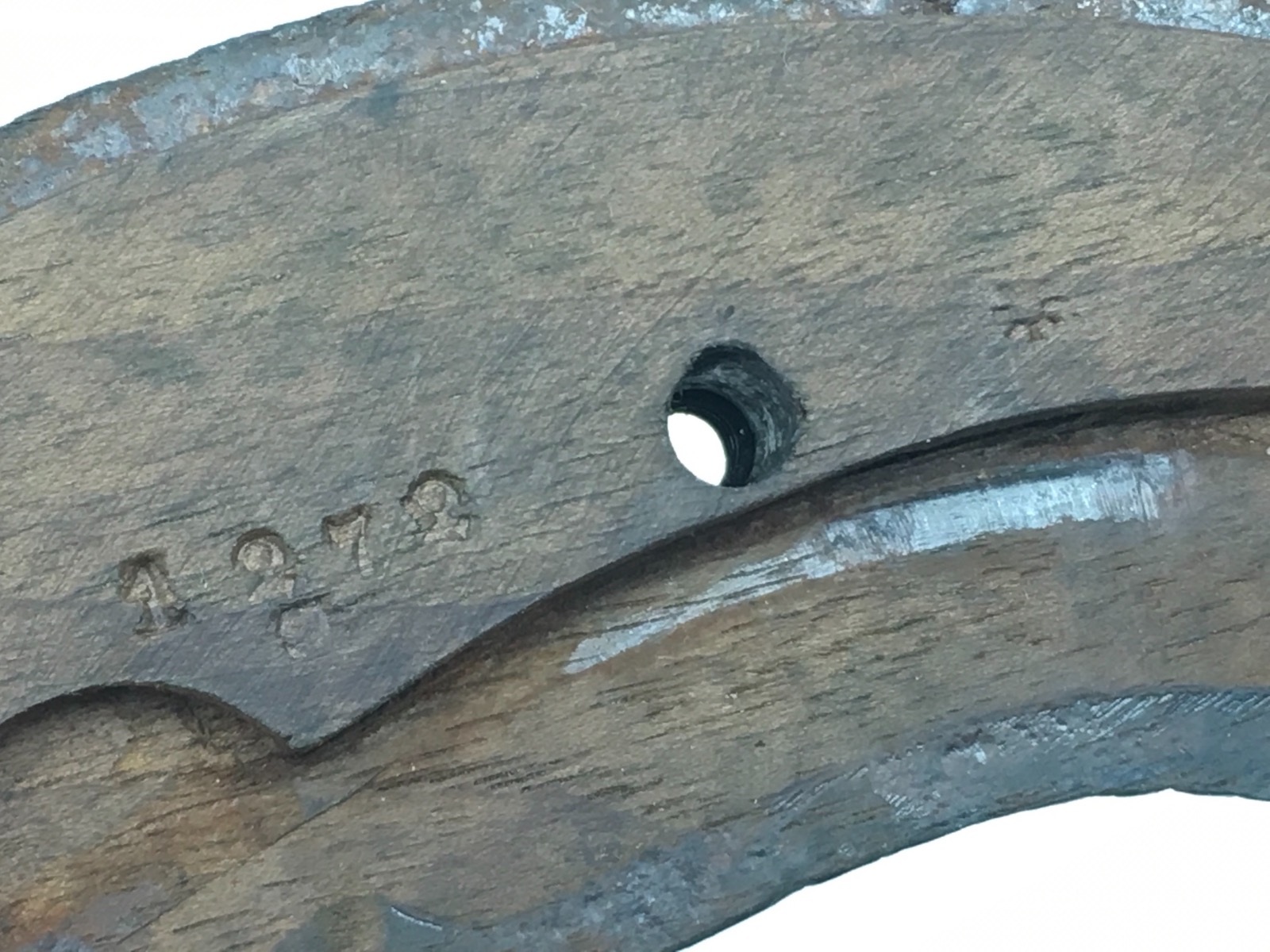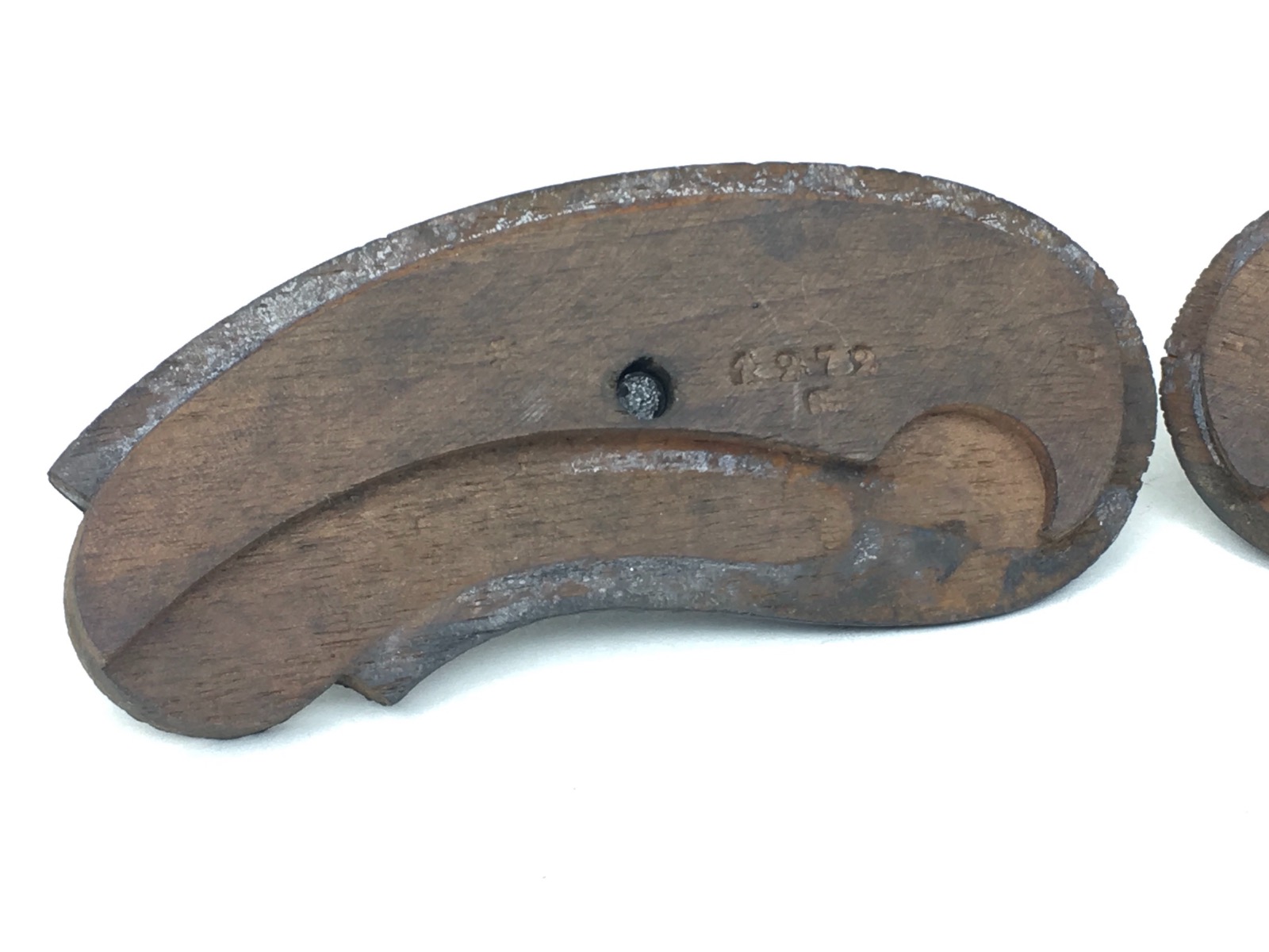 3/13/19 – These are authentic, wooden grip panels and screw for the Reichsrevolver Model 1883. The Reichsrevolver was used by the German Army from 1879 to 1908, before it was superseded by the Luger. Each of these panels has the serial number “1972” stamped on the back. The number “72” is also stamped on the grip screw and escutcheon. So, the screw matches the grips. Very good and distinct checkering. No chips, cracks or missing edges. Very nice set.