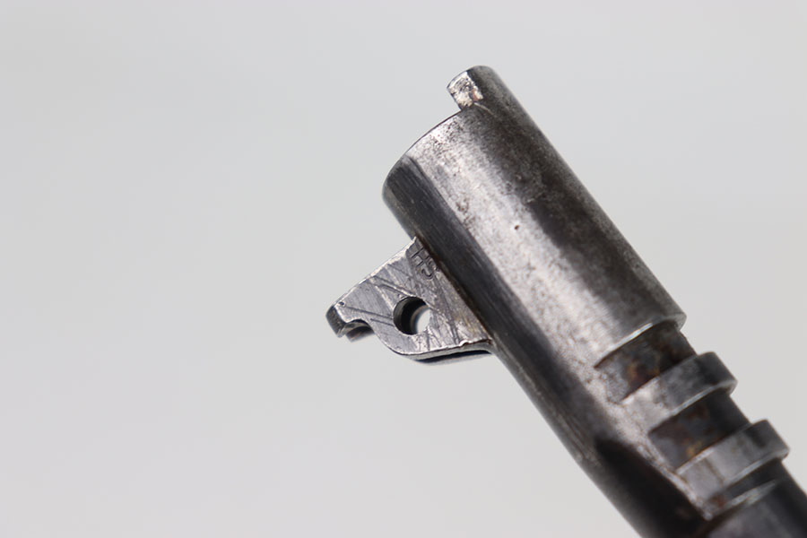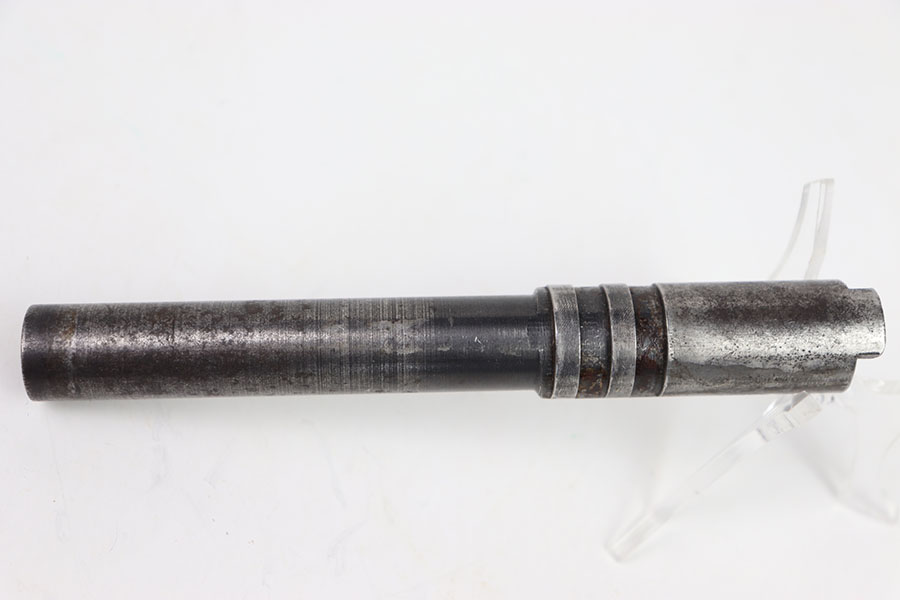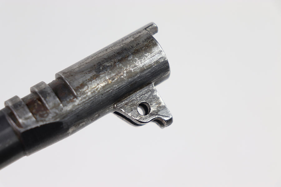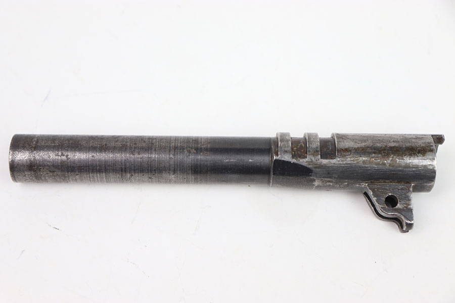 5/29/24 – This is a fair example of a High Standard barrel for a M1911 normally paired with a Ithaca or Remington Rand. This barrel has some heavy finish wear throughout the whole barrel with some patina on the left side. The bore is a 4/10 with some heavy pitting throughout. The Lug is marked with a HS on the right side with what appears to be a faint P on the left. The link and pin is missing.