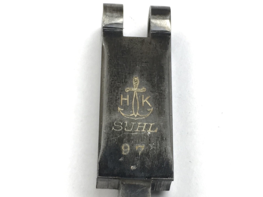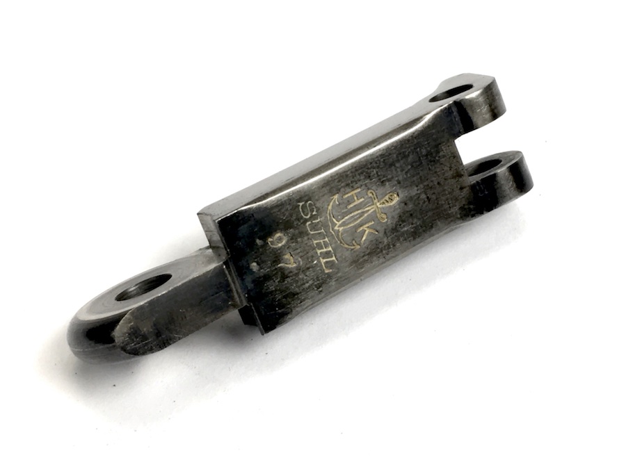 8/12/19 – This is an authentic, forward toggle for a Krieghoff Luger. Bluing is a little thin on top, but the Krieghoff logo marking is distinct. Luftwaffe eagle stamp on the underside. Original, usable piece from the WWI era.
