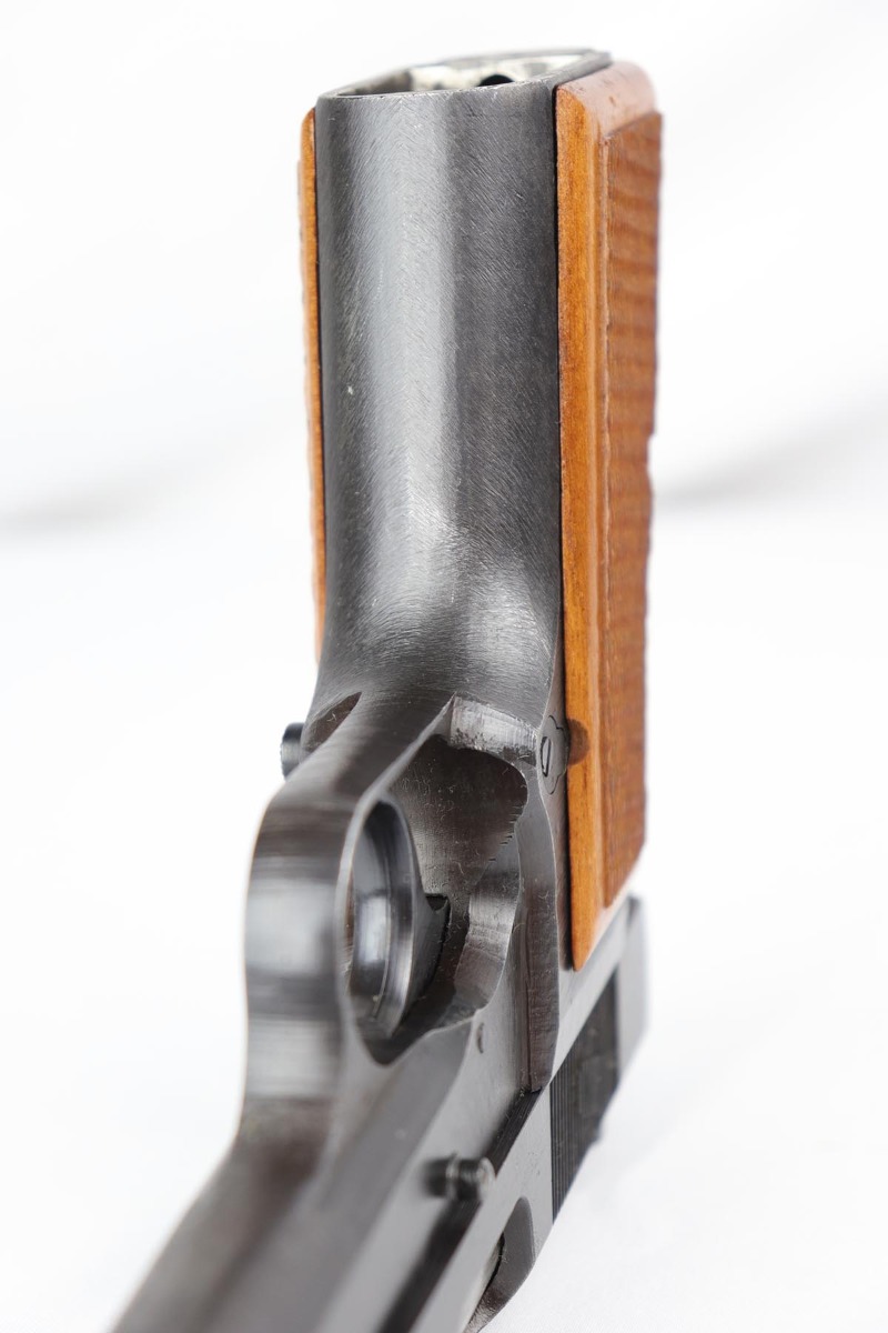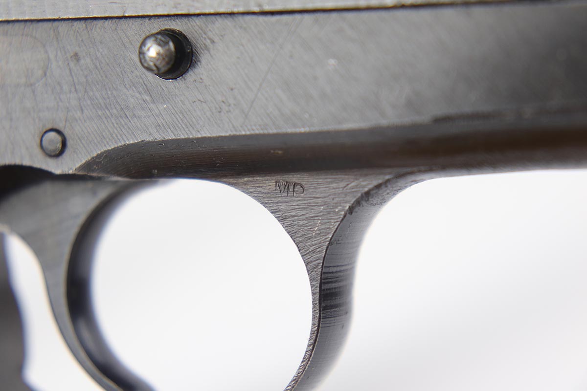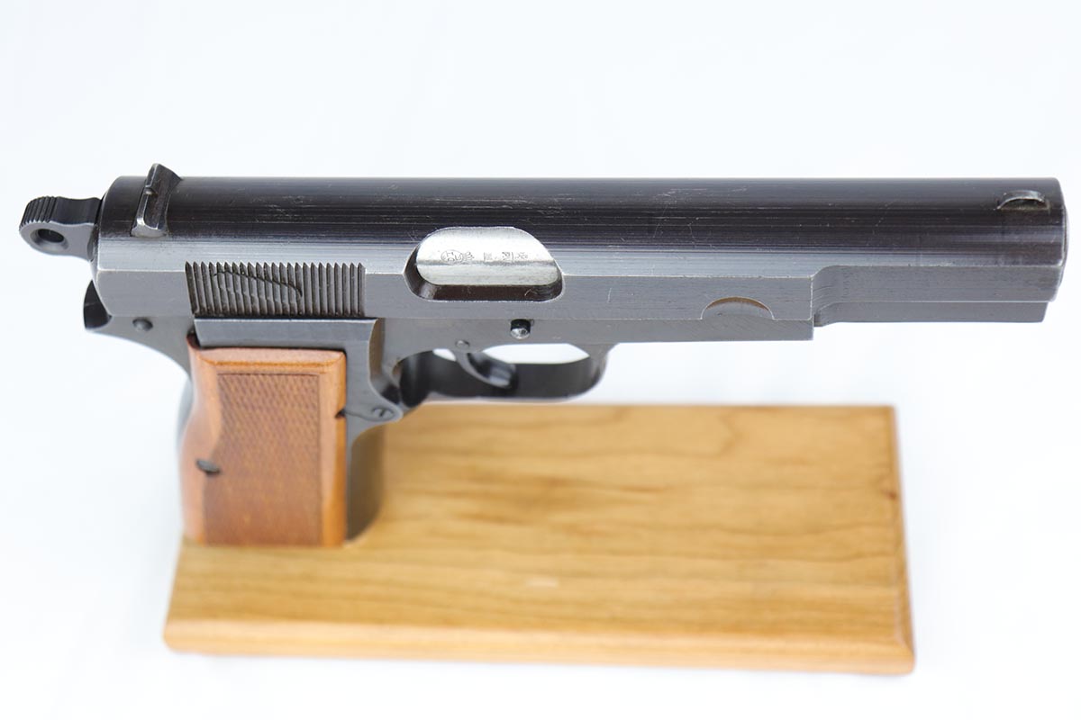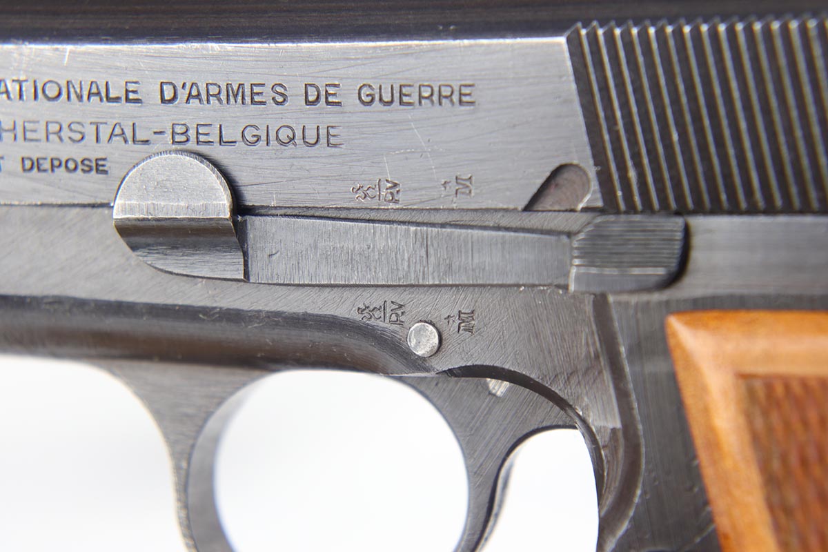 10/31/18 – If only this gun could talk. Firstly, it has no serial. It has Belgian proofs, but looks like a late-war Nazi bluing. Condition is excellent, with excellent post war grips. From what we can tell, along with the aid of other collectors, the gun parts were made during the Nazi era, but after the Nazis had fled the factory. The ejection port, frame and slide all show Belgian proofs. This gun would have been brought back into the country some time relatively shortly following the war, as later imports of this kind were forced to have a serial placed on the frame (under the grips). This pistol has no such serial.