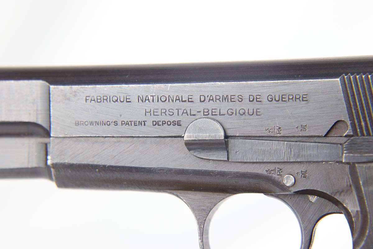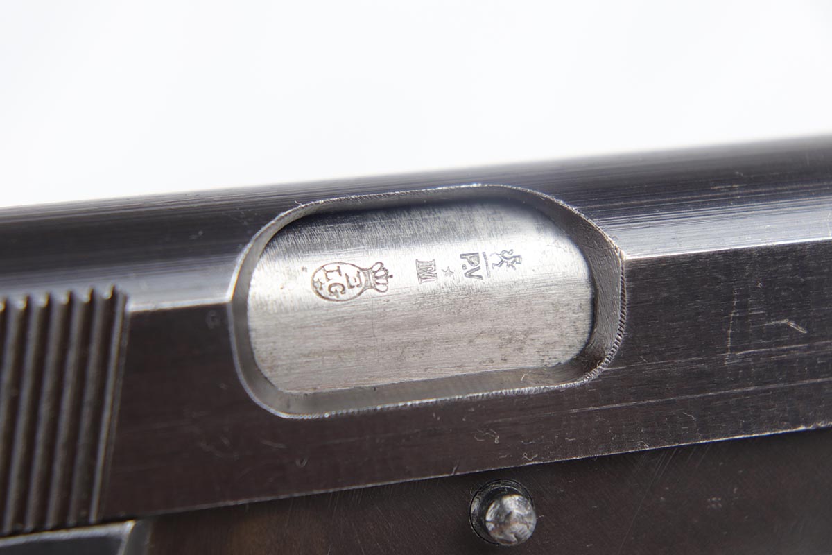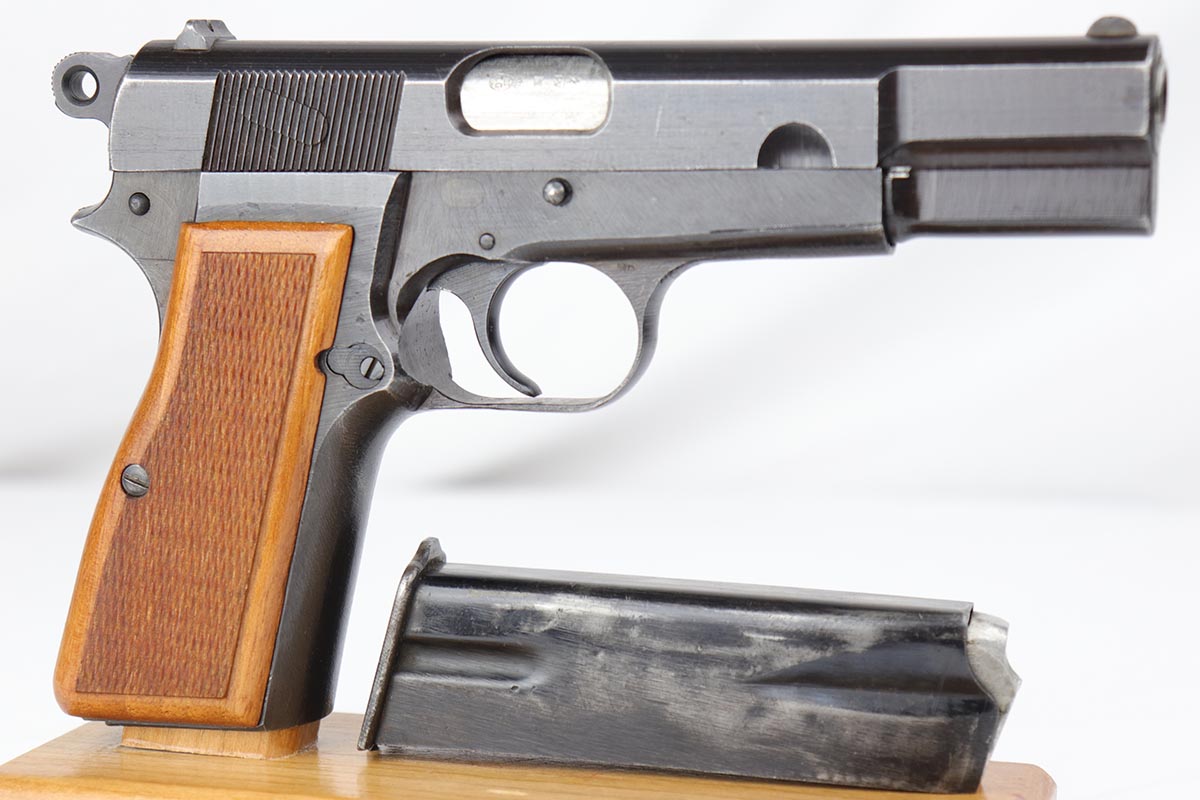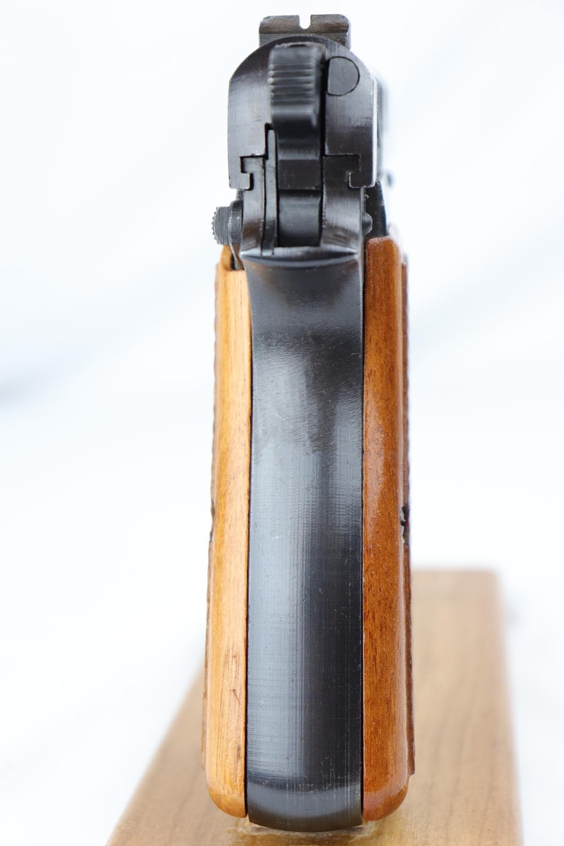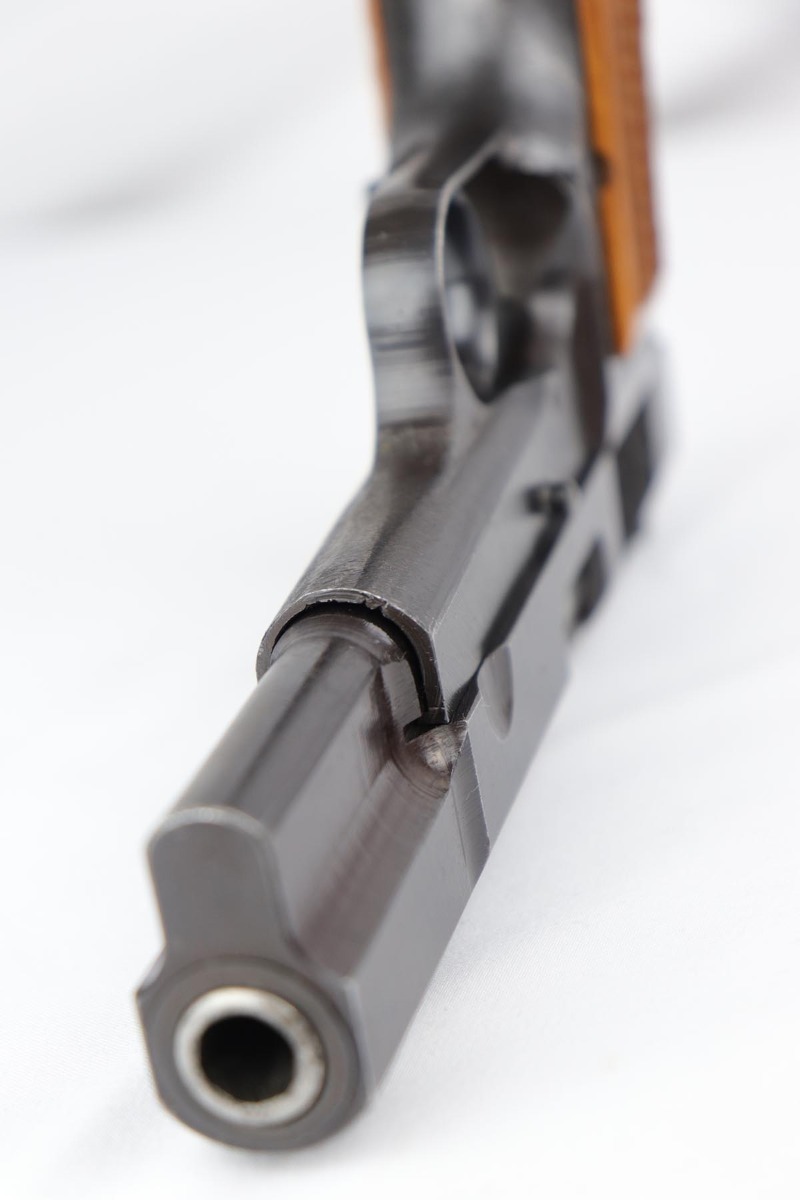 10/31/18 – If only this gun could talk. Firstly, it has no serial. It has Belgian proofs, but looks like a late-war Nazi bluing. Condition is excellent, with excellent post war grips. From what we can tell, along with the aid of other collectors, the gun parts were made during the Nazi era, but after the Nazis had fled the factory. The ejection port, frame and slide all show Belgian proofs. This gun would have been brought back into the country some time relatively shortly following the war, as later imports of this kind were forced to have a serial placed on the frame (under the grips). This pistol has no such serial.