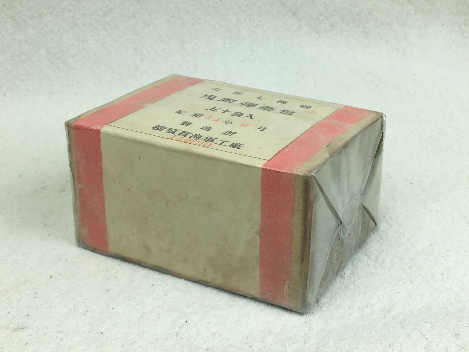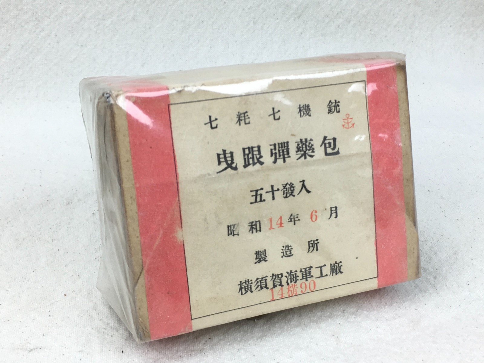 2/25/19 – This is original Japanese Navy WWII 7.7mmx58mm Machine Gun Ammunition. We believe this was used with the Type 92 machine guns that were mounted on naval ships. 50 rounds, un-opened box of tracer cartridges. (The red color on the box indicates tracer). Line 4 Shows 6th month, and 1939 date. Bottom line indicates Yokosuka Naval Arsenal. The box is un-opened and has been sealed in plastic so we presume the cartridges are in tact but not sure of condition.