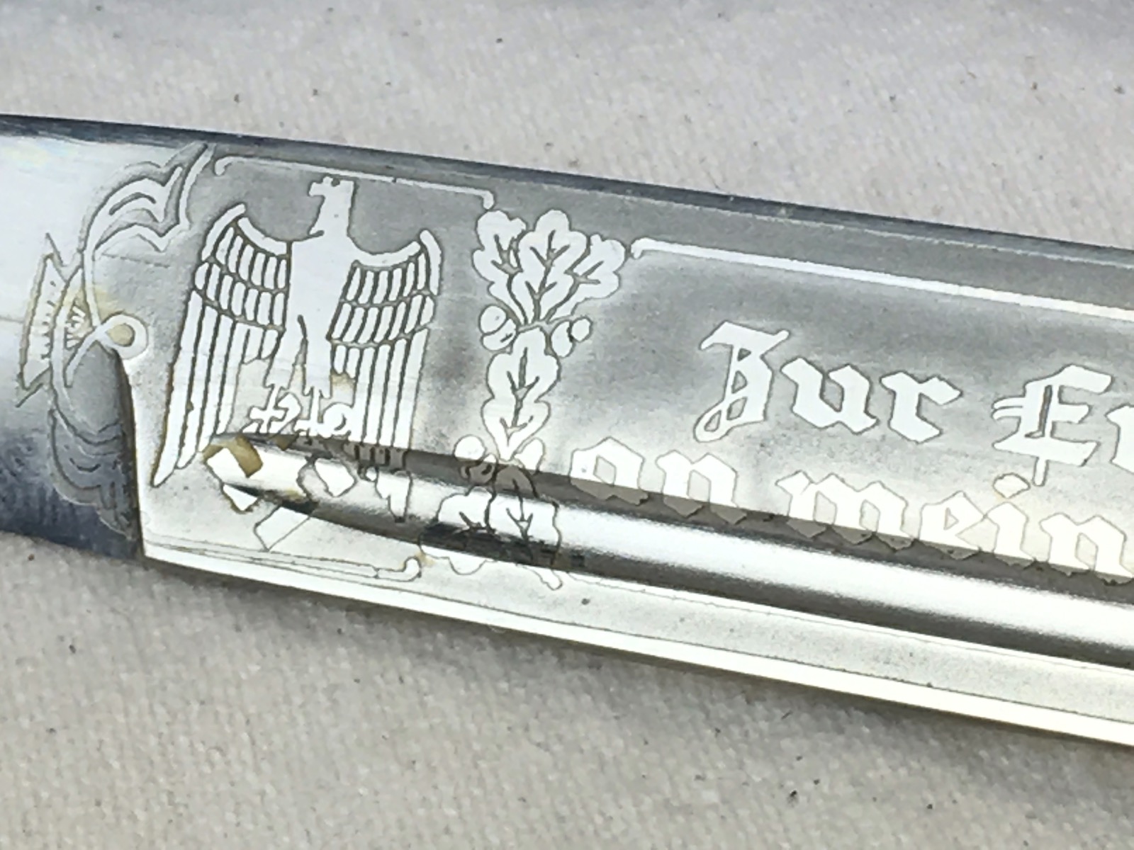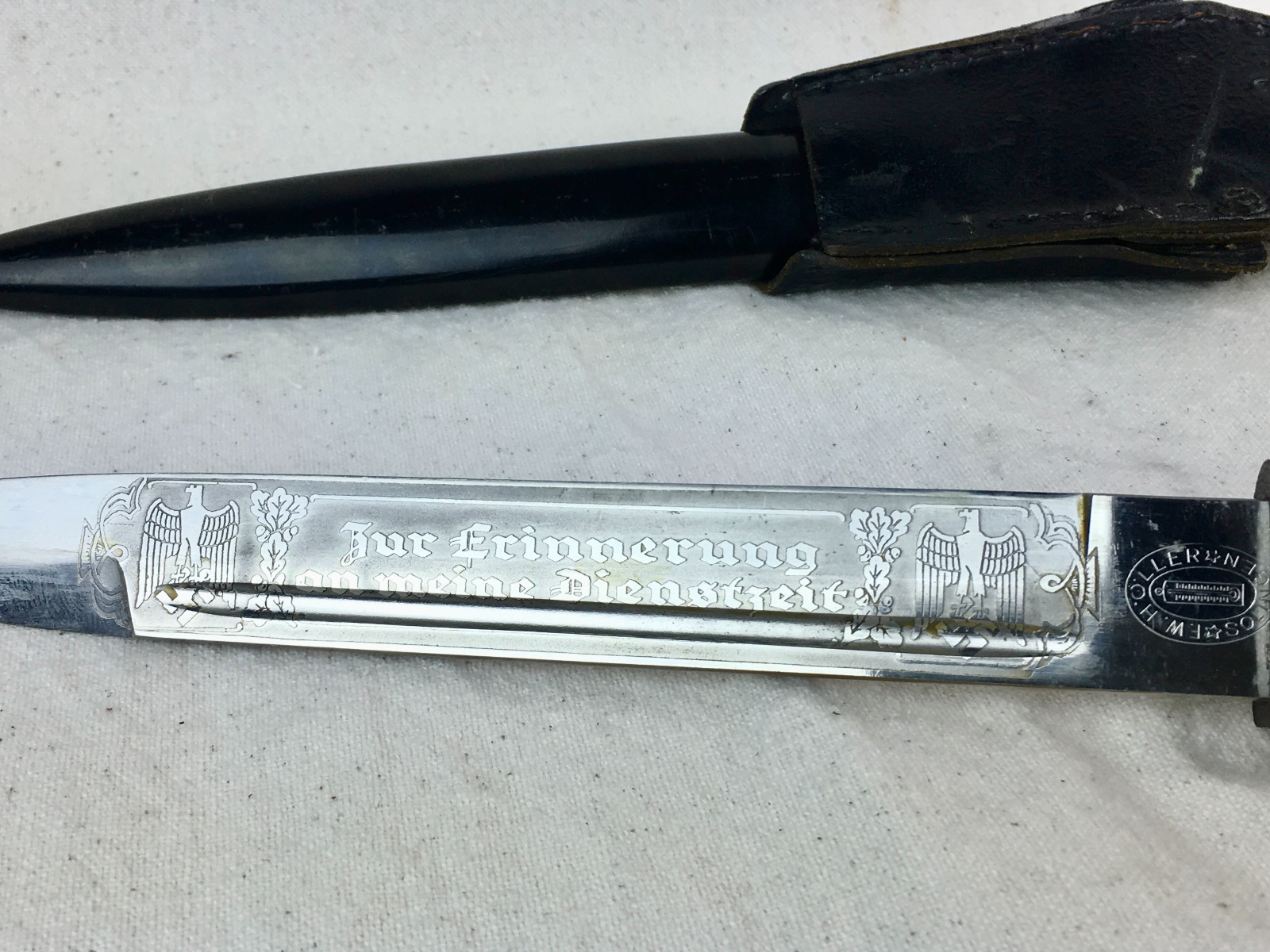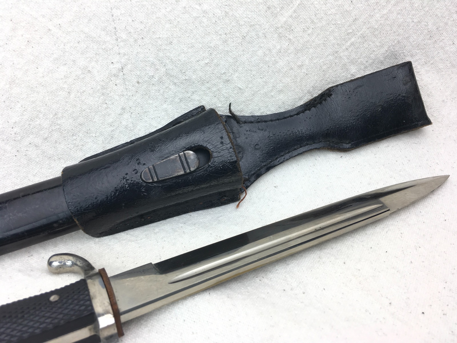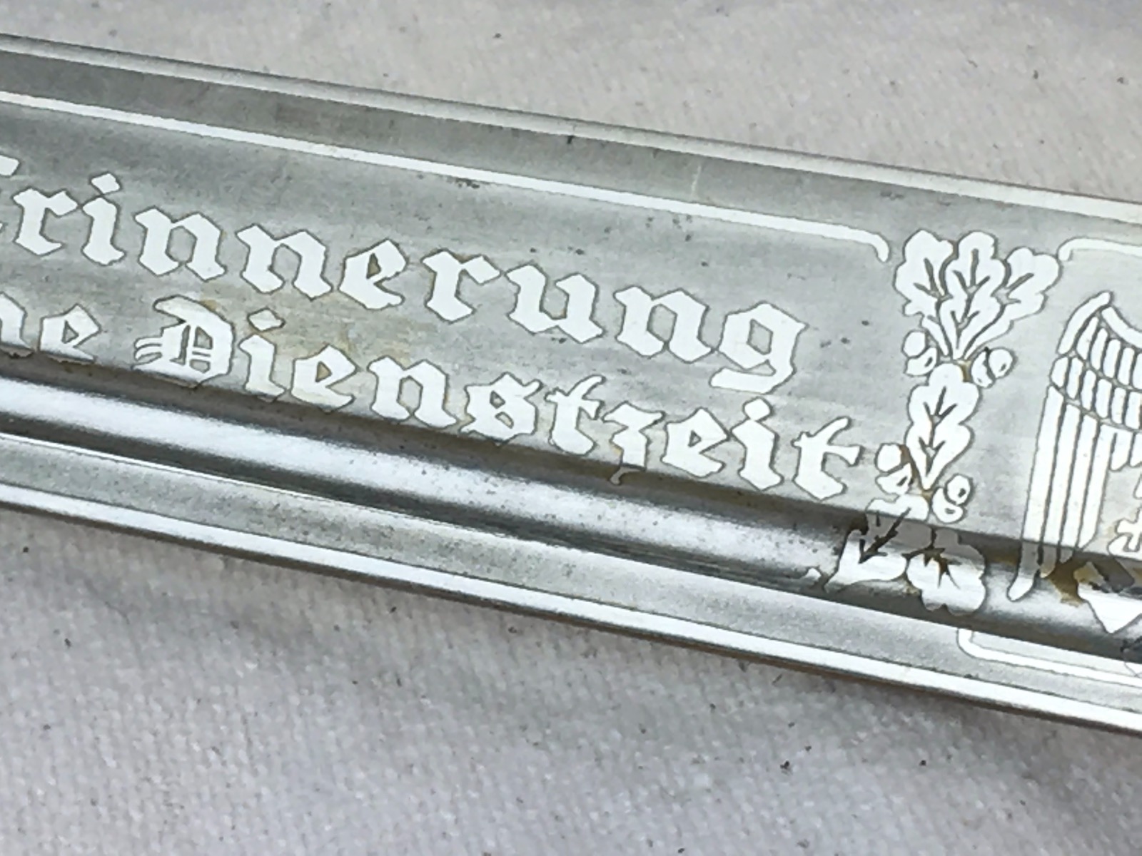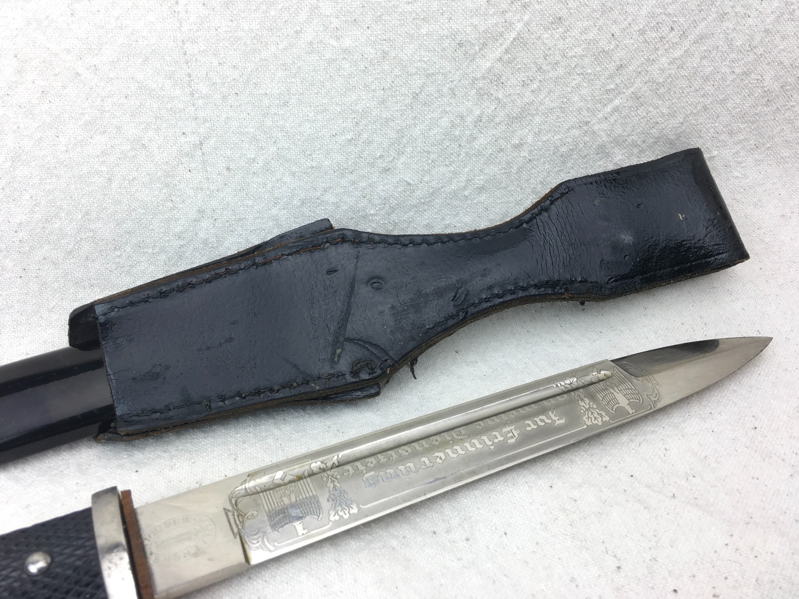 7/13/18 – Here is an excellent example of a K98 Dress Bayonet manufactured by F.W. Höller as evidenced by the maker mark on the hilt of the blade. “F.W. Höller, Solingen”, and in the center is the Thermometer trademark. Beautiful, distinct etching on one side of the blade translates to “For my time in service”. The words are flanked with oak leaf sprigs and two Wehrmacht winged eagles holding swastikas. The detail is distinct and outstanding. The plating is nearly mint on the blade. Some minor speckling on the cross guard and pummel. The grips are black Bakelite with good checkering. The leather blade stop is intact as well as the red felt lining in the rifle slot. The scabbard and frog are in great shape. Minimal paint loss on the scabbard with no dents or cracks. Guaranteed original.