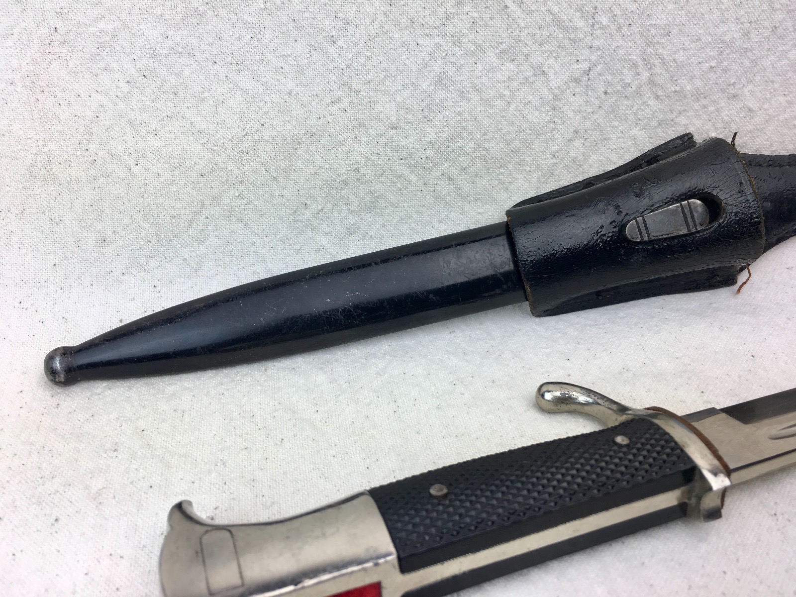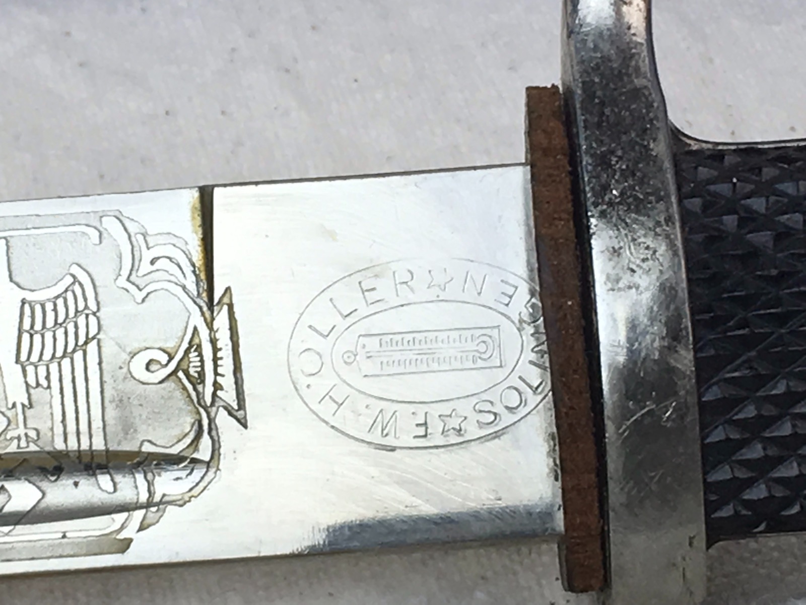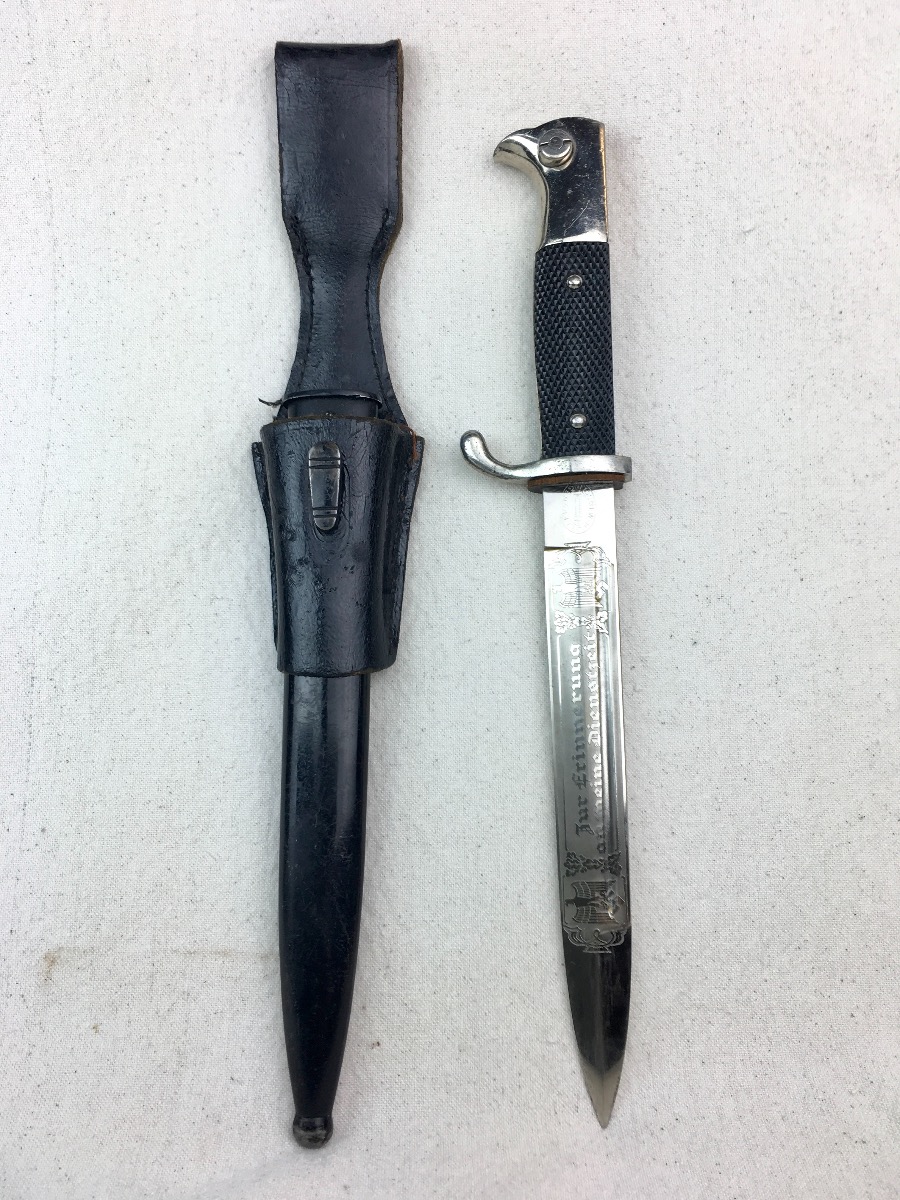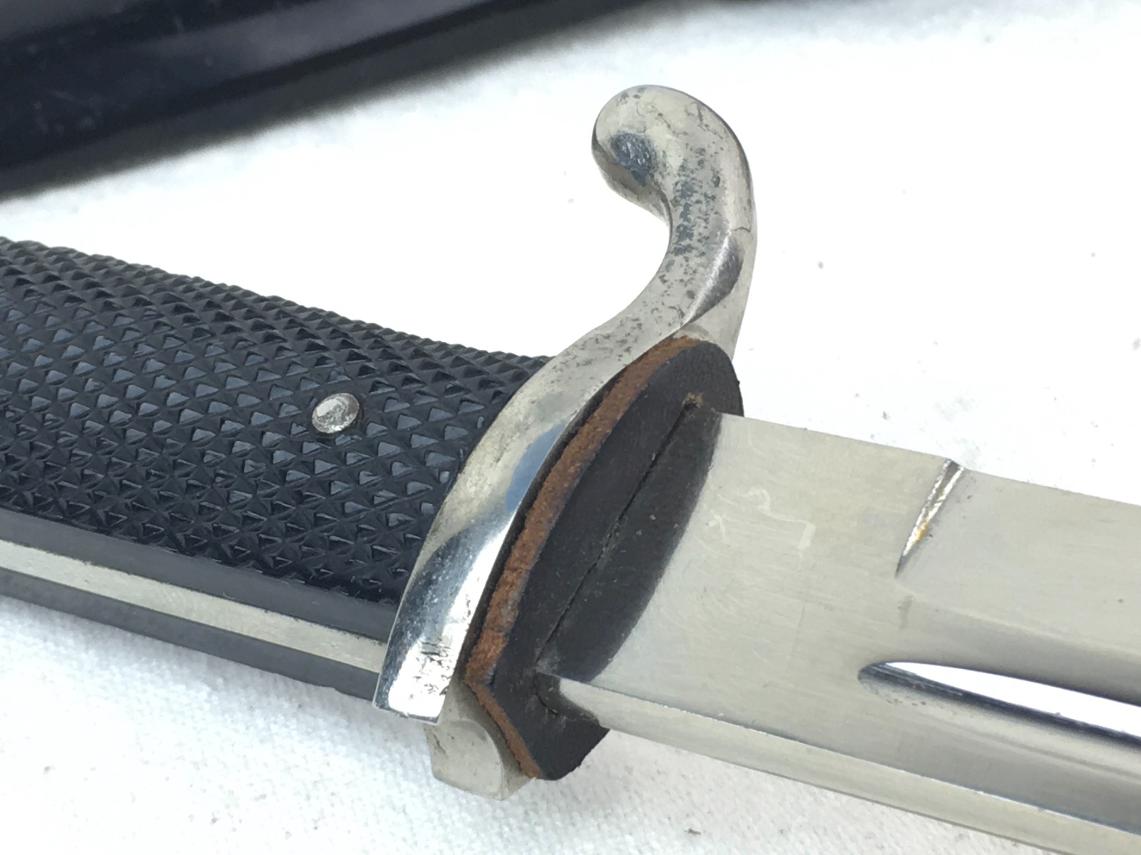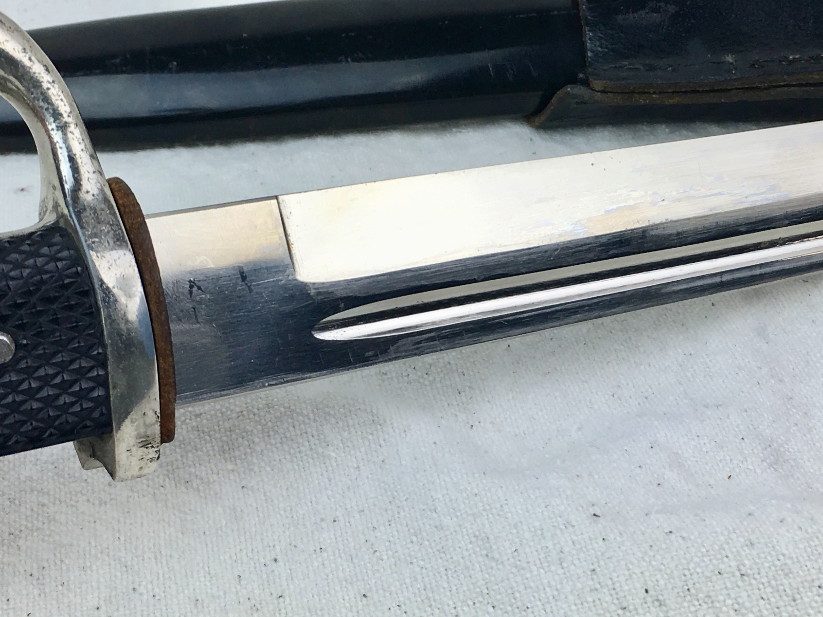 7/13/18 – Here is an excellent example of a K98 Dress Bayonet manufactured by F.W. Höller as evidenced by the maker mark on the hilt of the blade. “F.W. Höller, Solingen”, and in the center is the Thermometer trademark. Beautiful, distinct etching on one side of the blade translates to “For my time in service”. The words are flanked with oak leaf sprigs and two Wehrmacht winged eagles holding swastikas. The detail is distinct and outstanding. The plating is nearly mint on the blade. Some minor speckling on the cross guard and pummel. The grips are black Bakelite with good checkering. The leather blade stop is intact as well as the red felt lining in the rifle slot. The scabbard and frog are in great shape. Minimal paint loss on the scabbard with no dents or cracks. Guaranteed original.