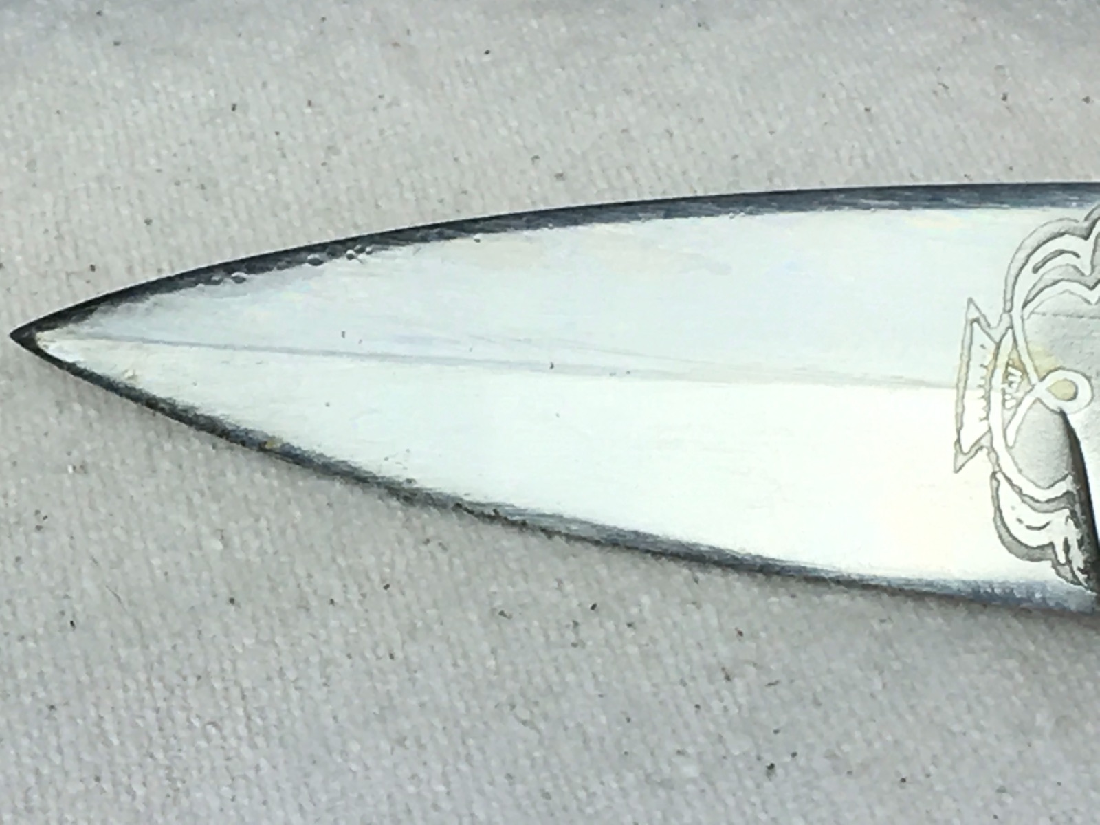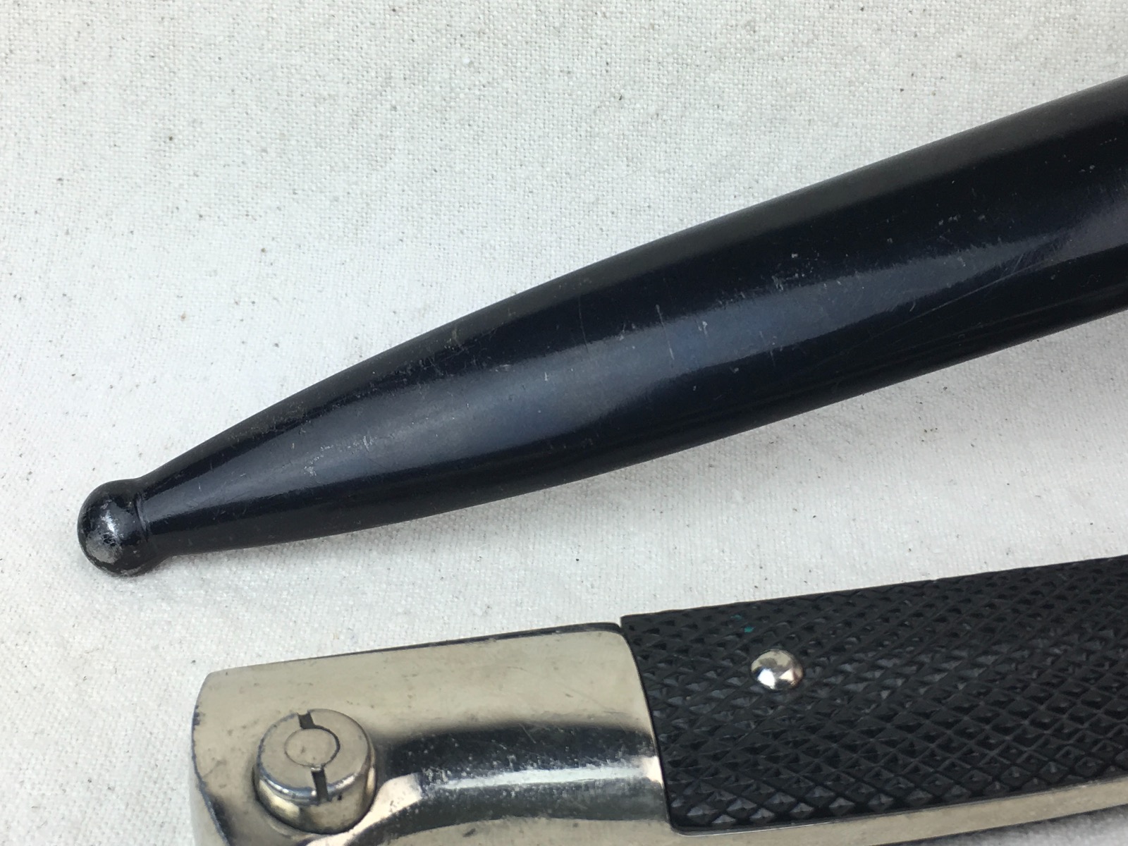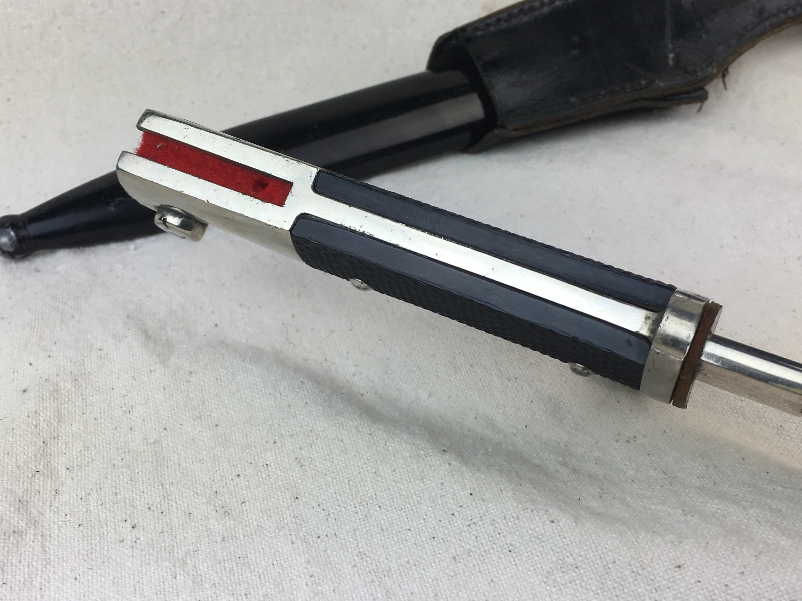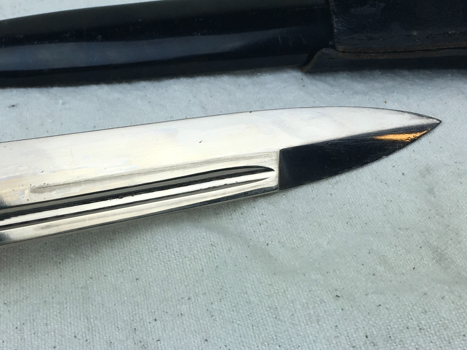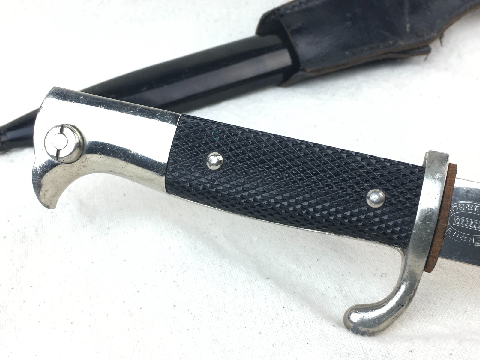 7/13/18 – Here is an excellent example of a K98 Dress Bayonet manufactured by F.W. Höller as evidenced by the maker mark on the hilt of the blade. “F.W. Höller, Solingen”, and in the center is the Thermometer trademark. Beautiful, distinct etching on one side of the blade translates to “For my time in service”. The words are flanked with oak leaf sprigs and two Wehrmacht winged eagles holding swastikas. The detail is distinct and outstanding. The plating is nearly mint on the blade. Some minor speckling on the cross guard and pummel. The grips are black Bakelite with good checkering. The leather blade stop is intact as well as the red felt lining in the rifle slot. The scabbard and frog are in great shape. Minimal paint loss on the scabbard with no dents or cracks. Guaranteed original.
