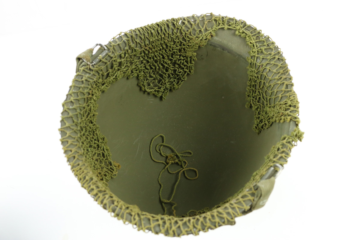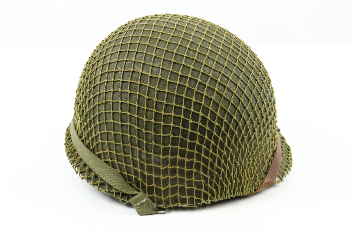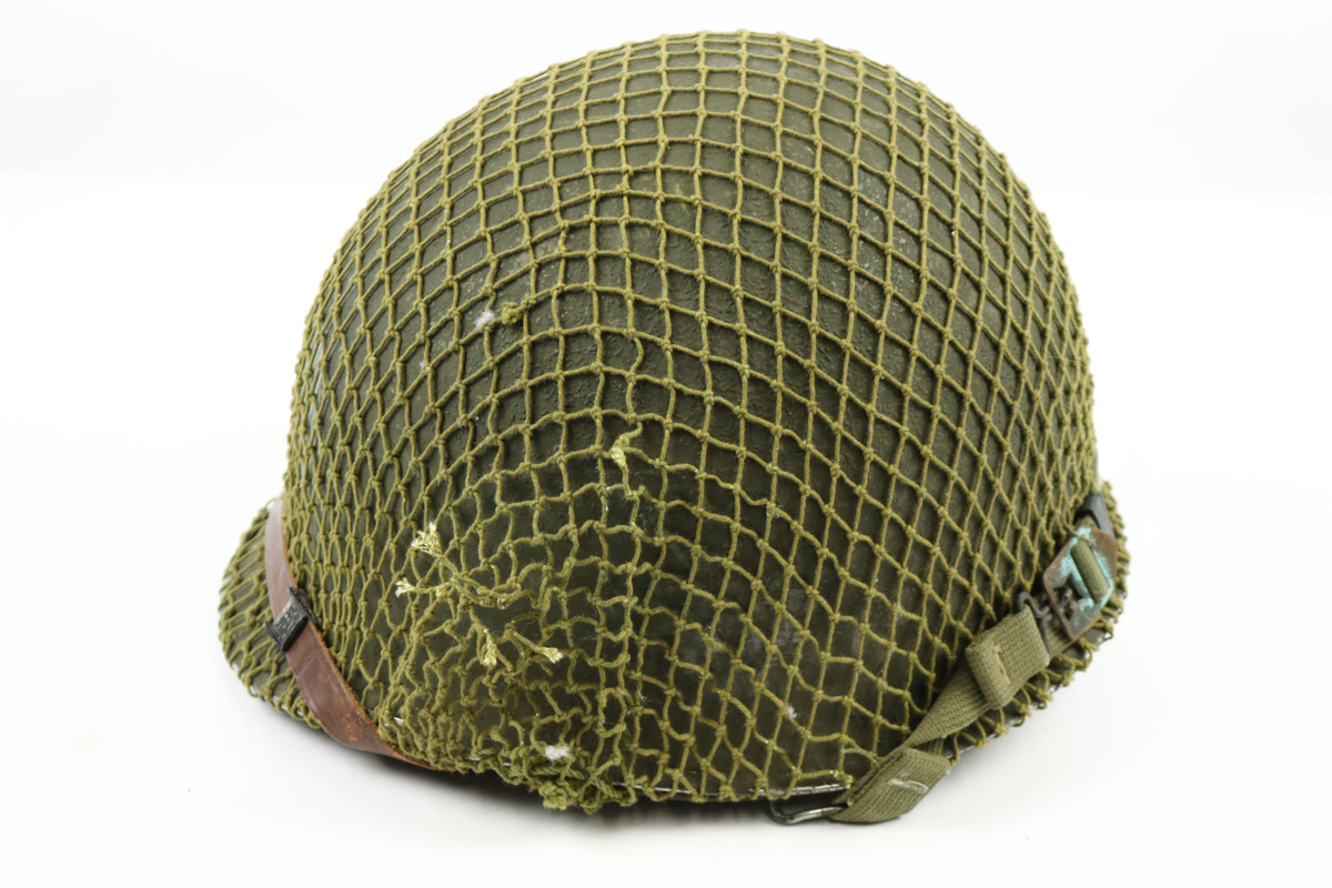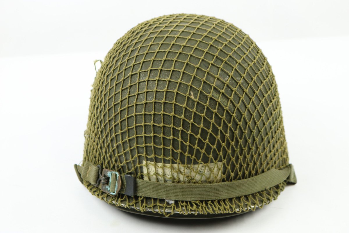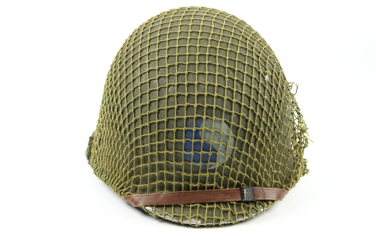 10/22/18 – This is an original M1 style US WW2 Helmet. The helmet is original paint with a 29th infantry division logo on the front. The 29th infantry was part of the famous Normandy invasion. The interior liner has no cracks or major notable issues, and is Westinghouse maker marked. The shell has a front seam, and swivel style bails (later variation). The paint is original and excellent – mostly in tact. The original camouflage netting is also in tact and attached to the shell. Guaranteed original and authentic.
