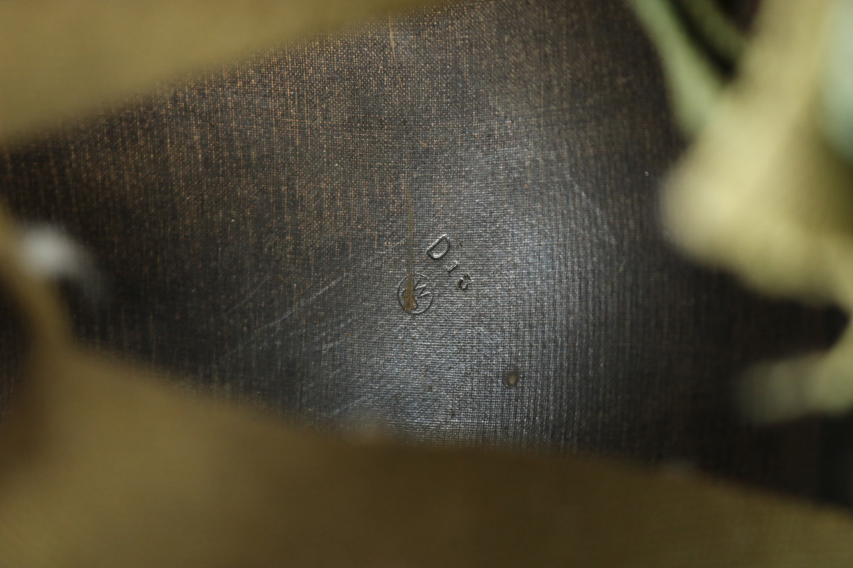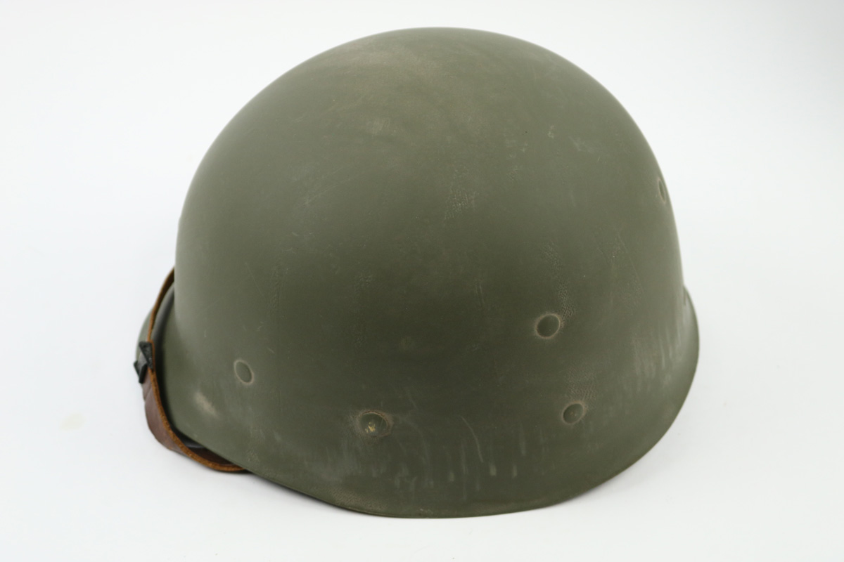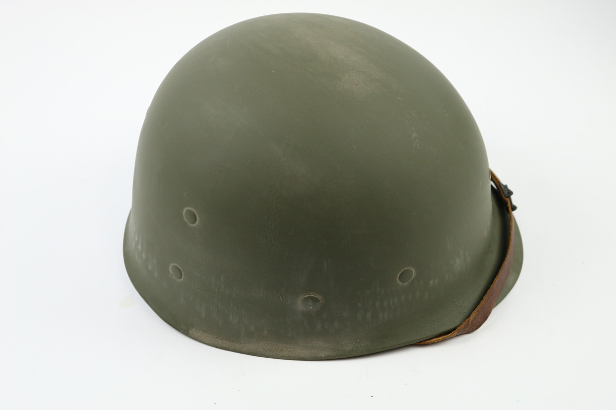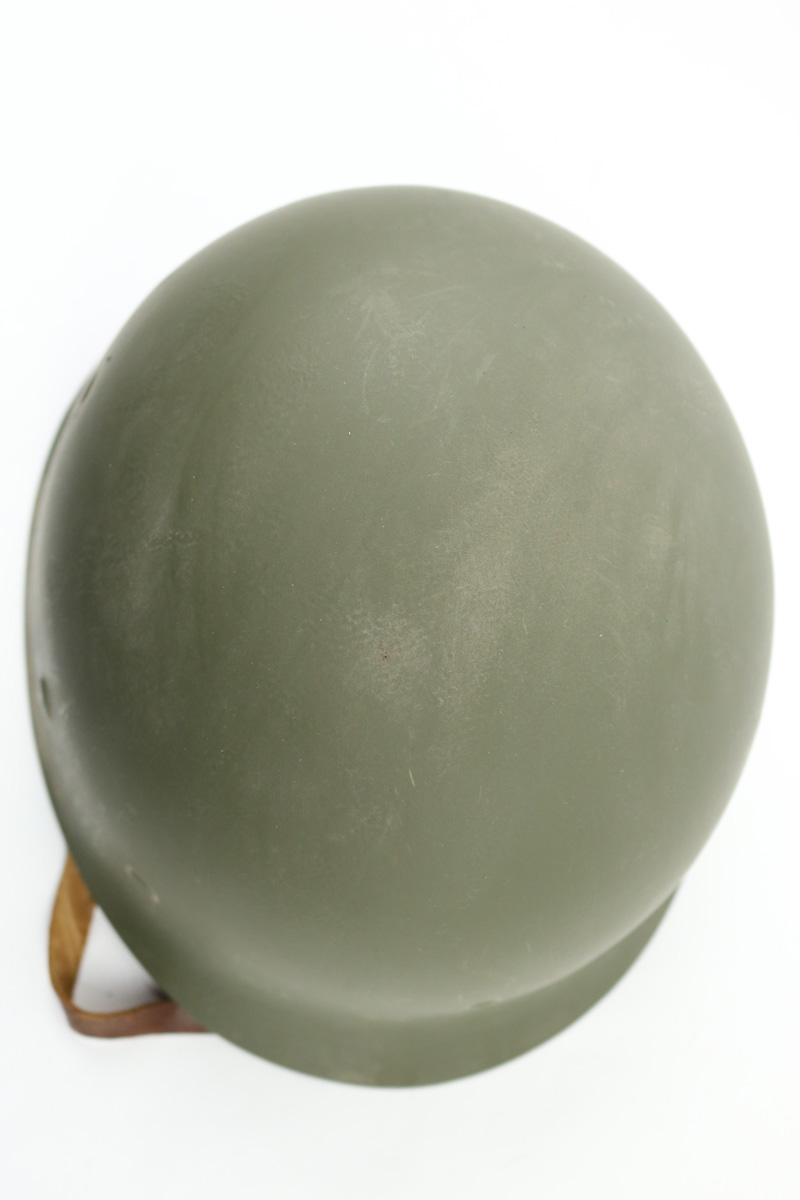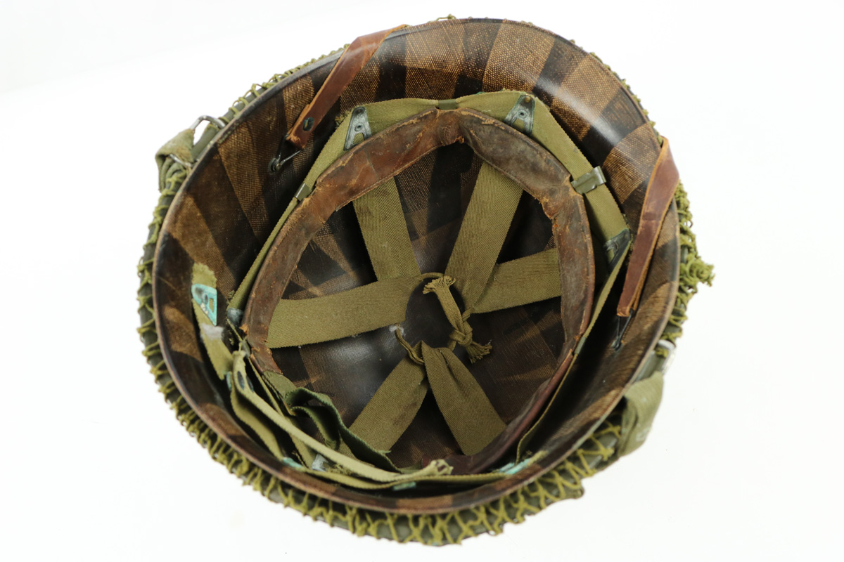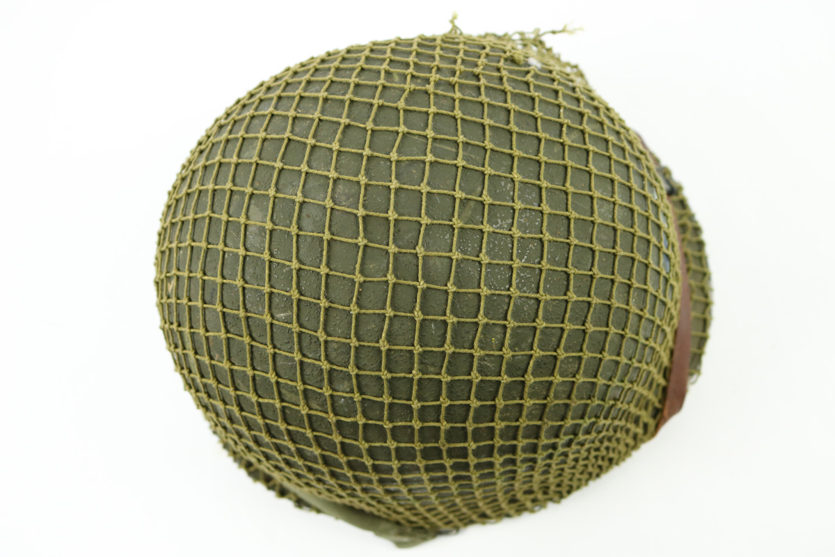 10/22/18 – This is an original M1 style US WW2 Helmet. The helmet is original paint with a 29th infantry division logo on the front. The 29th infantry was part of the famous Normandy invasion. The interior liner has no cracks or major notable issues, and is Westinghouse maker marked. The shell has a front seam, and swivel style bails (later variation). The paint is original and excellent – mostly in tact. The original camouflage netting is also in tact and attached to the shell. Guaranteed original and authentic.