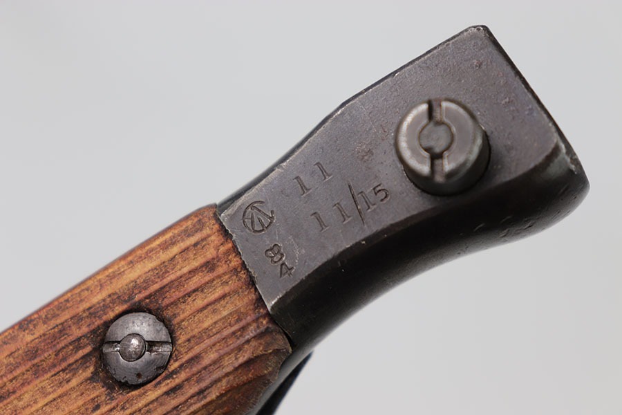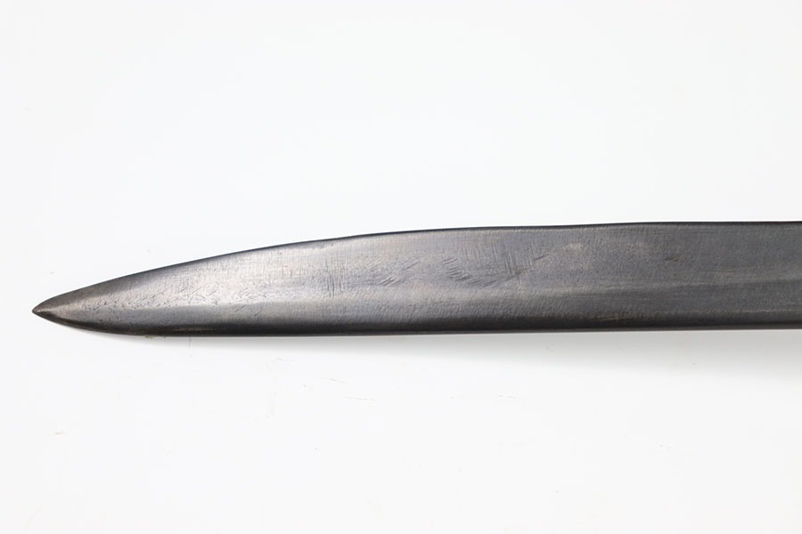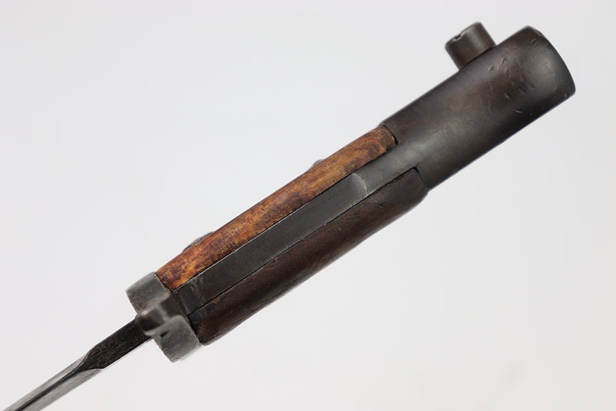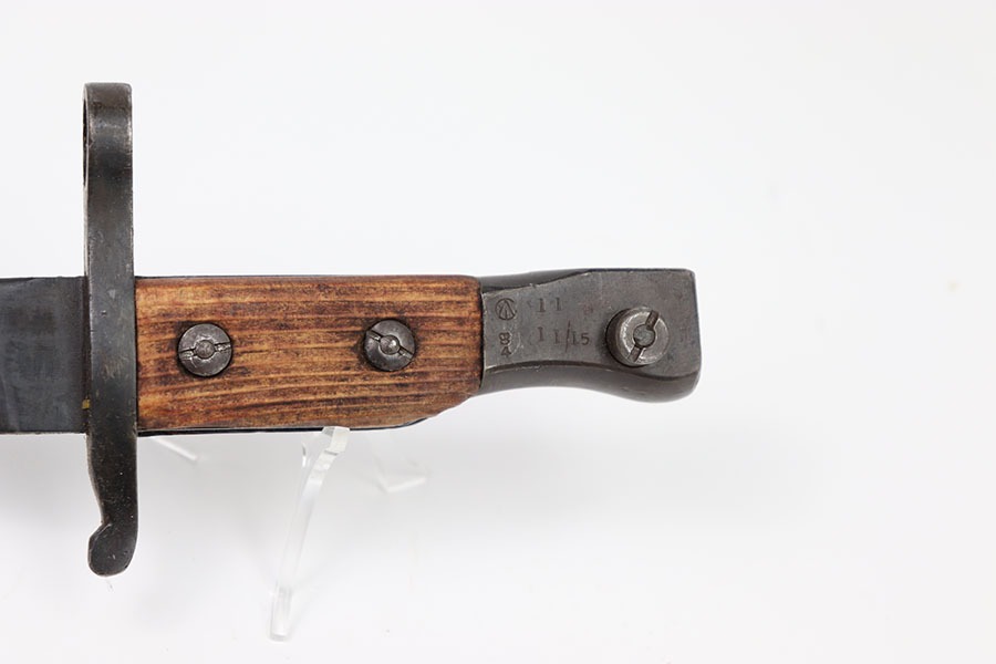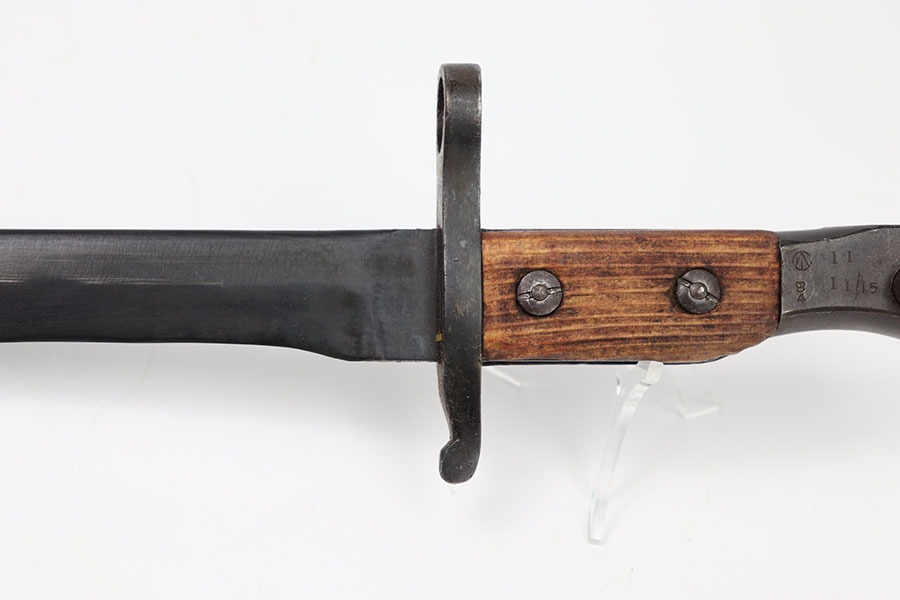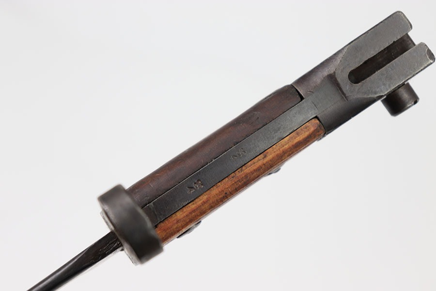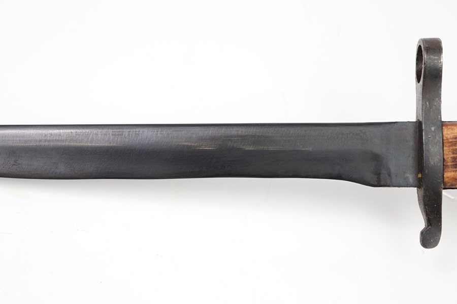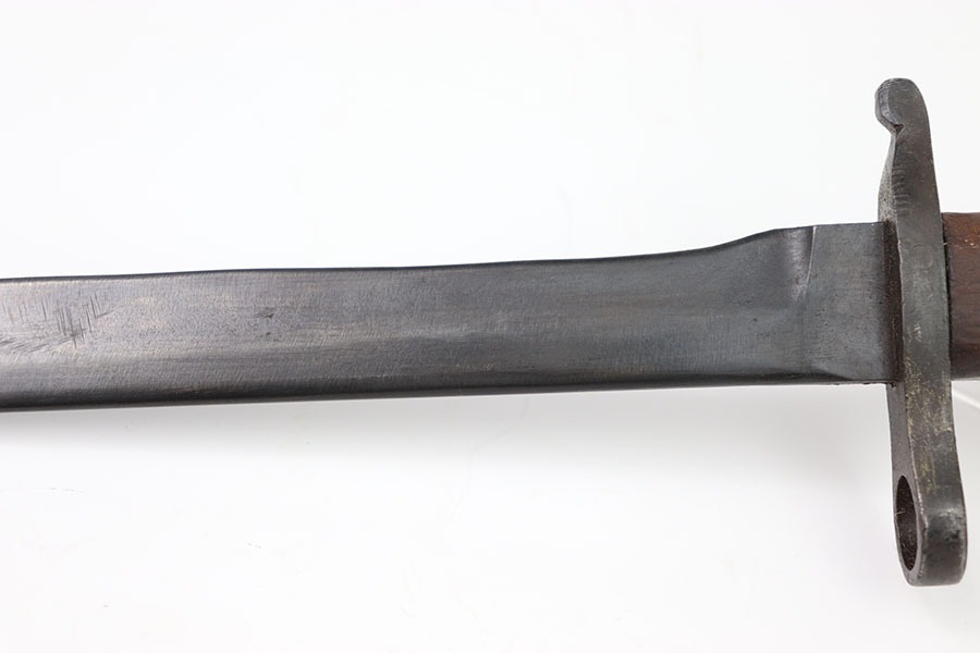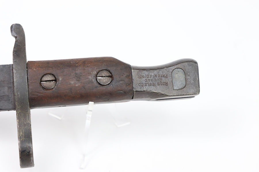 10/24/24 – This is a Canadian Ross Mk 2 Bayonet. The blade shows minor finish loss throughout with clean sharpening. The pommel and cross guard have some minor dings and spots of finish loss but no major issues. Writing on pommel reads Ross Rifle Québec Patented 1907. It appears one of the wood grips could have been replaced as it appears way newer with a different grain of wood. Overall great condition with a few minor issues otherwise a very neat bayonet. No scabbard included.