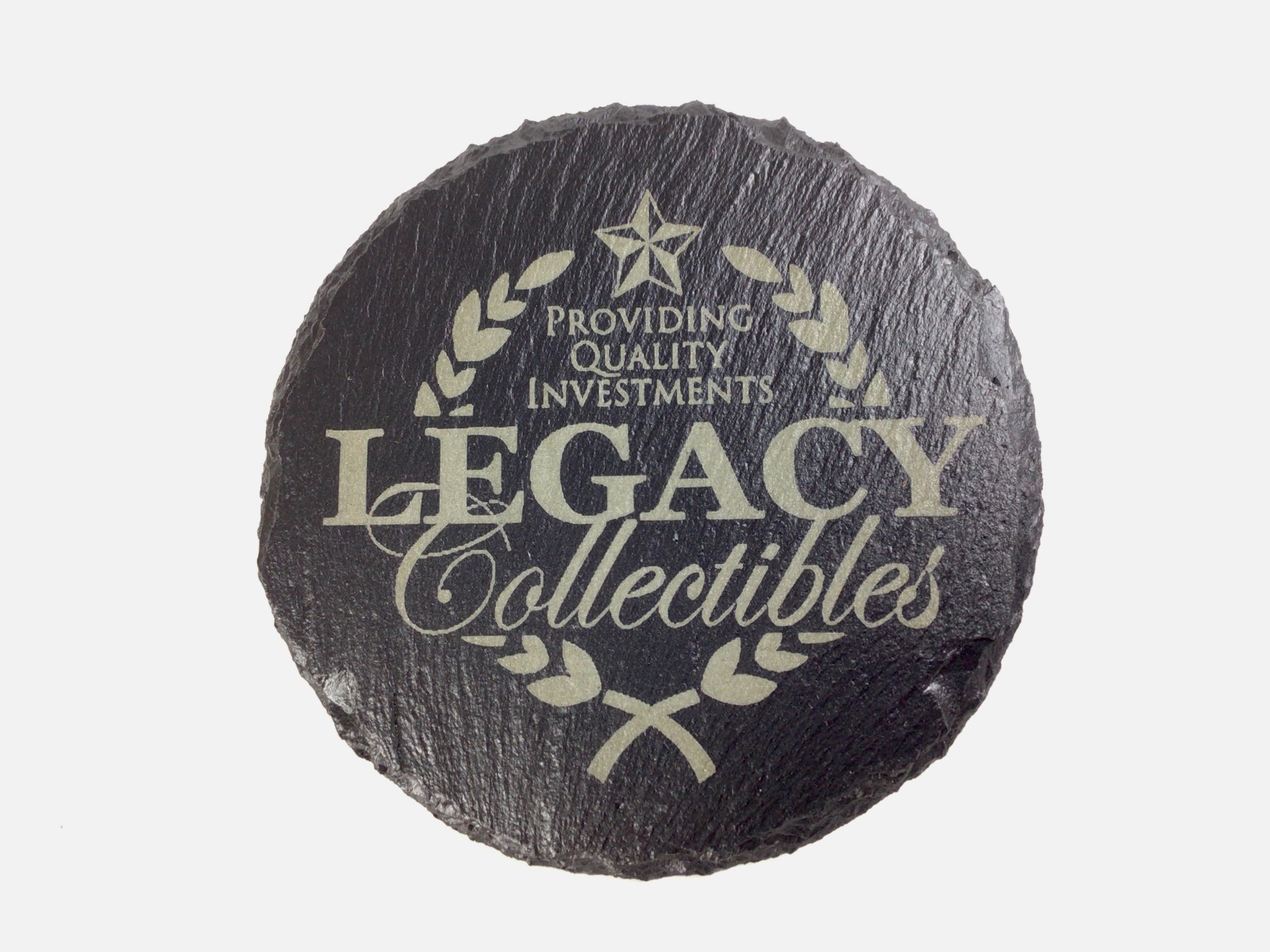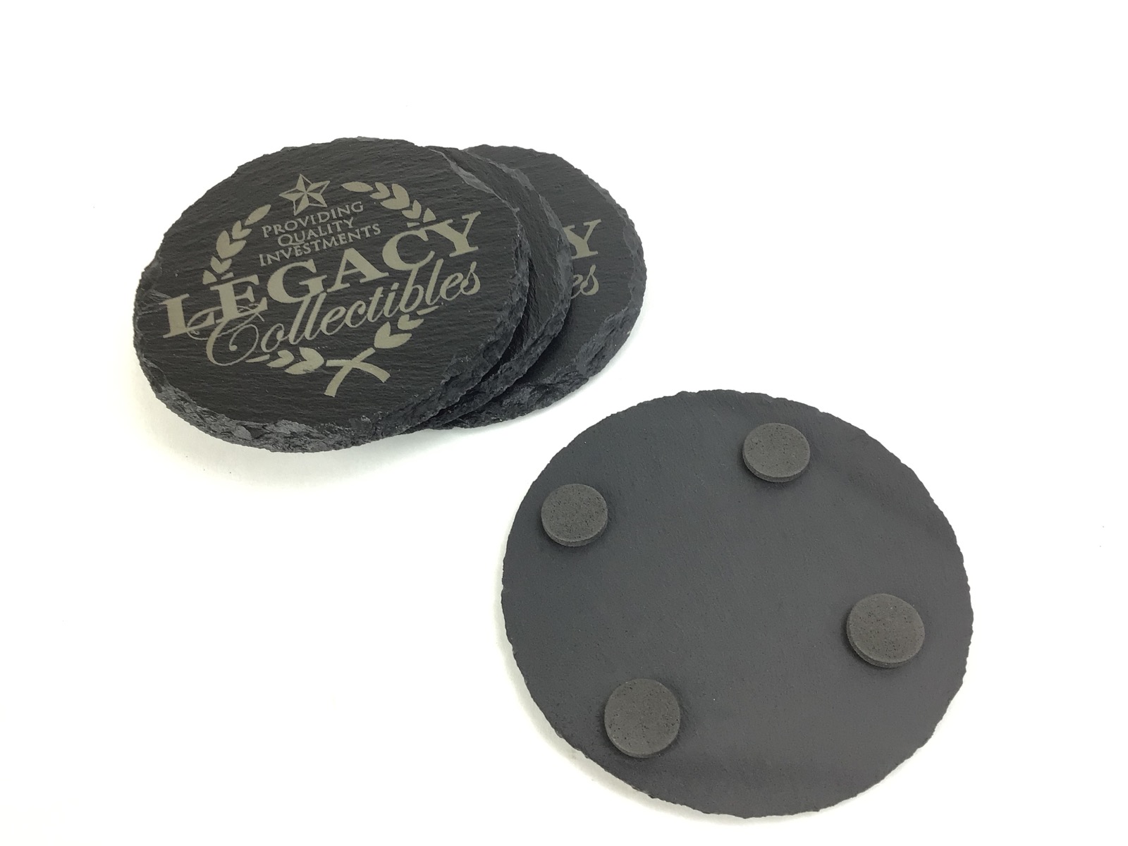 3/11/24 – Set of 4. Manufactured at our Ohio office. These sturdy, 4″ slate coasters are laser engraved with the your choice of manufacturer, or, Legacy Collectibles logo. Coated with a water proof finish featuring soft feet for placement on any surface.